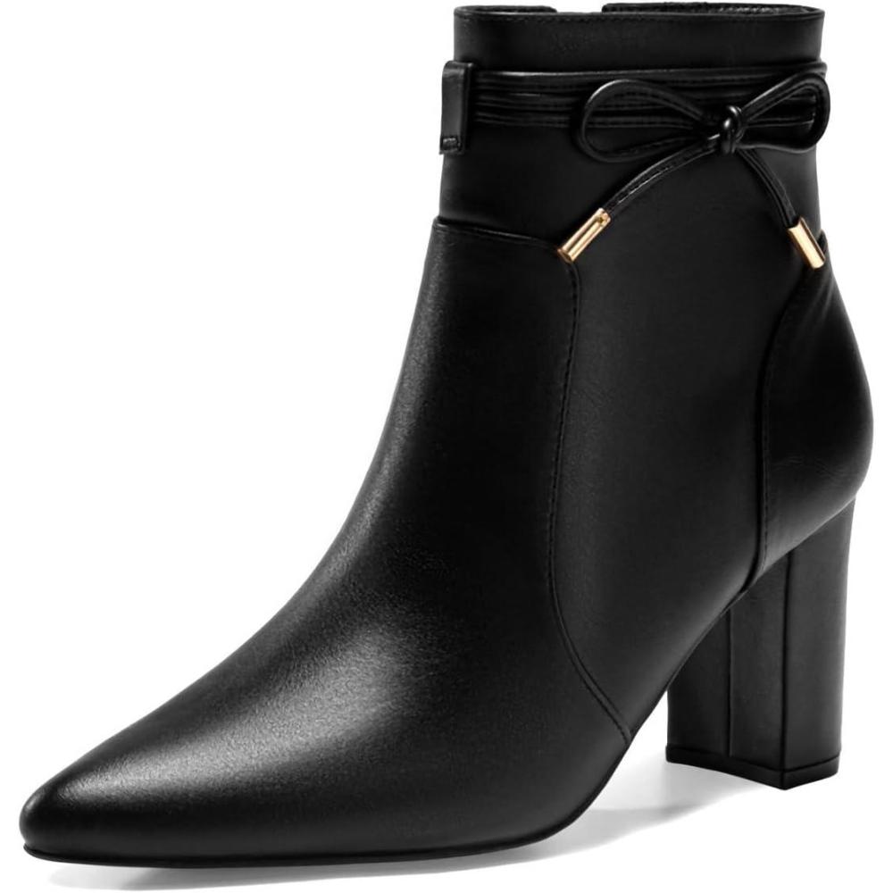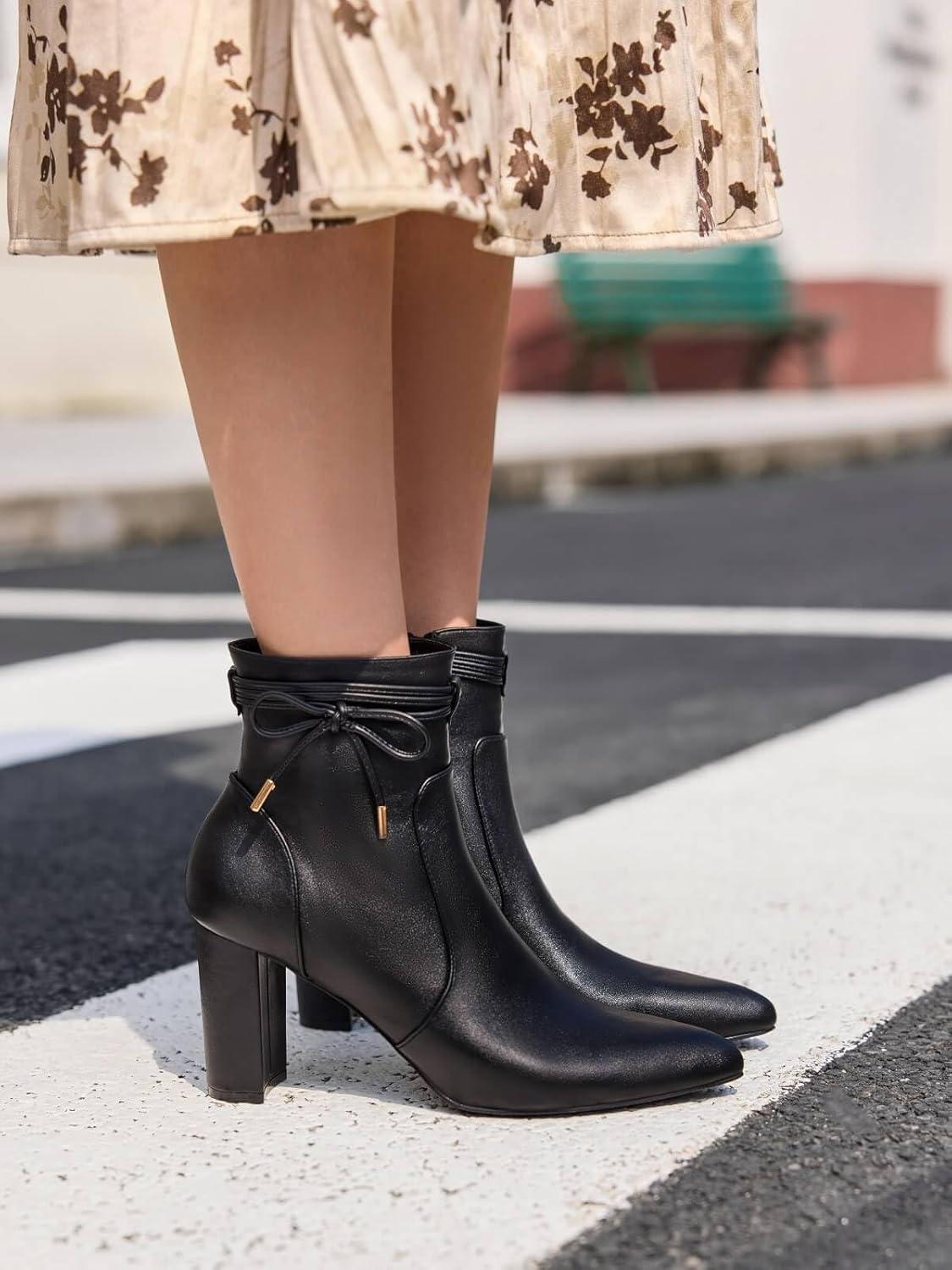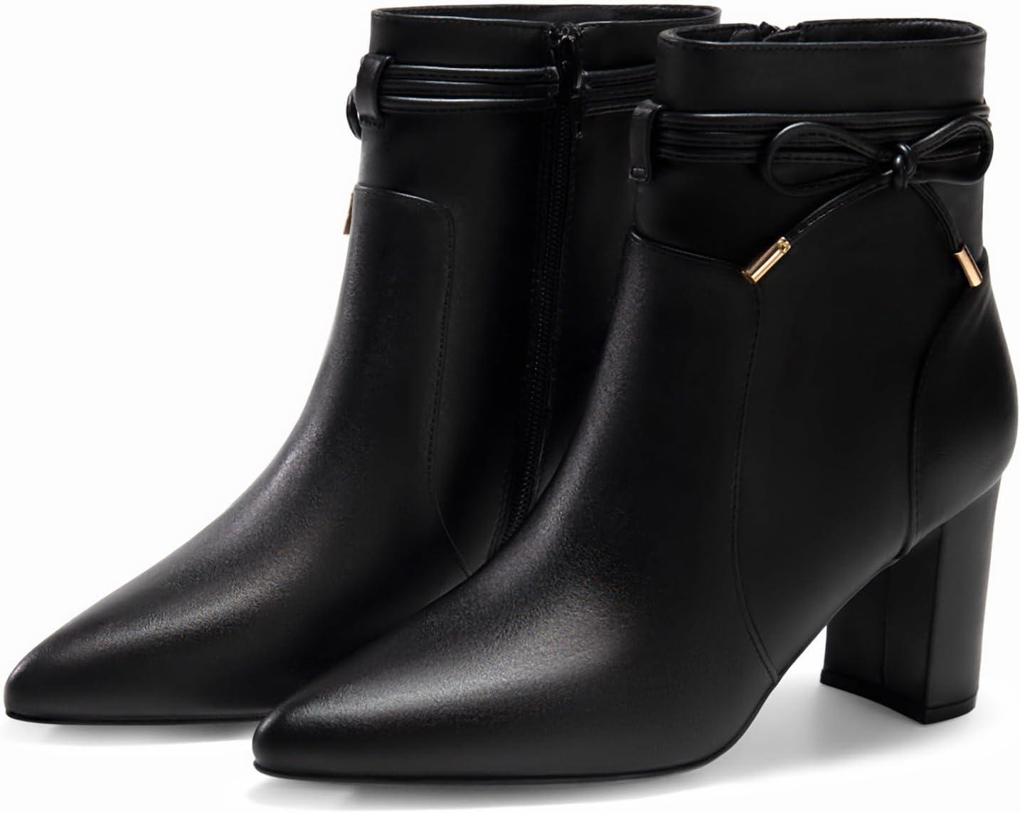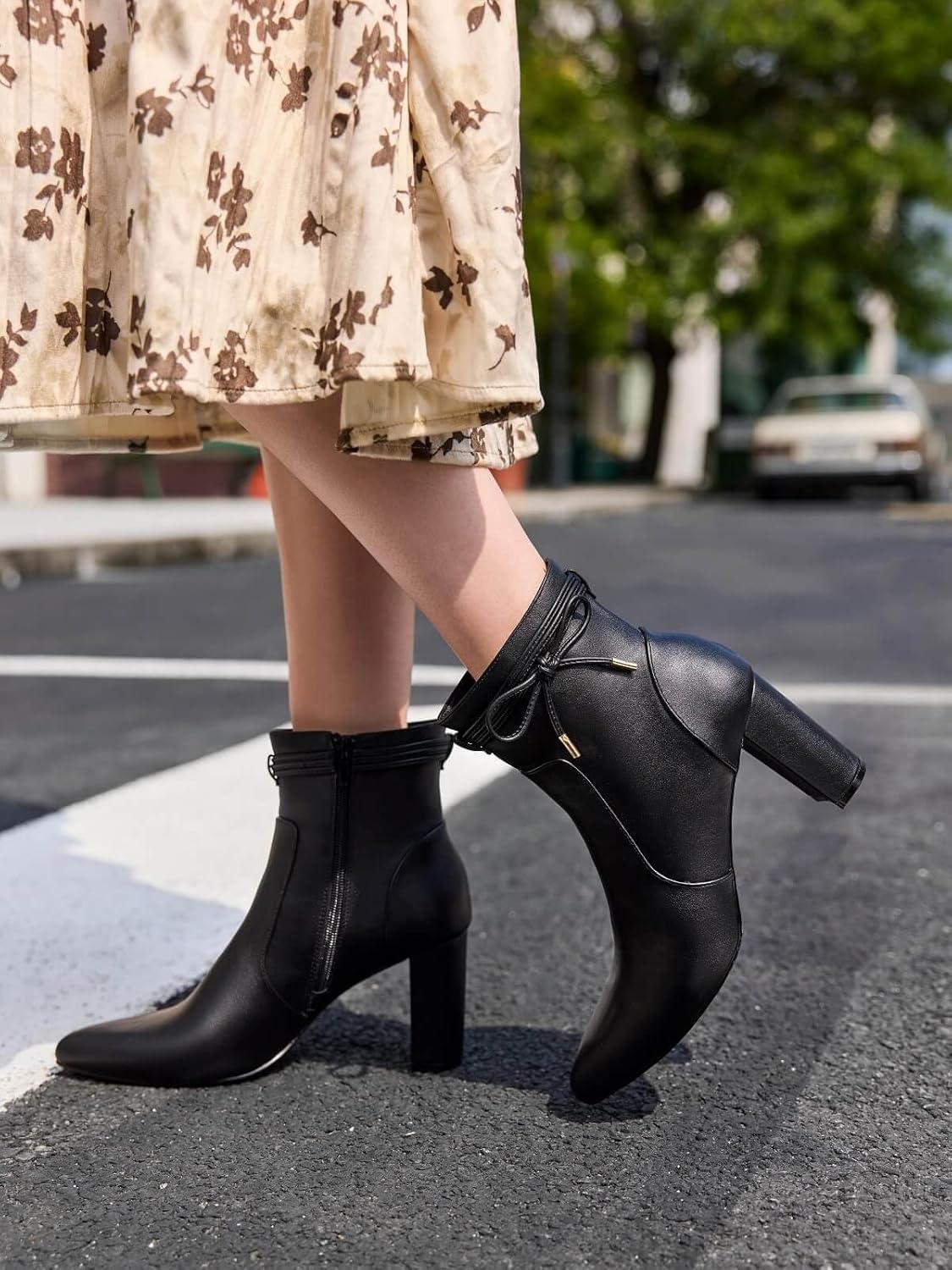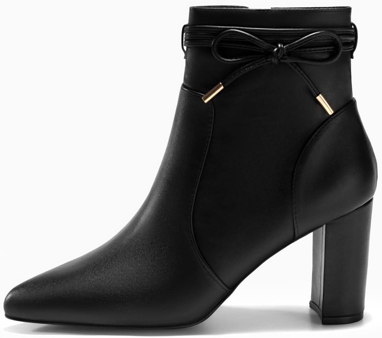 Coutgo Womens Pointed Toe Ankle Boots Chunky Block Heel Tie Knot Side Zipper Dressy Booties(Cool Black)