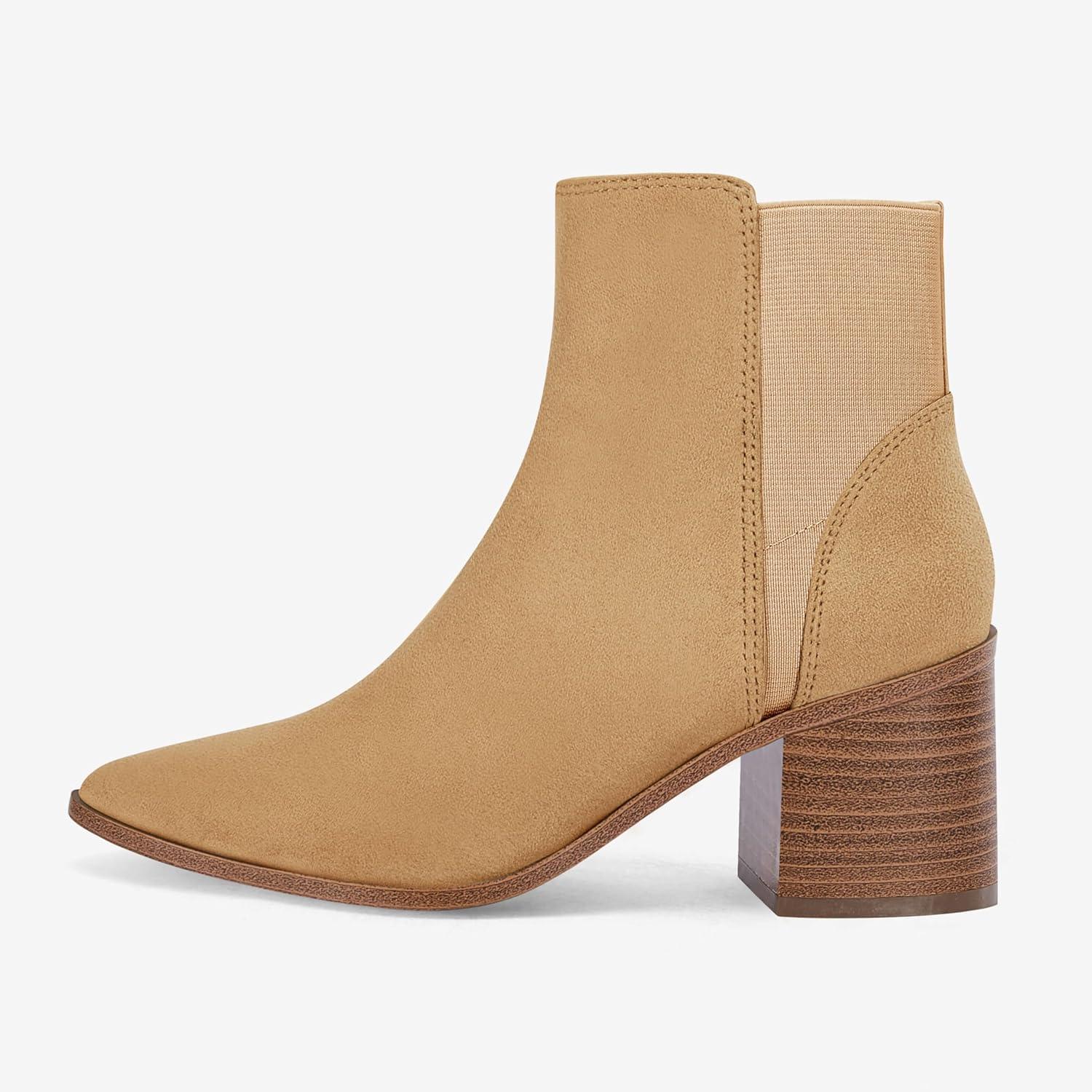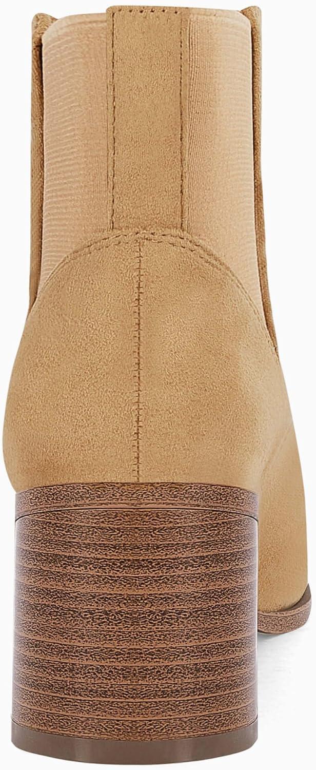 Coutgo Womens Pointed Toe Ankle Boots Elastic Chunky Block Stacked Mid Heel Slip On Chelsea Booties(Light Brown(suede))