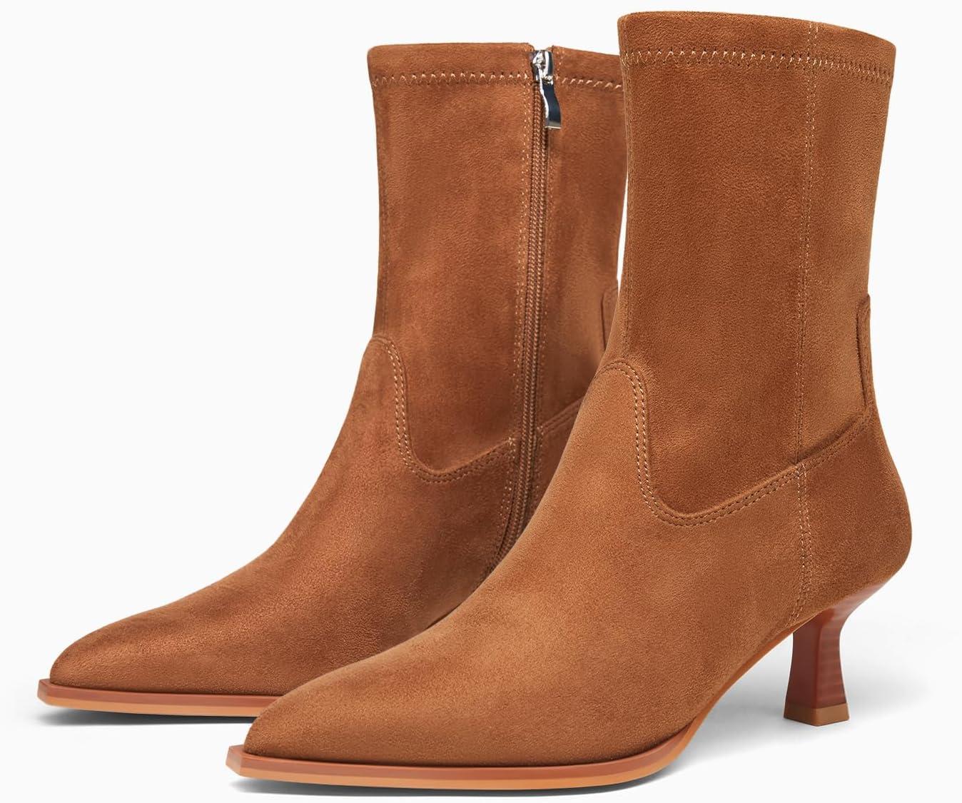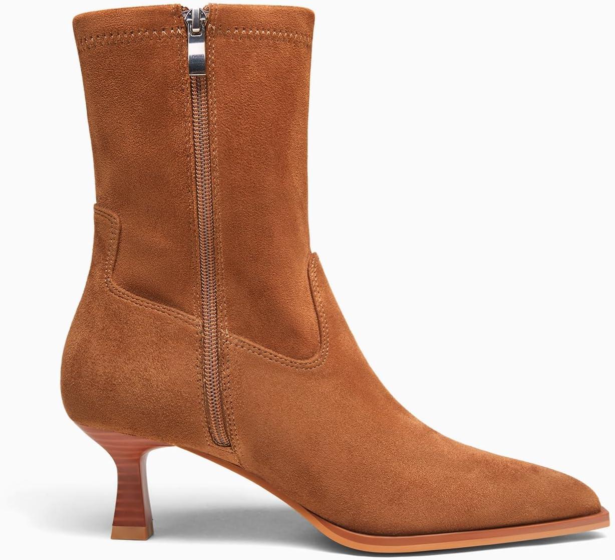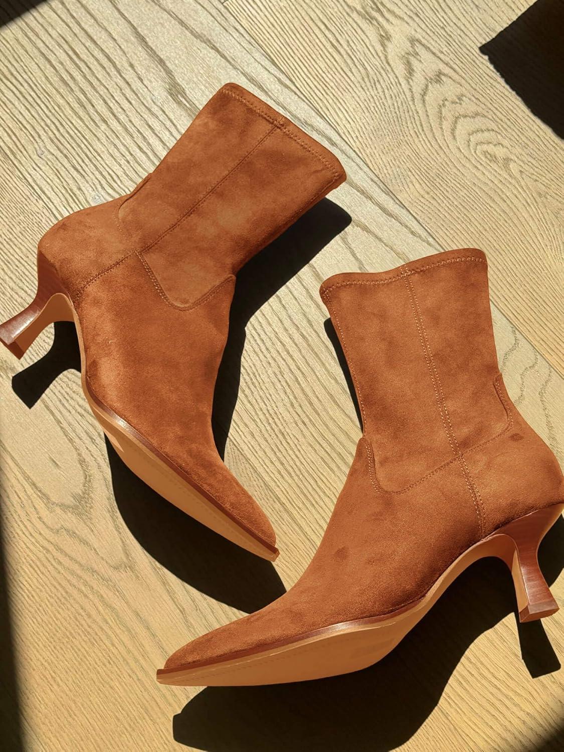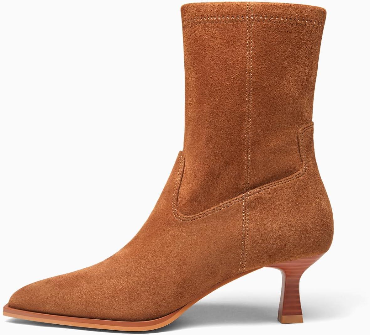Coutgo Womens Pointed Toe Ankle Boots Stacked Kitten Low Heel Side Zipper Fall Booties Shoes(Dark Brown Suede)