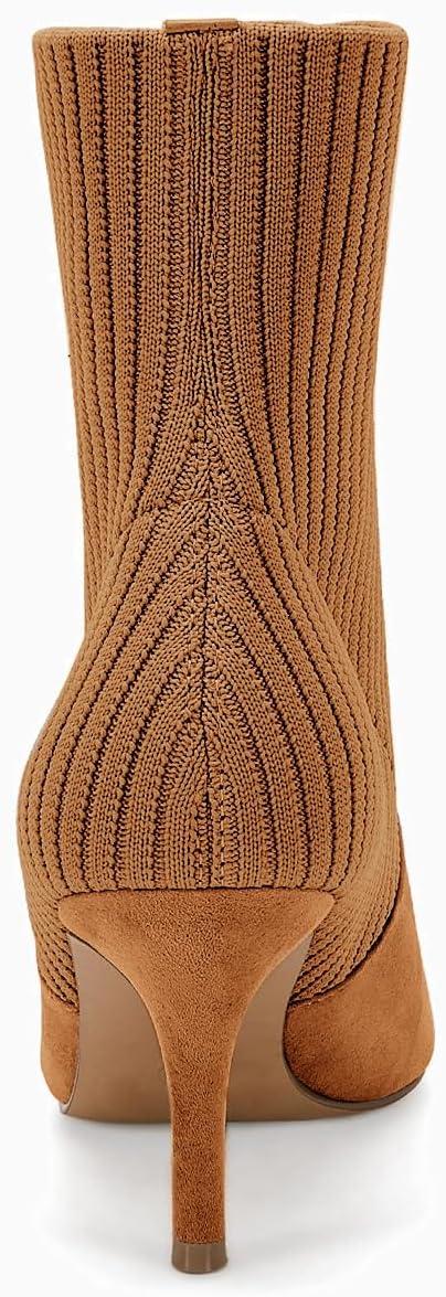 Coutgo Women’s Pointed Toe Ankle Boots Stiletto Kitten Heel Knit Faux Suede Winter Sock Booties(Light Brown Suede)