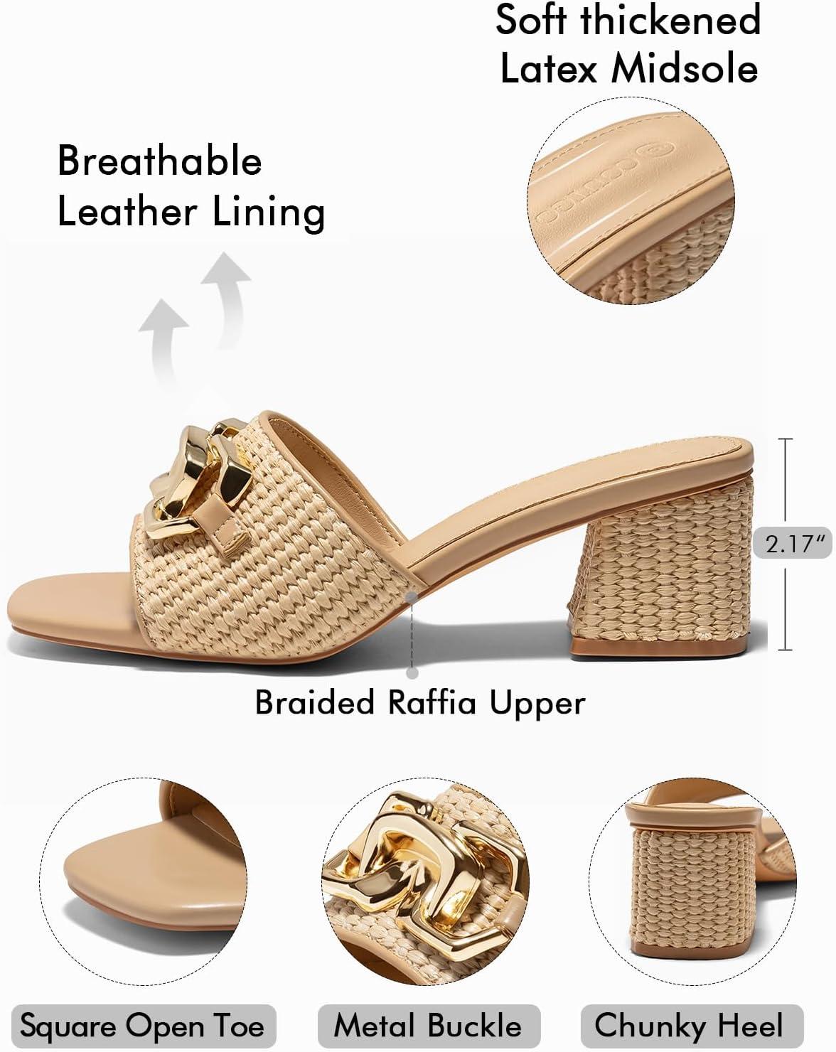 Coutgo Womens Raffia Slide Sandals Chunky Block Heeled Square Open Toe Metal Chain Slip on Mules Dressy Shoes(Khaki)