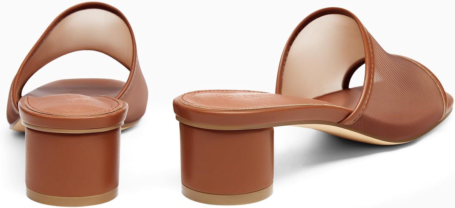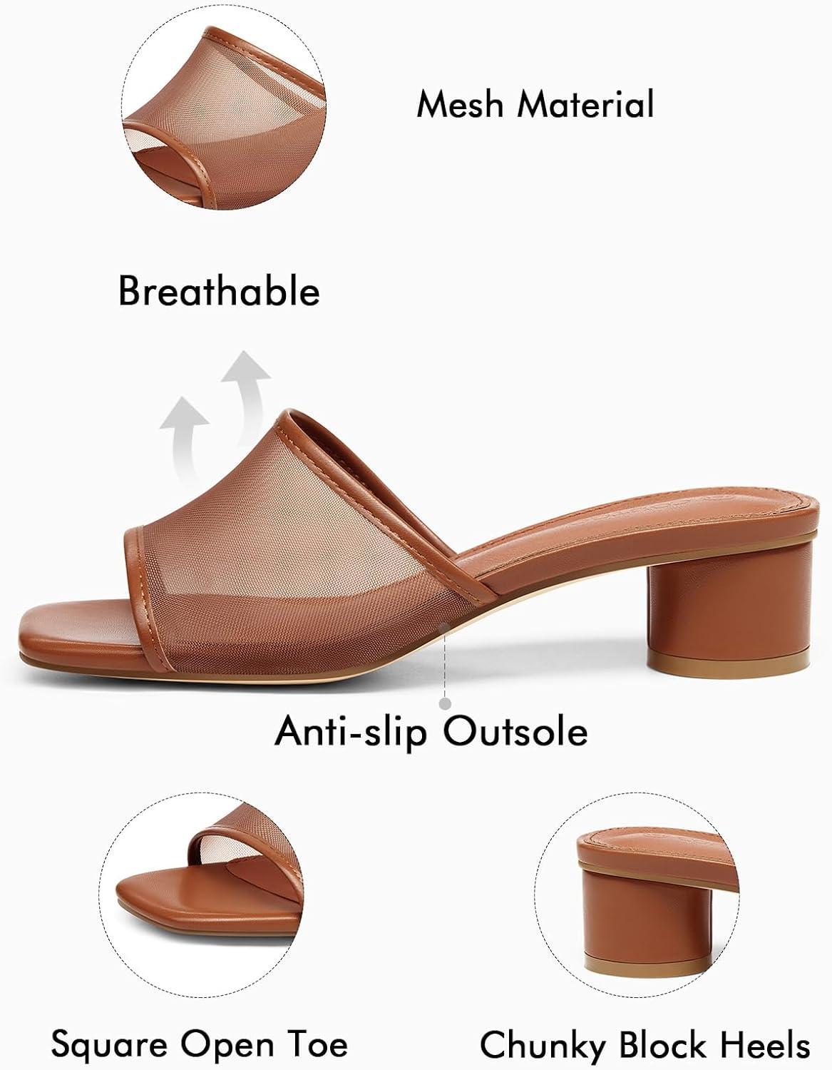 Coutgo Womens Slide Sandals Mesh Chunky Heels Mules Square Open Toe Slip On Summer Dress Shoes(Brown)
