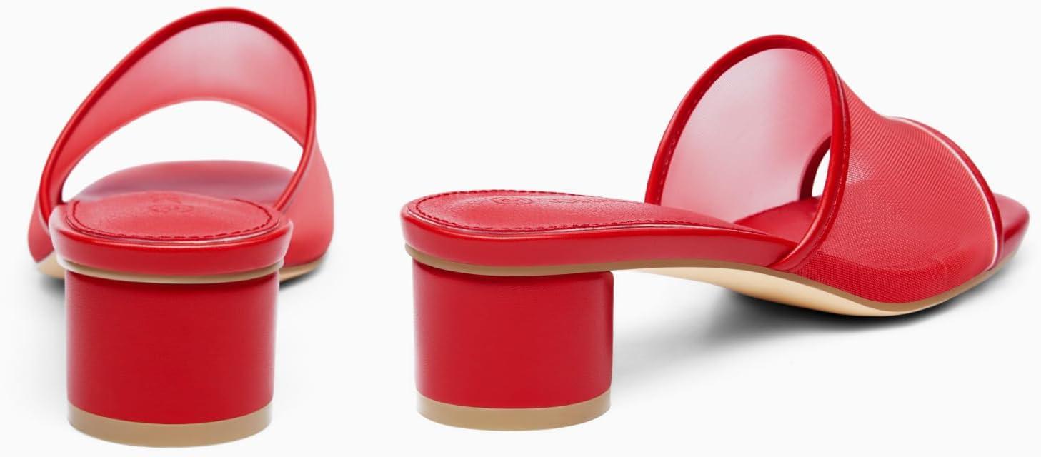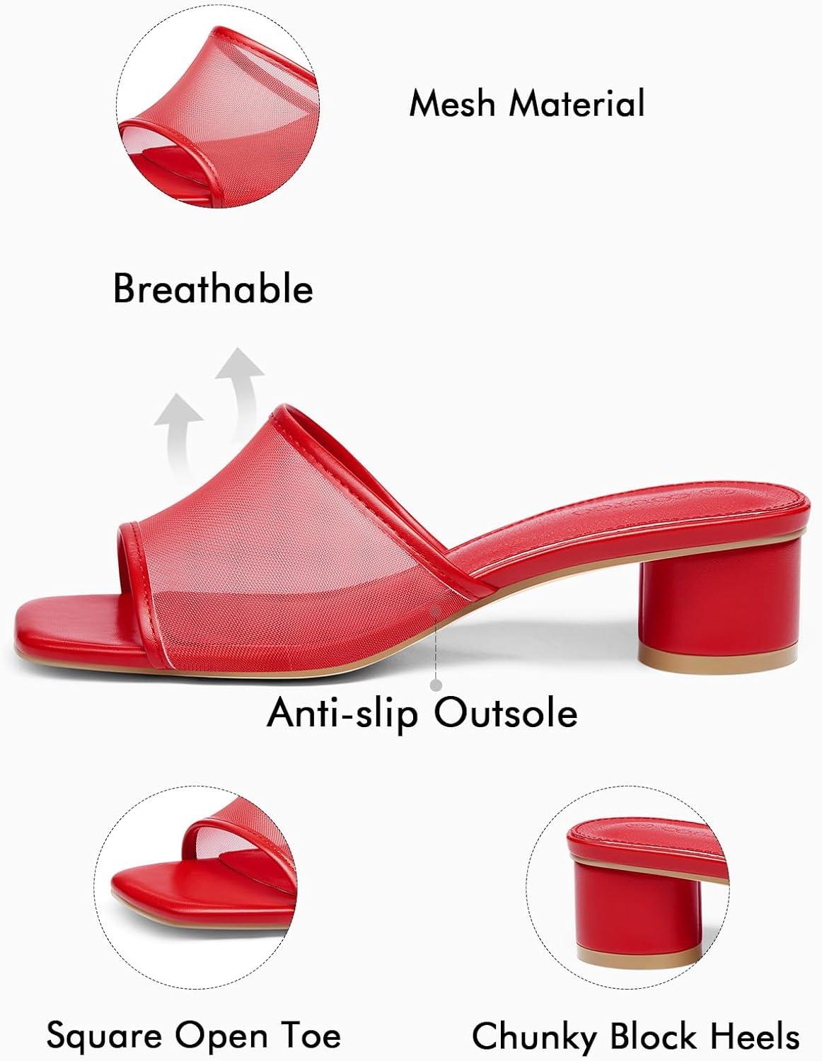 Coutgo Womens Slide Sandals Mesh Chunky Heels Mules Square Open Toe Slip On Summer Dress Shoes(Red)