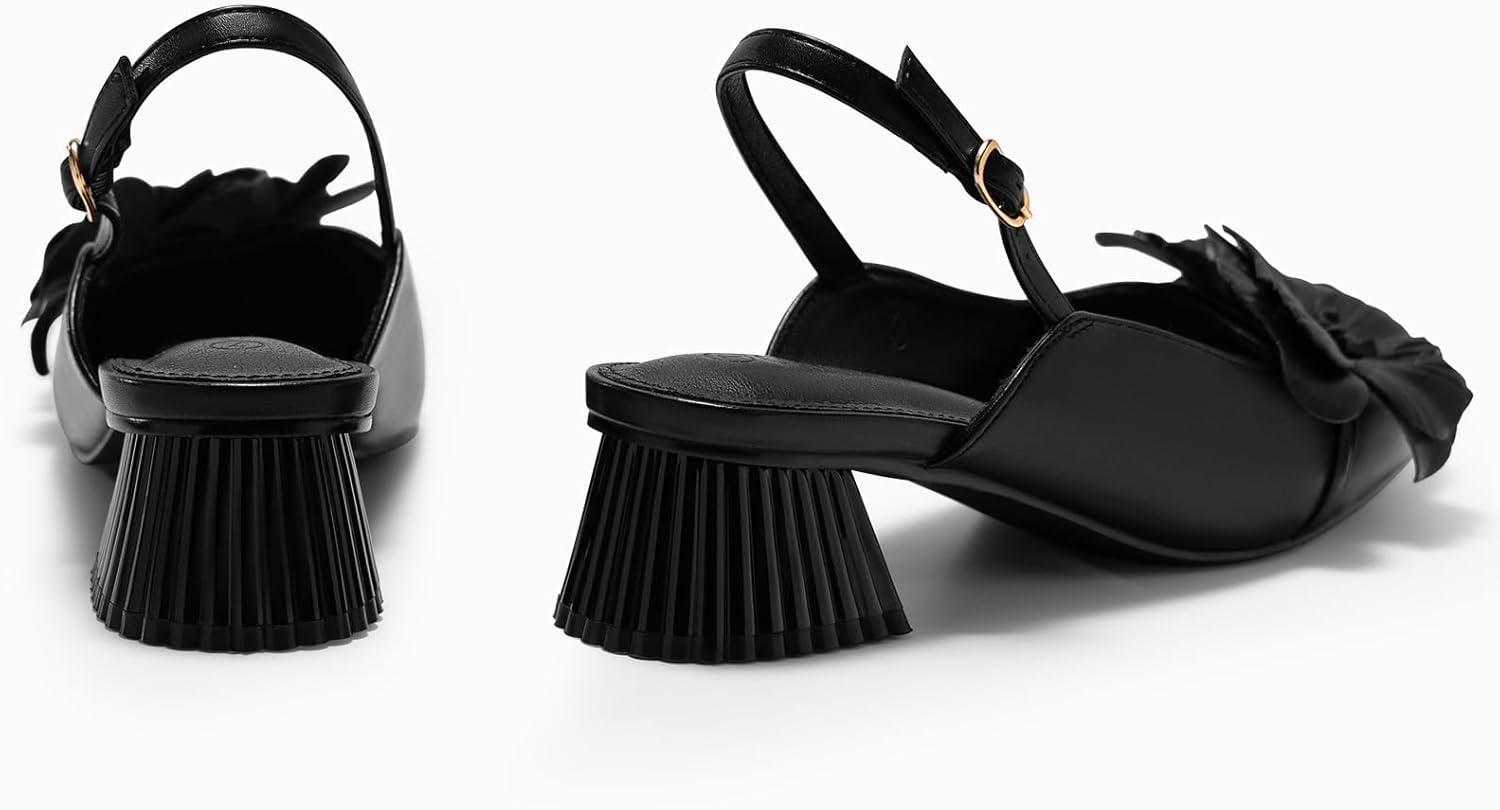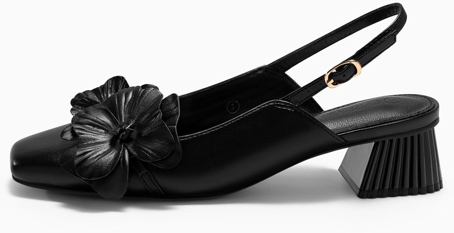 Coutgo Womens Slingback Chunky Heels Flower Closed Square Toe Pumps Work Dress Shoes(Black)