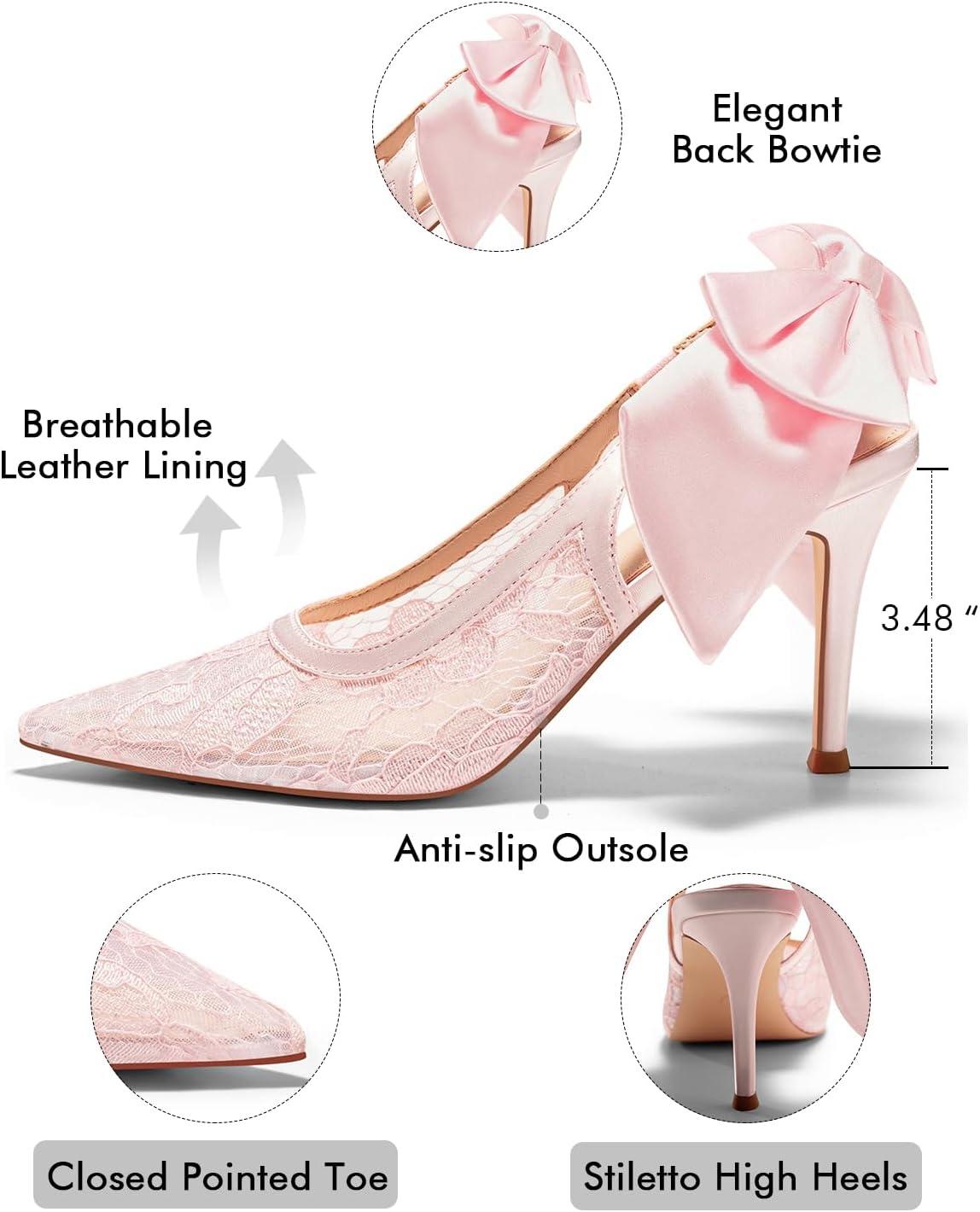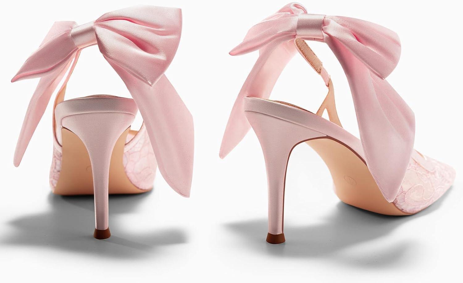 Coutgo Womens Slingback High Heels Bow Closed Pointed Toe Lace Patchwork Party Dress Shoes(Mesh Pink)