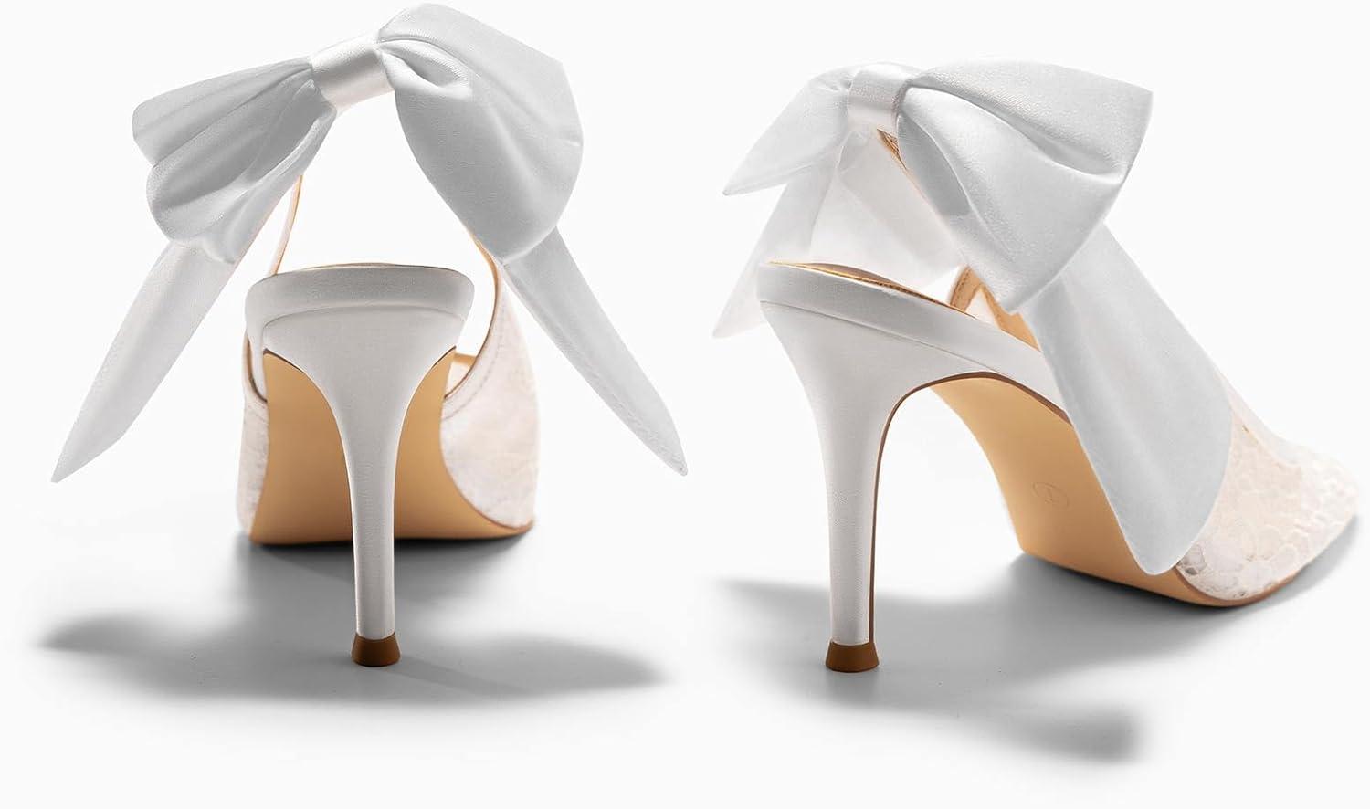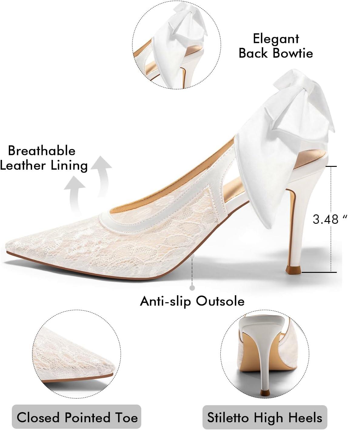Coutgo Womens Slingback High Heels Bow Closed Pointed Toe Lace Patchwork Party Dress Shoes(Mesh White)
