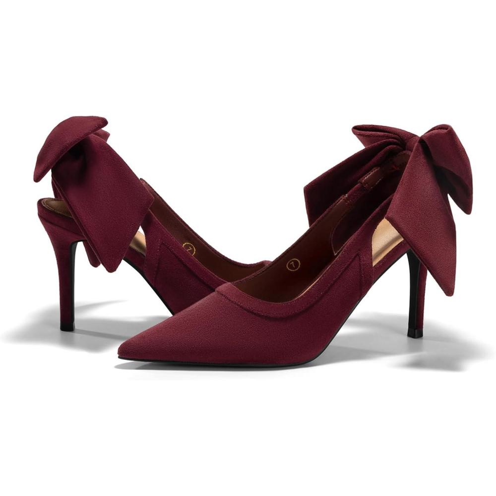 Coutgo Womens Slingback High Heels Bow Closed Pointed Toe Lace Patchwork Party Dress Shoes(Suede Wine Red)