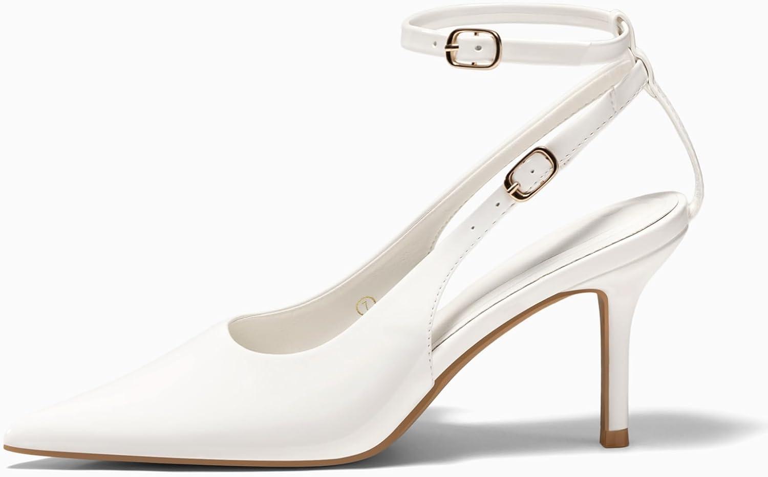 Coutgo Womens Slingback High Heels Closed Pointed Toe Pumps Ankle Strap Work Dress Shoes(White)