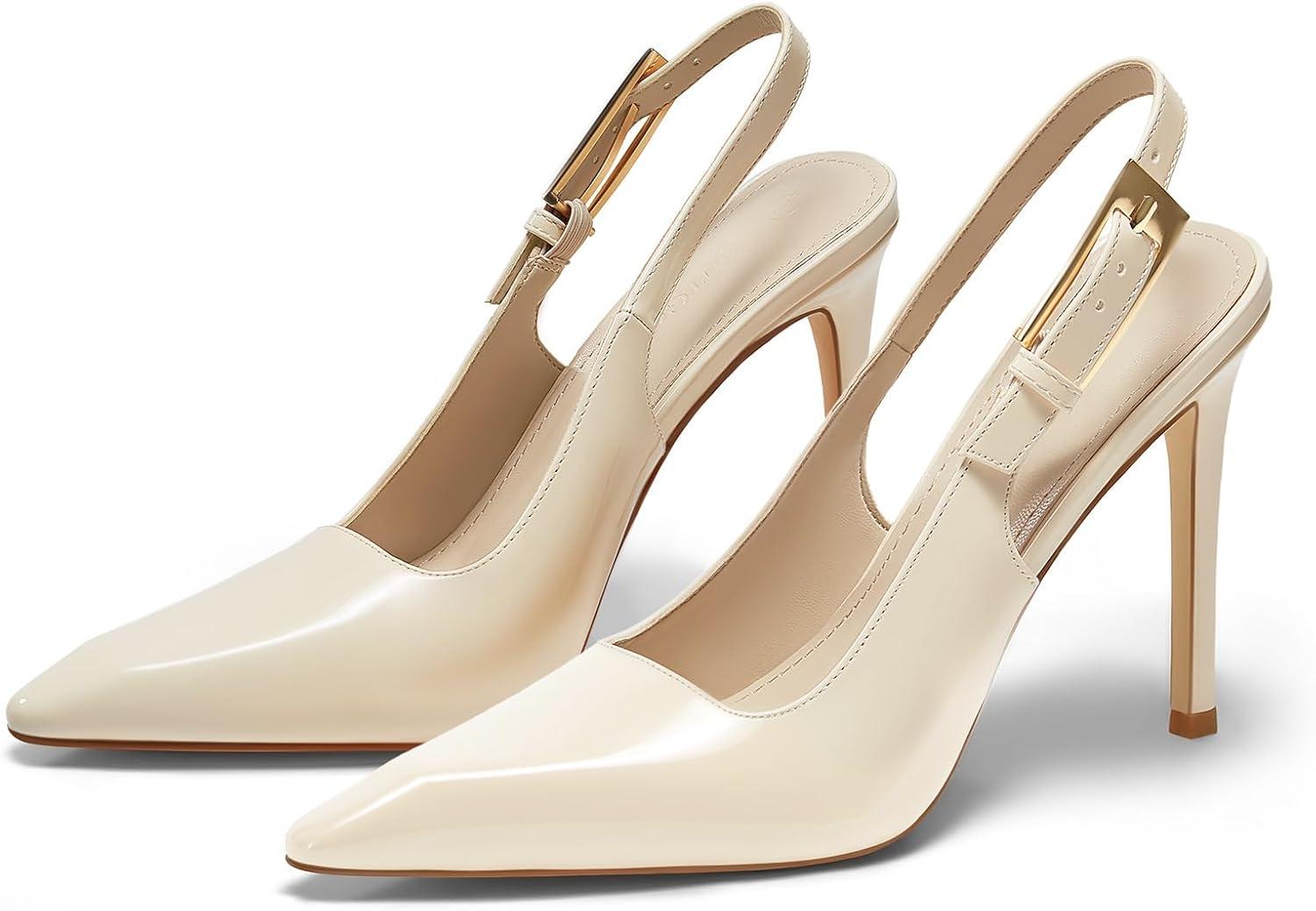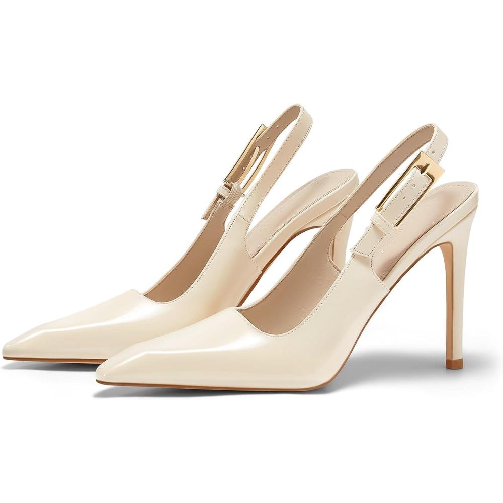 Coutgo Women’s Slingback High Heels Pointed Toe Stilettos Metal Buckle Dress Party Pump Shoes(Creamy White)