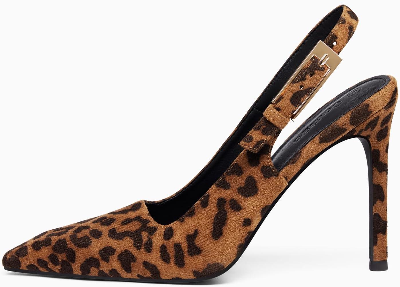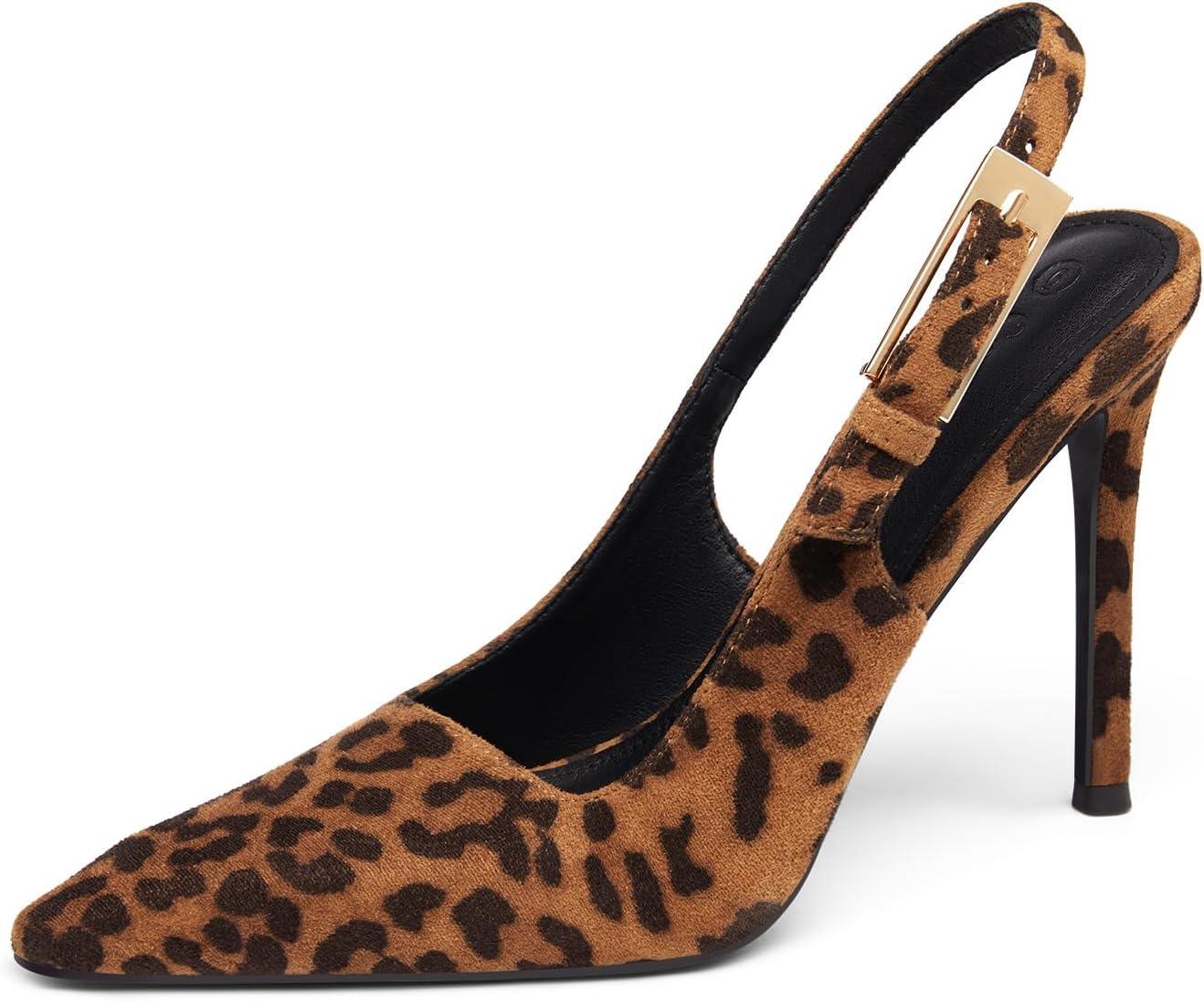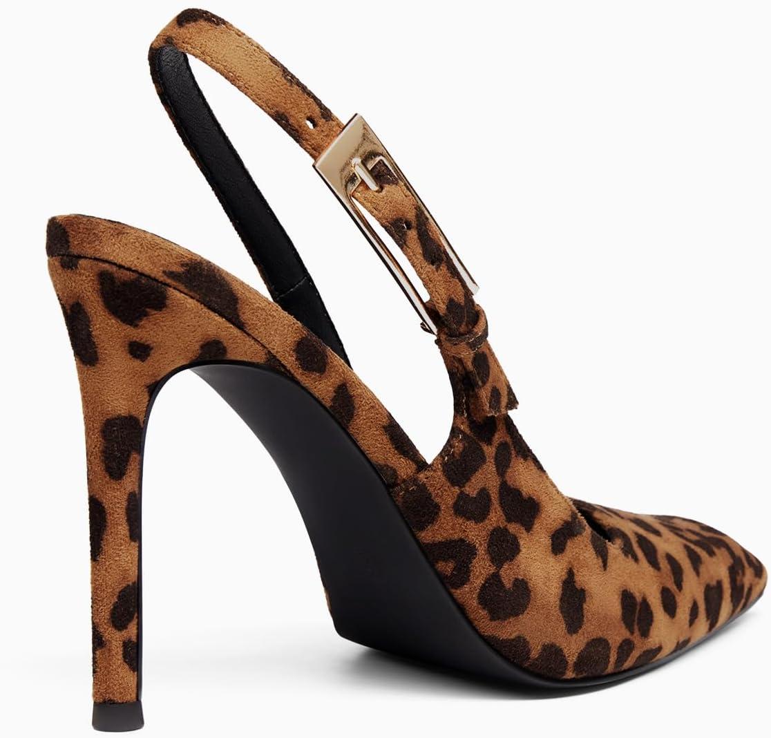 Coutgo Women’s Slingback High Heels Pointed Toe Stilettos Metal Buckle Dress Party Pump Shoes(Leopard)