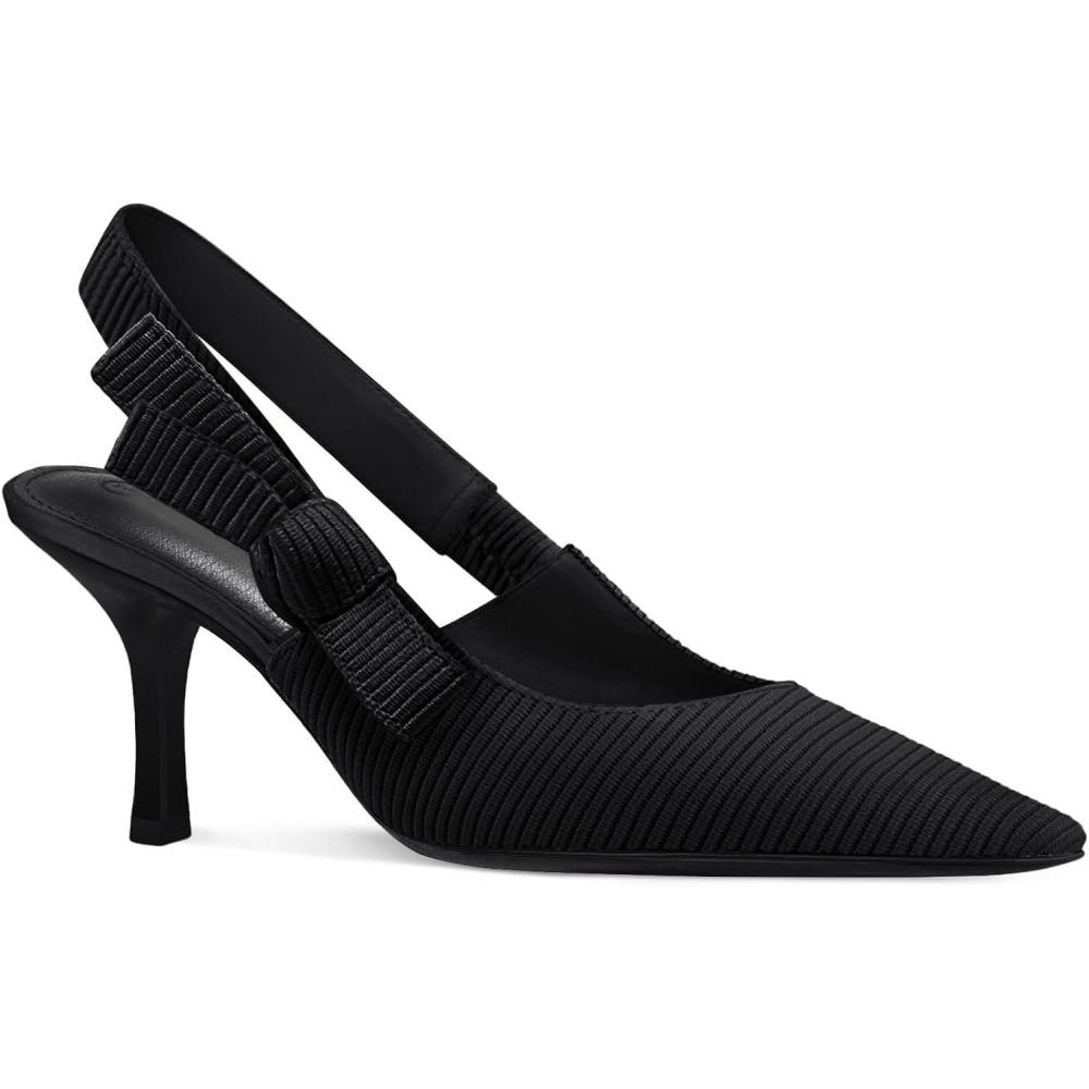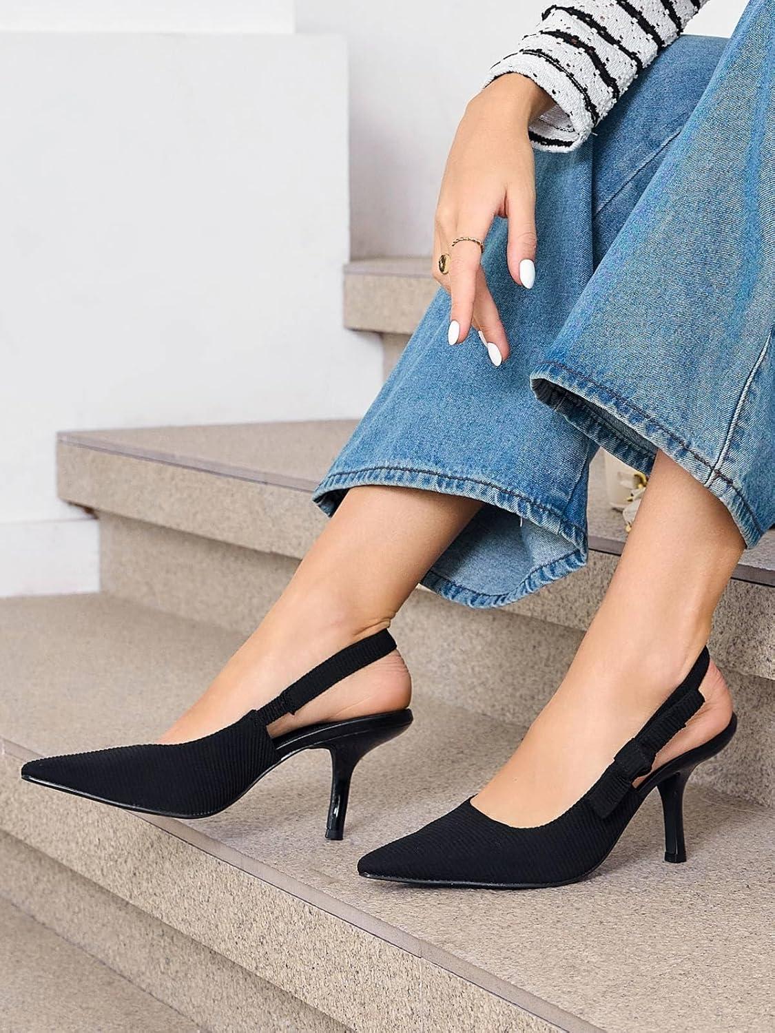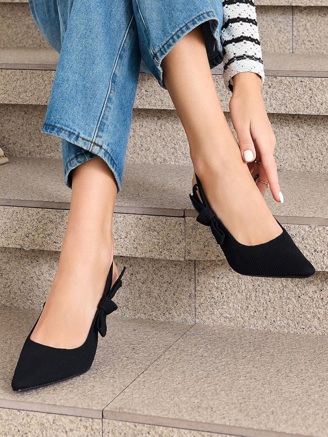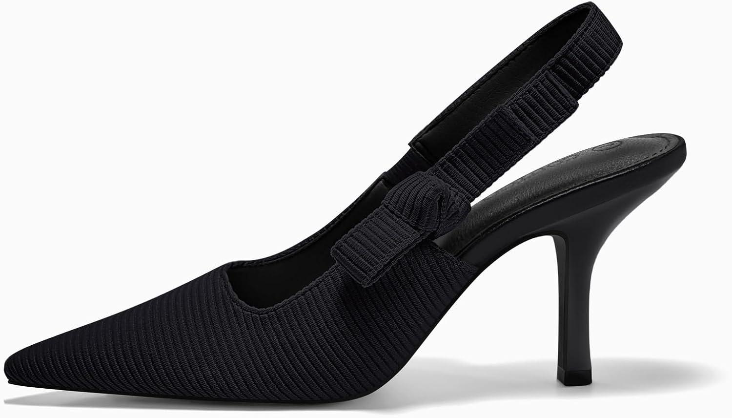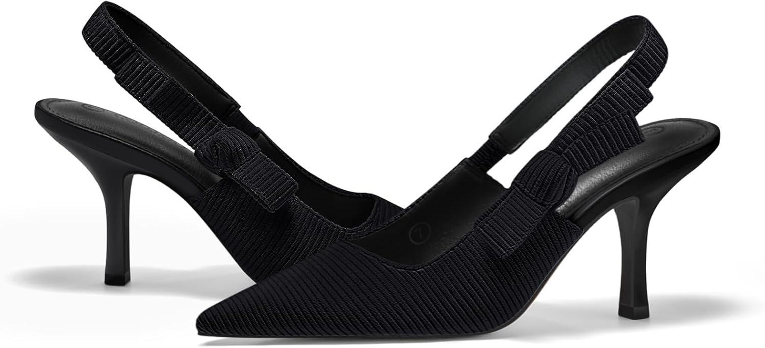 Coutgo Womens Slingback Kitten Heels Closed Pointed Toe Bowknot Knitted Slip On Work Pumps Dress Shoes(Black(high Heels))