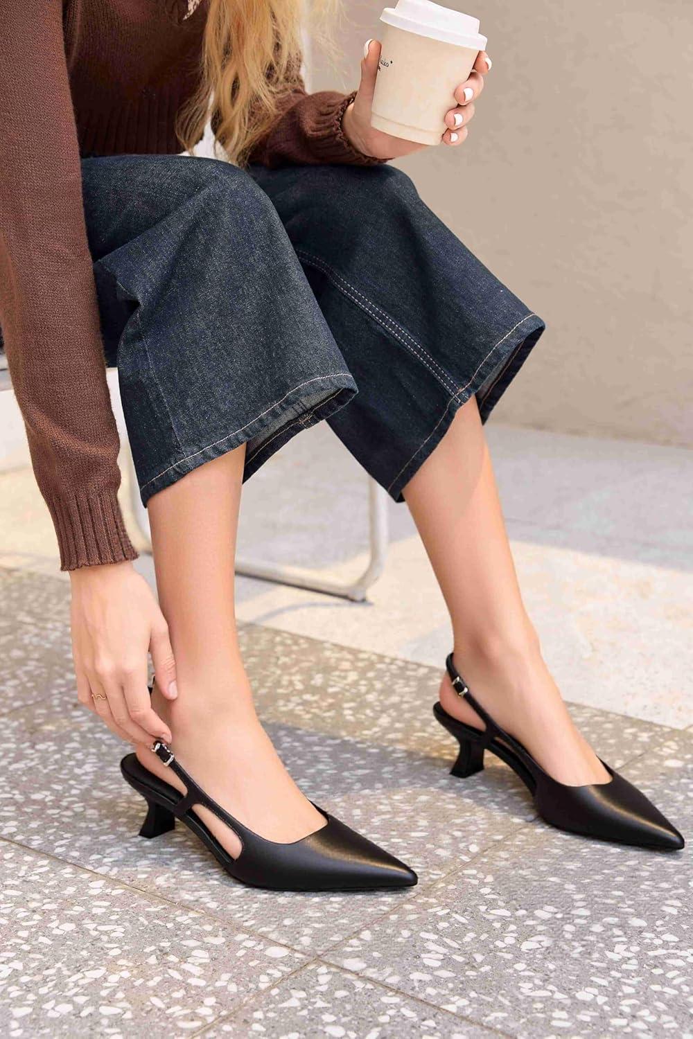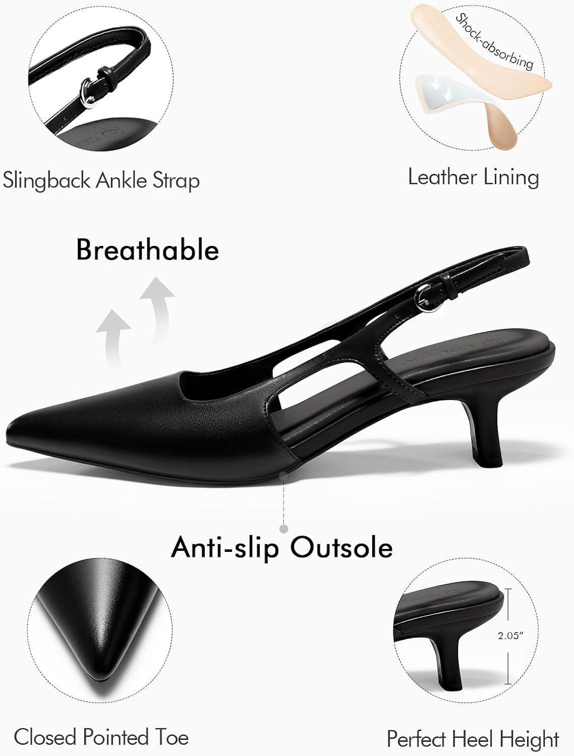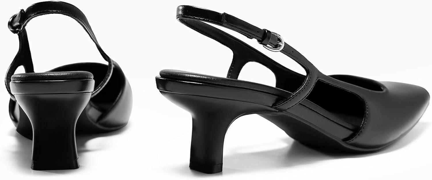 Coutgo Womens Slingback Kitten Heels Closed Pointed Toe Pumps Ankle Strap Work Dress Shoes(Black)