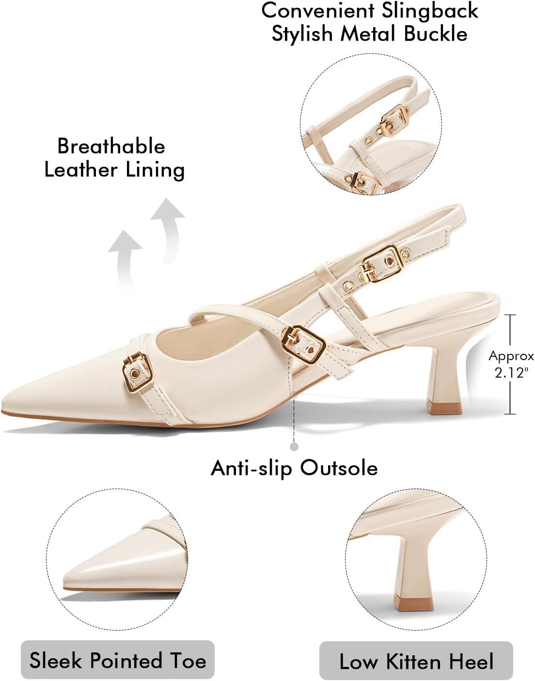 Coutgo Womens Slingback Kitten Heels Low Heel Closed Pointed Toe Pumps Buckle Strap Heeled Sandals Shoes(Beige)