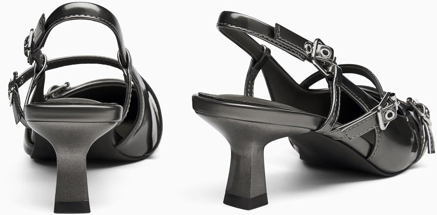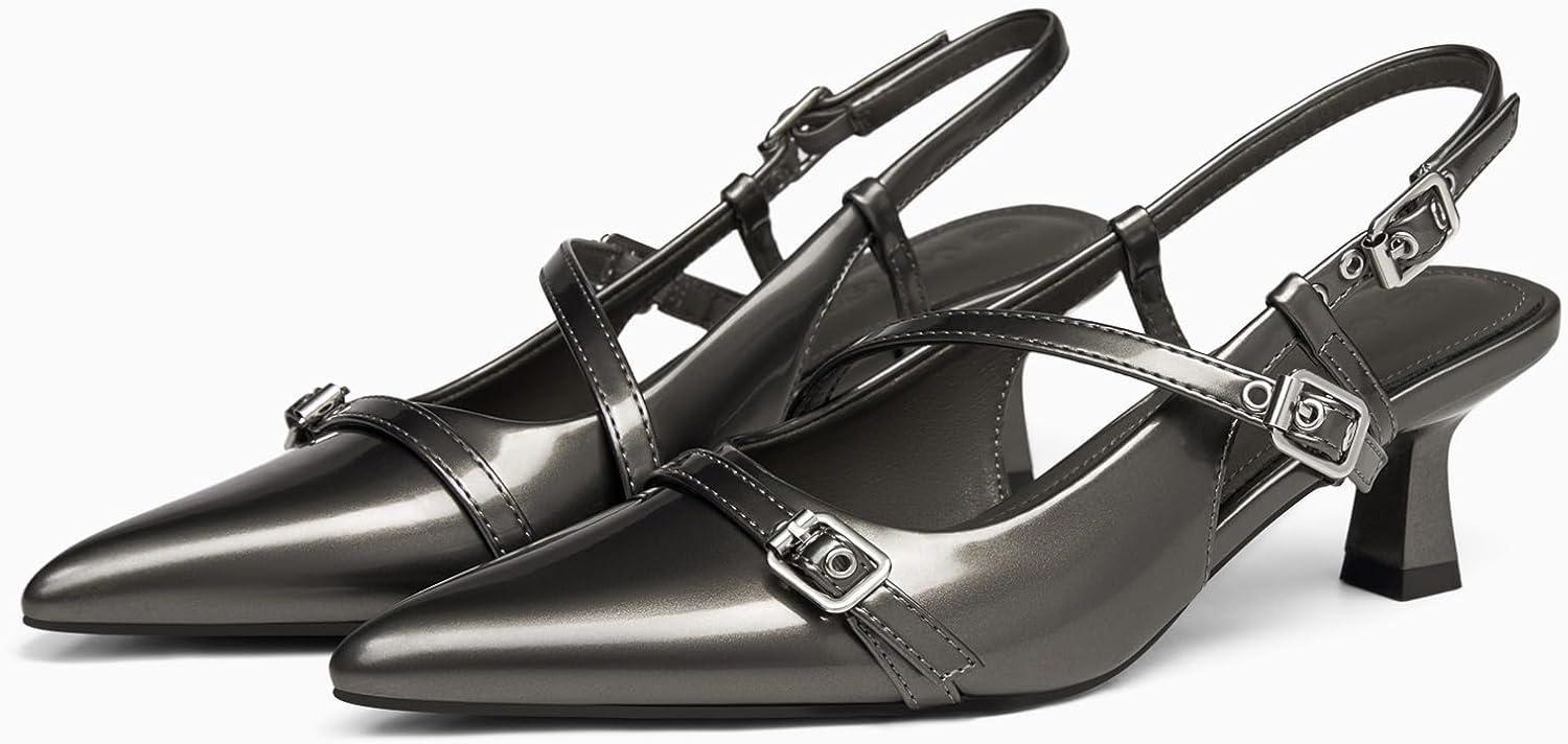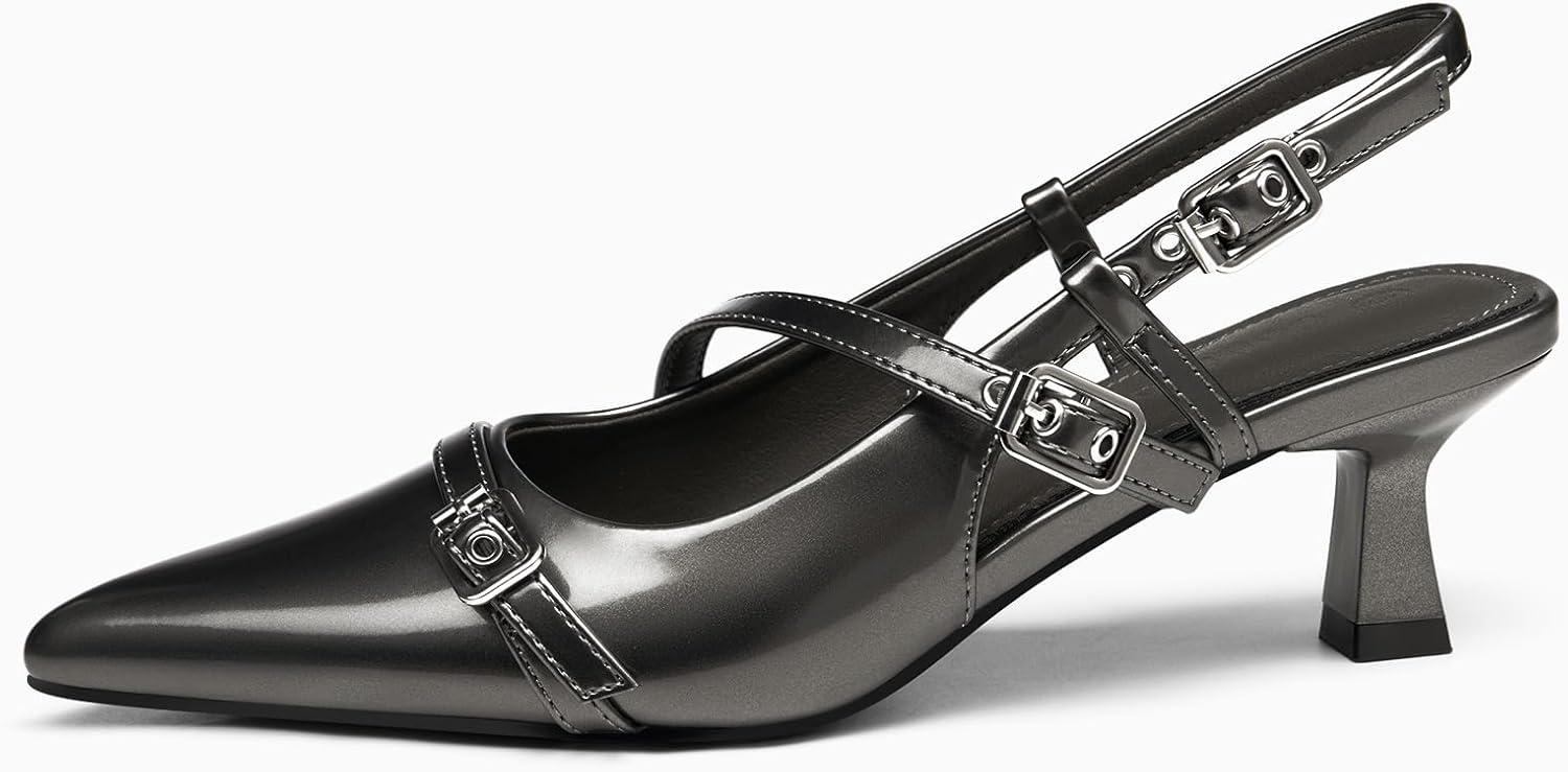 Coutgo Womens Slingback Kitten Heels Low Heel Closed Pointed Toe Pumps Buckle Strap Heeled Sandals Shoes(Dark Grey)