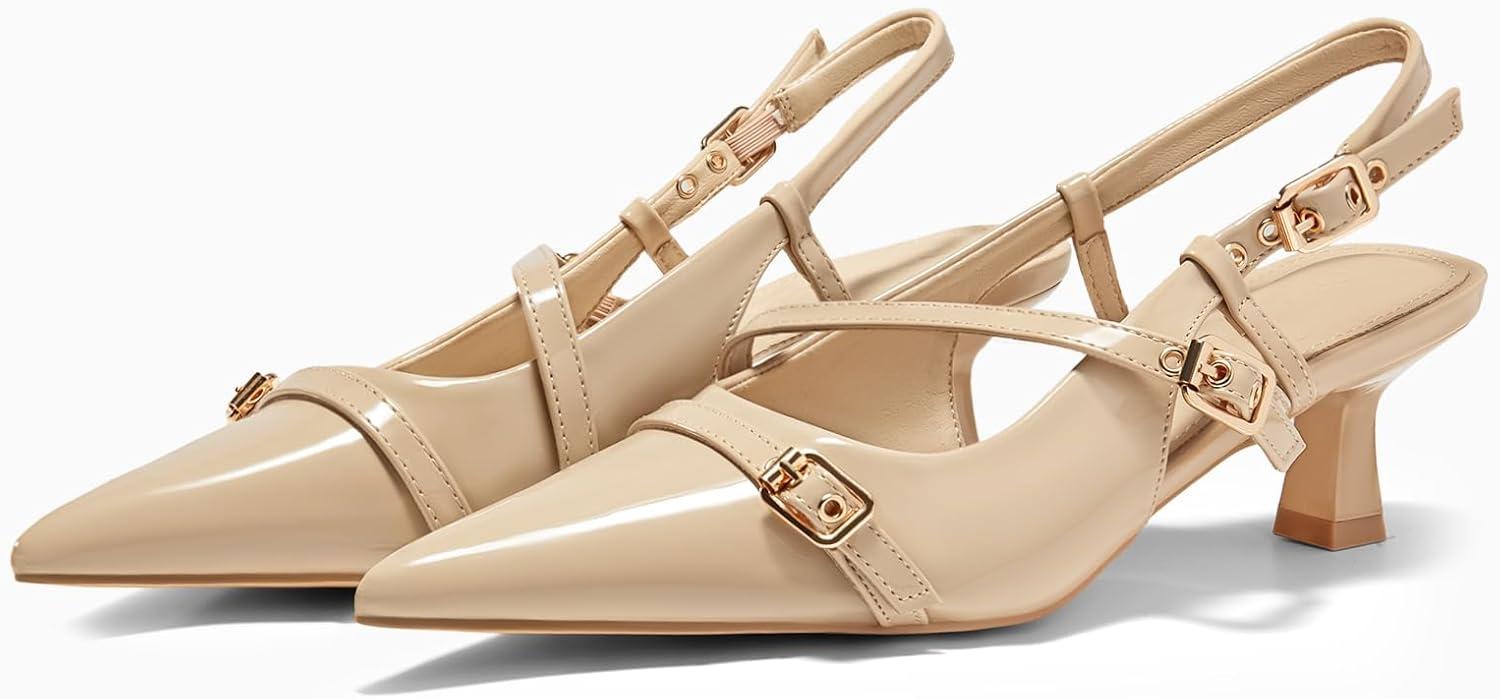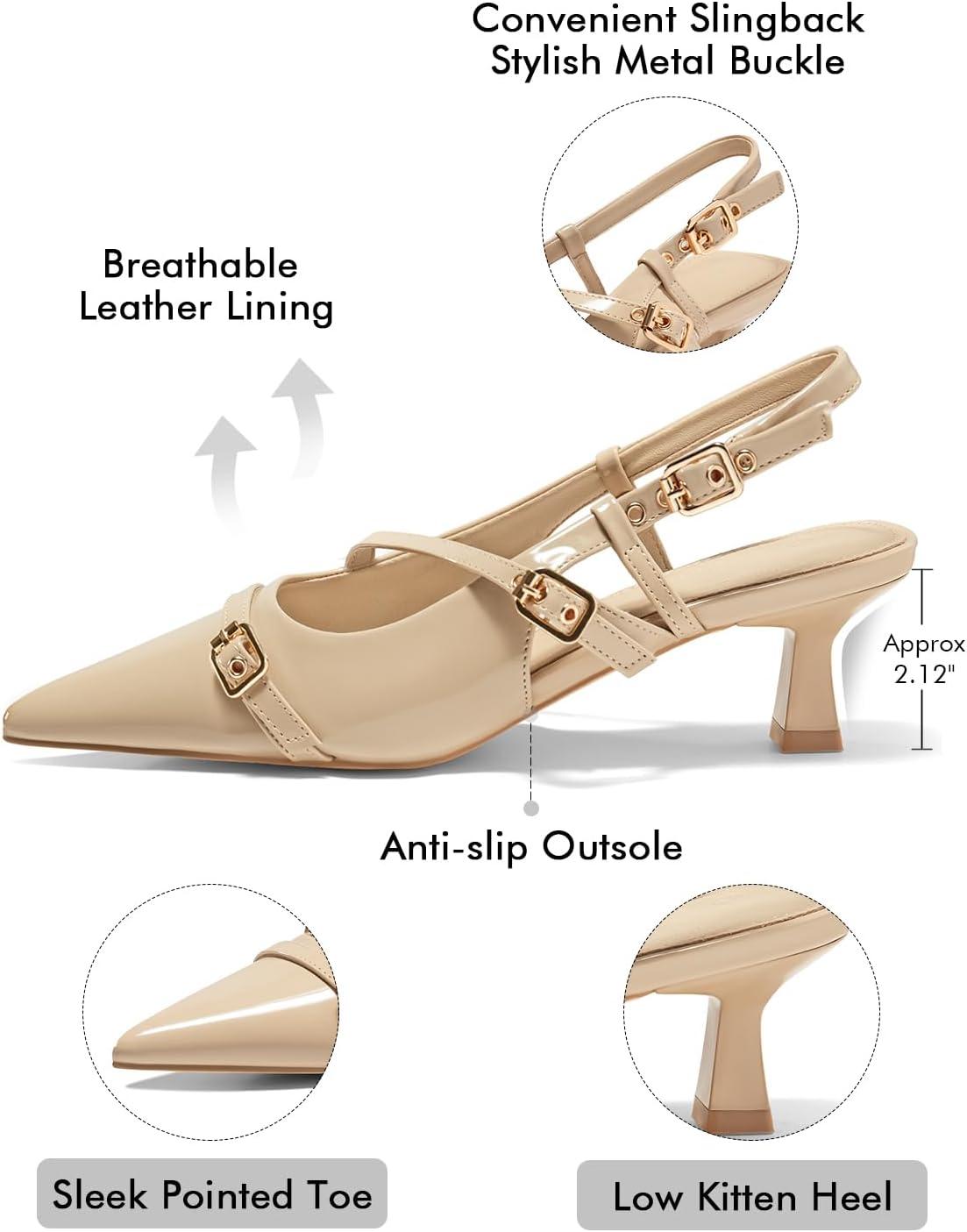 Coutgo Womens Slingback Kitten Heels Low Heel Closed Pointed Toe Pumps Buckle Strap Heeled Sandals Shoes(Khaki)