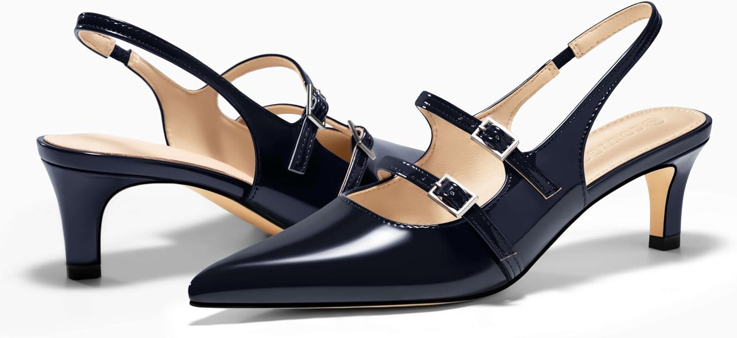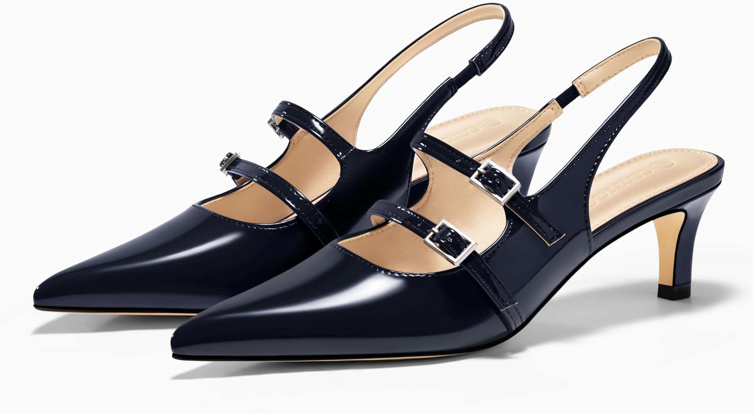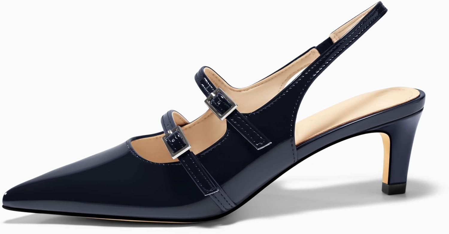 Coutgo Womens Slingback Kitten Heels Mary Jane Pumps Closed Pointed Toe Buckle Strap Wedding Dress Shoes(Navy)