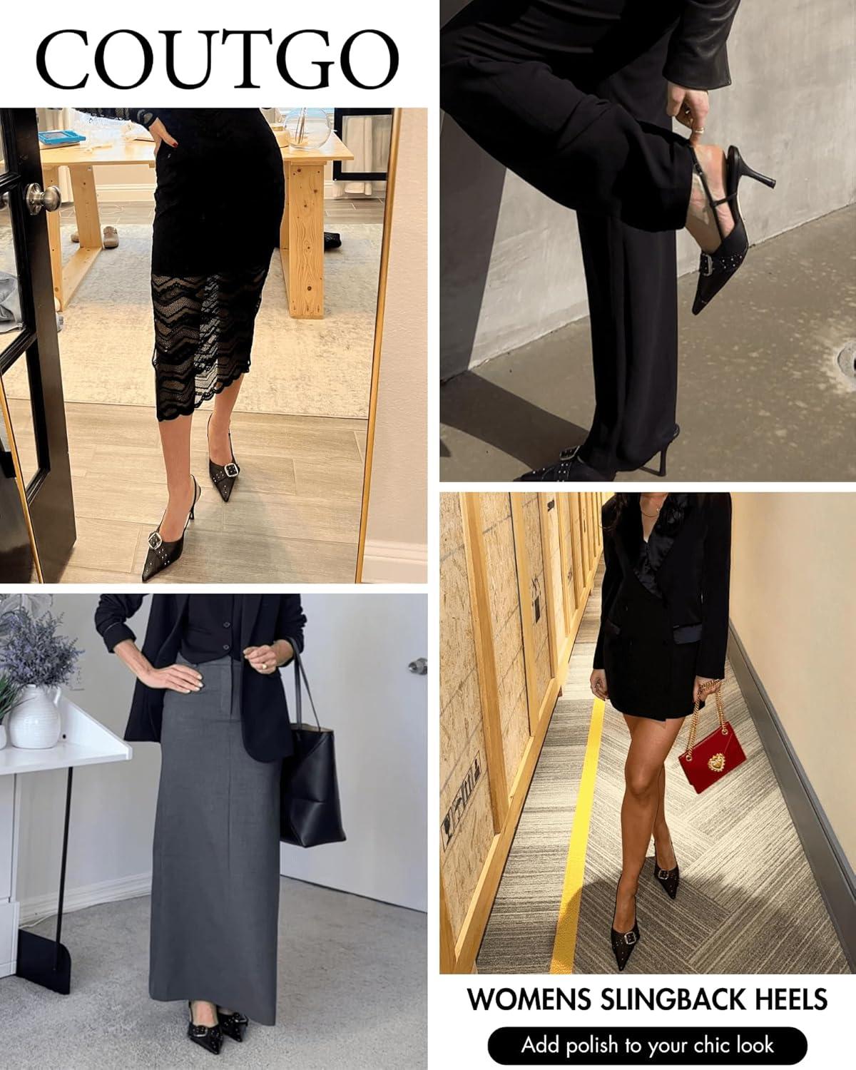 Coutgo Womens Slingback Kitten Heels Studded Closed Pointed Toe Pumps with Buckle Party Dress Shoes(Khaki)
