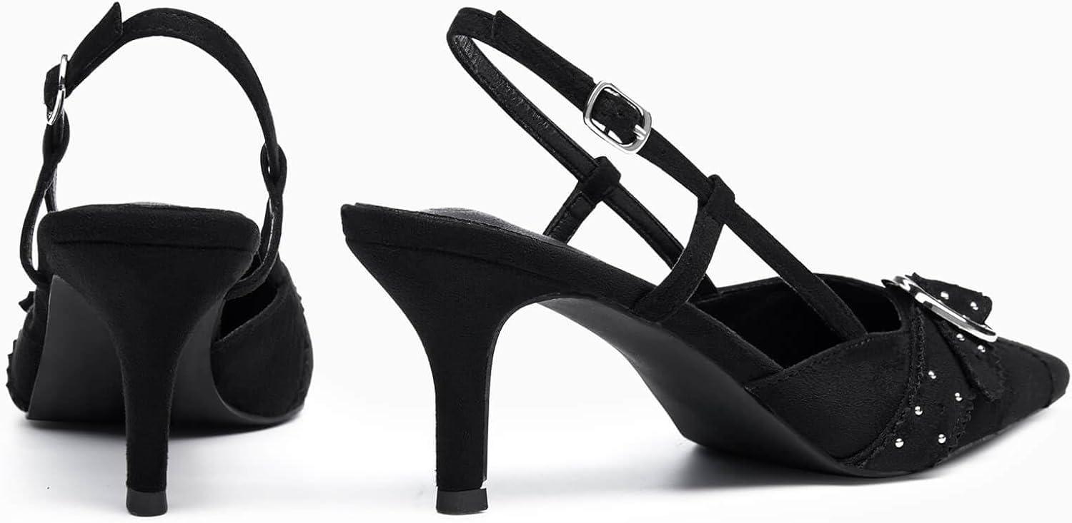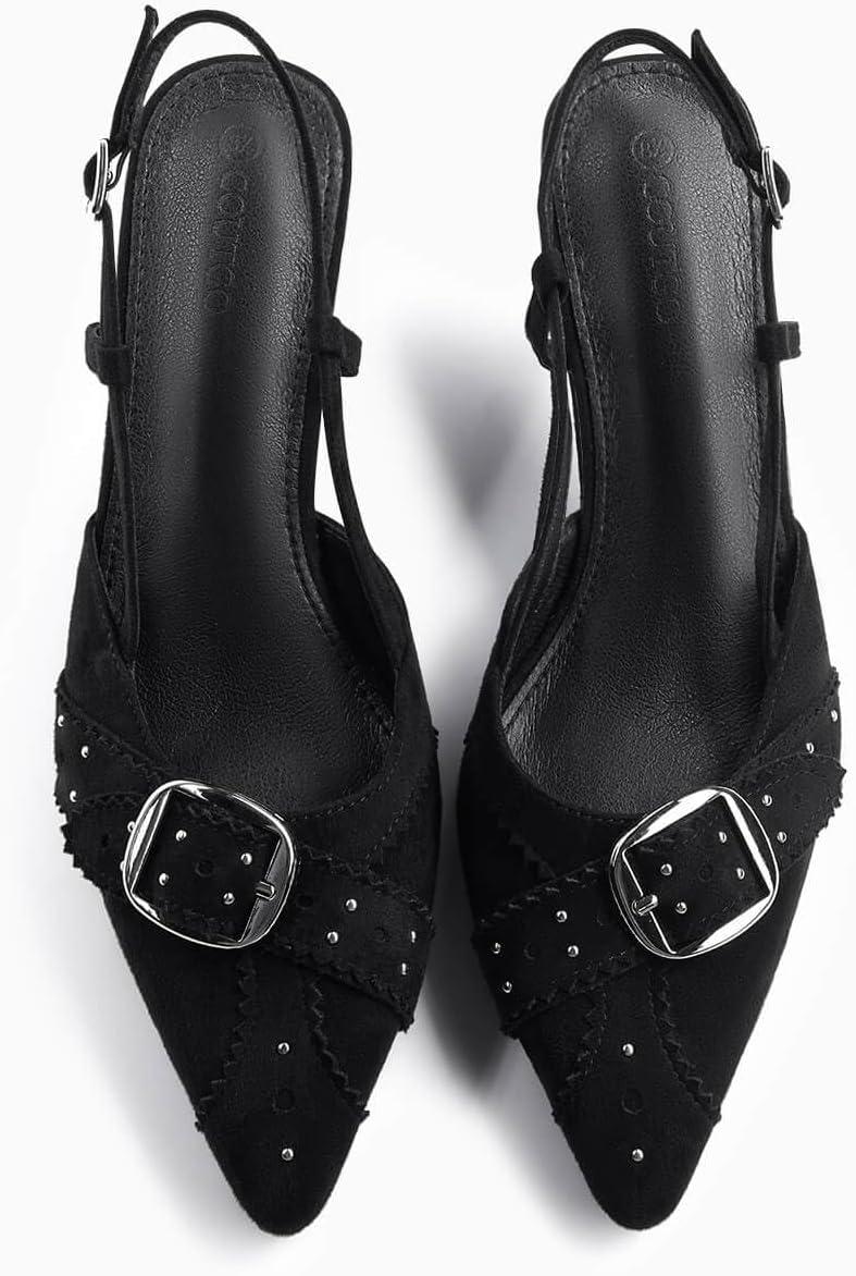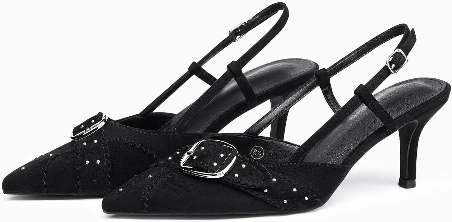Get your hands on our exclusive Coutgo Womens Slingback Kitten Heels Studded Closed Pointed Toe Pumps with Buckle Party Dress Shoes(Suede Black) collection, now at a discounted price.