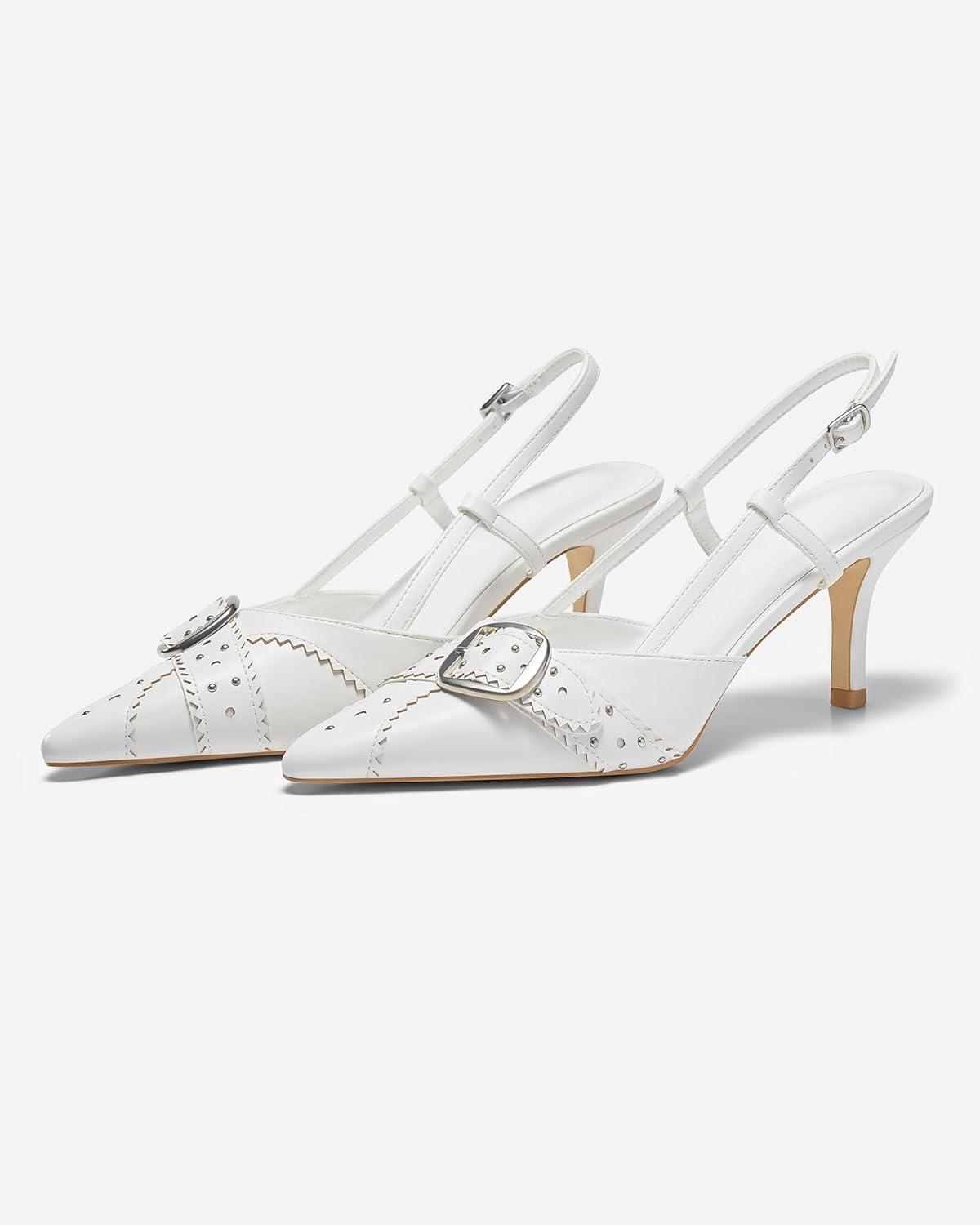 Coutgo Womens Slingback Kitten Heels Studded Closed Pointed Toe Pumps with Buckle Party Dress Shoes(White)