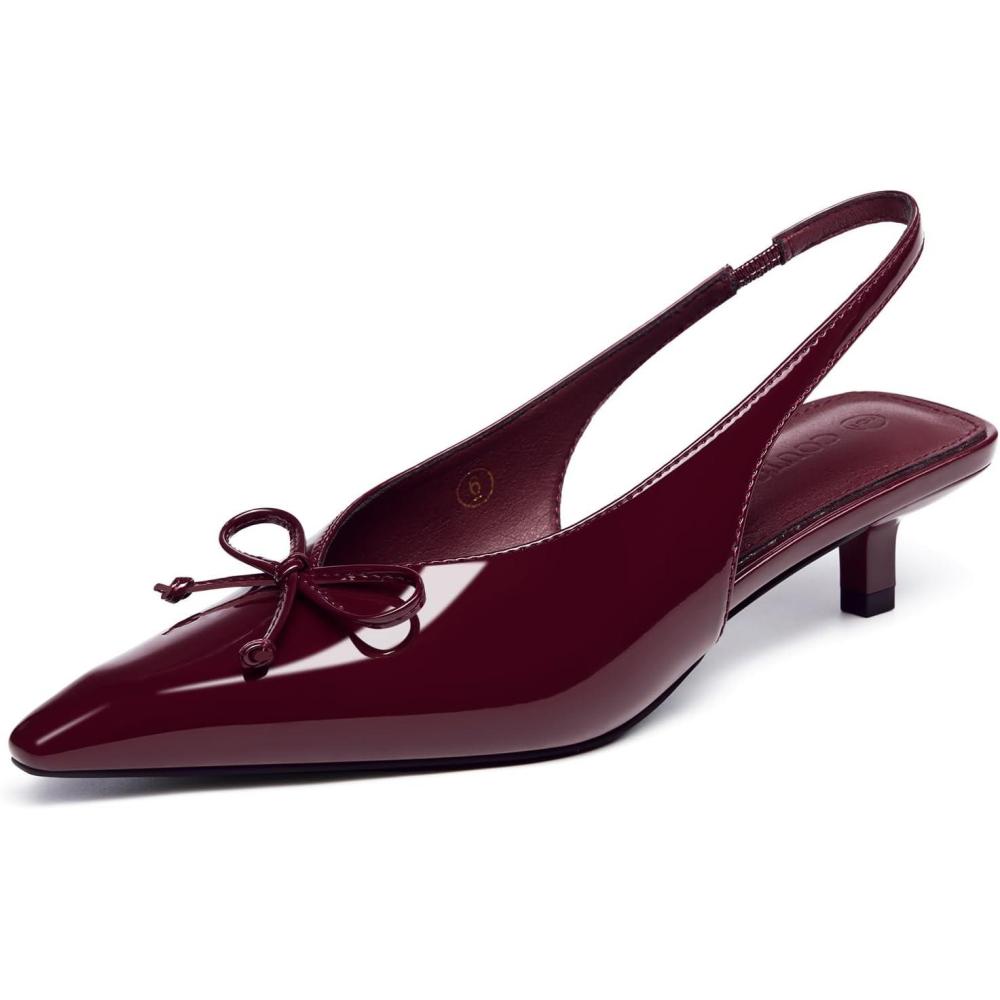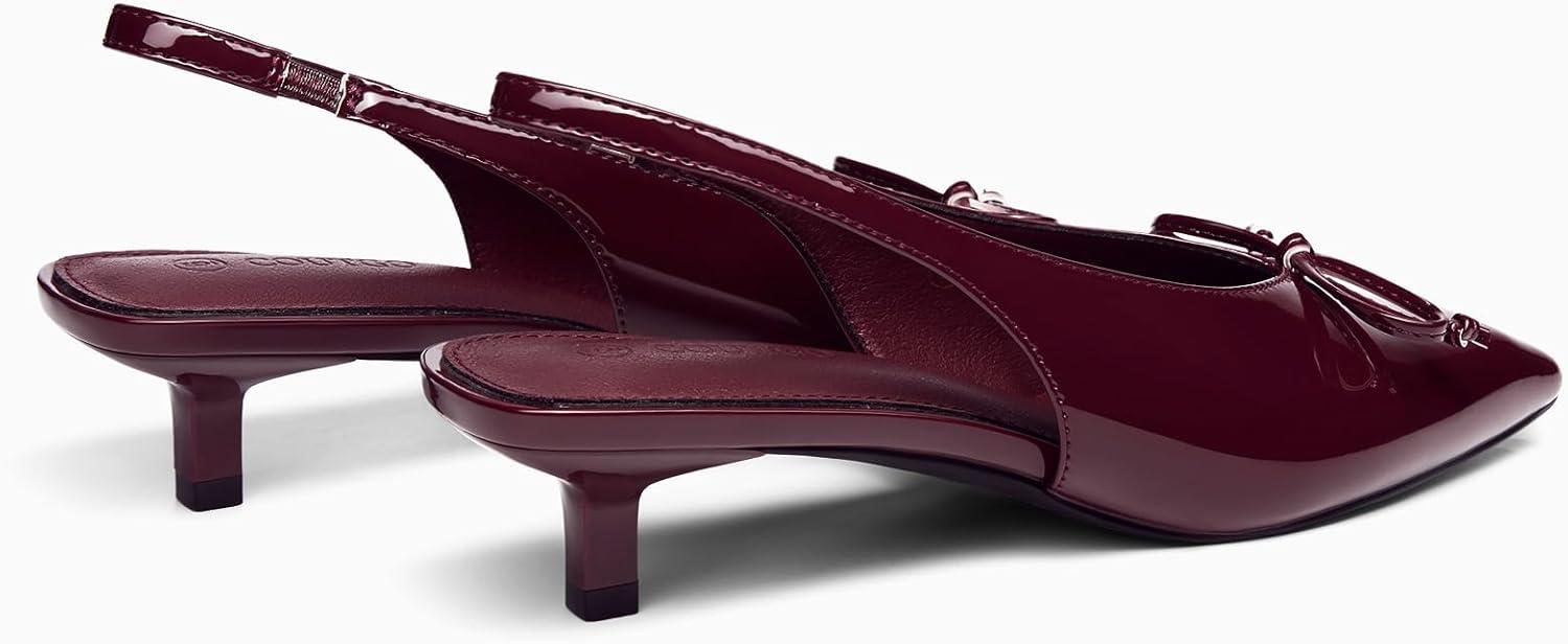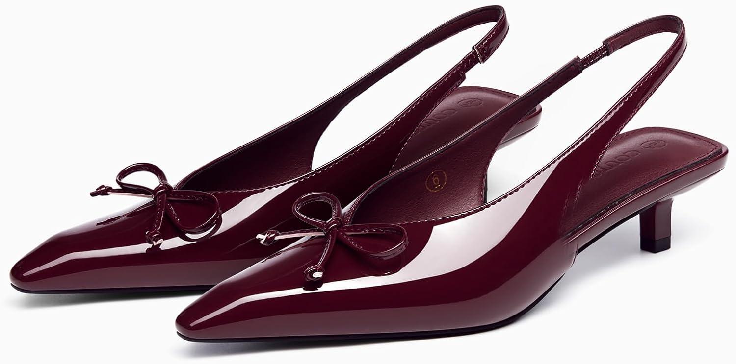 Get a free gift with your purchase of Coutgo Womens Slingback Kitten Low Heels Dress Shoes Closed Pointed Toe Bow Tie Slip on Office Work Pumps(Dark Red). Limited quantities available!