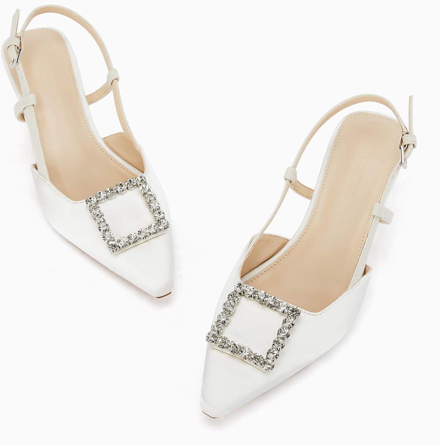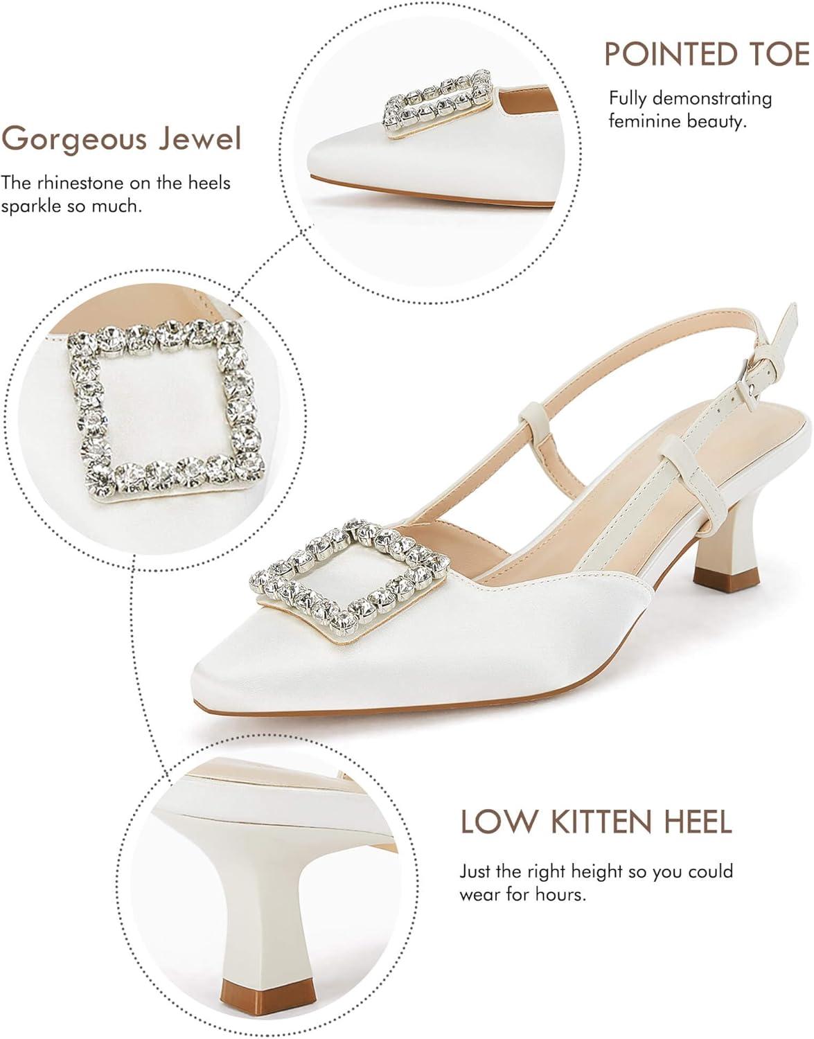 Coutgo Womens Slingback Low Kitten Heels Pumps Closed Pointed Toe Rhinestone Wedding Dress Shoes(Cream)