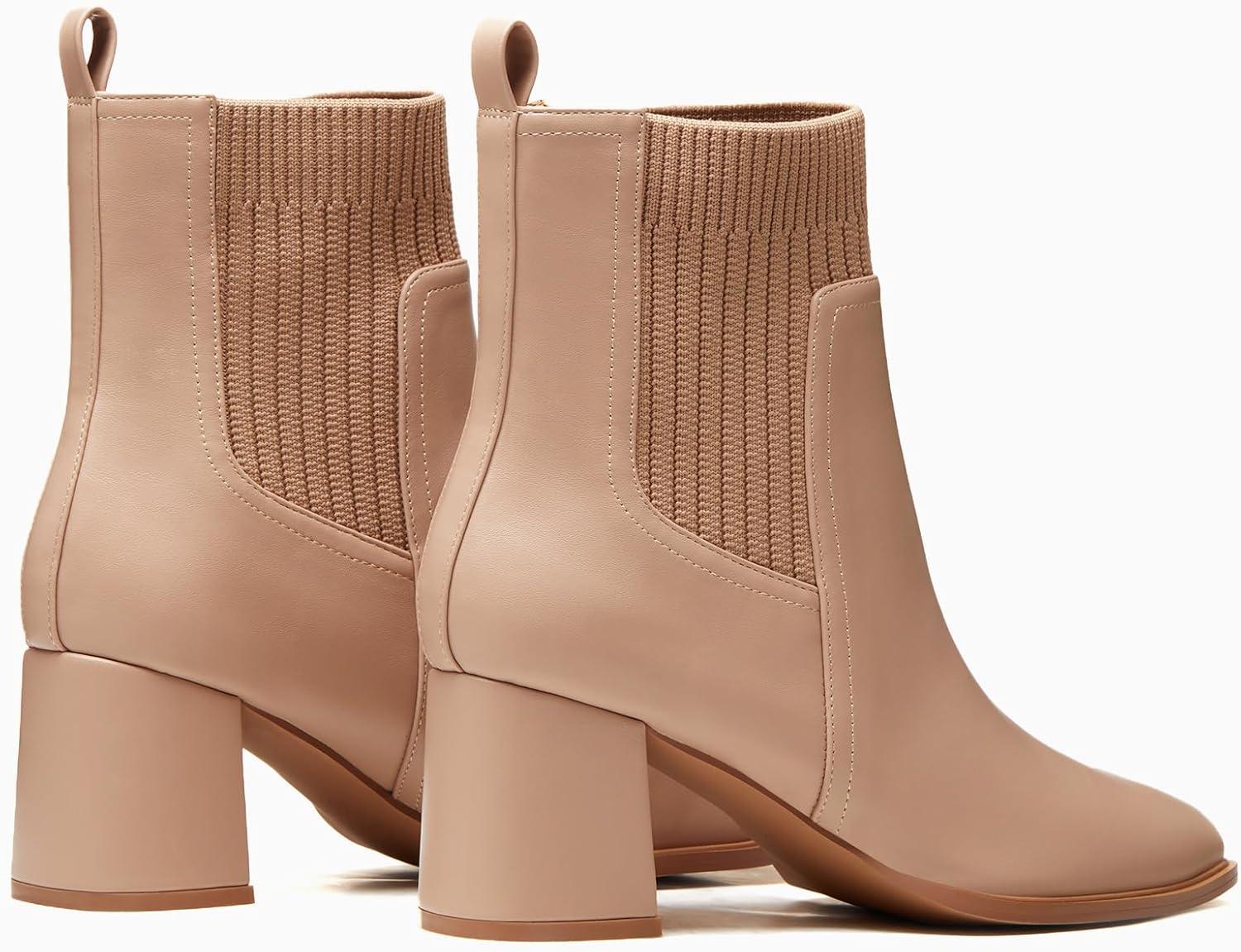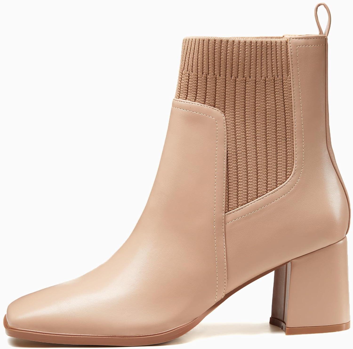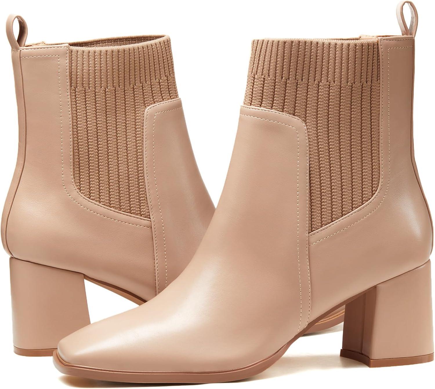 Coutgo Women’s Slip On Ankle Boots Chunky Block Heel Square Toe Splicing Dress Sock Booties(Khaki)