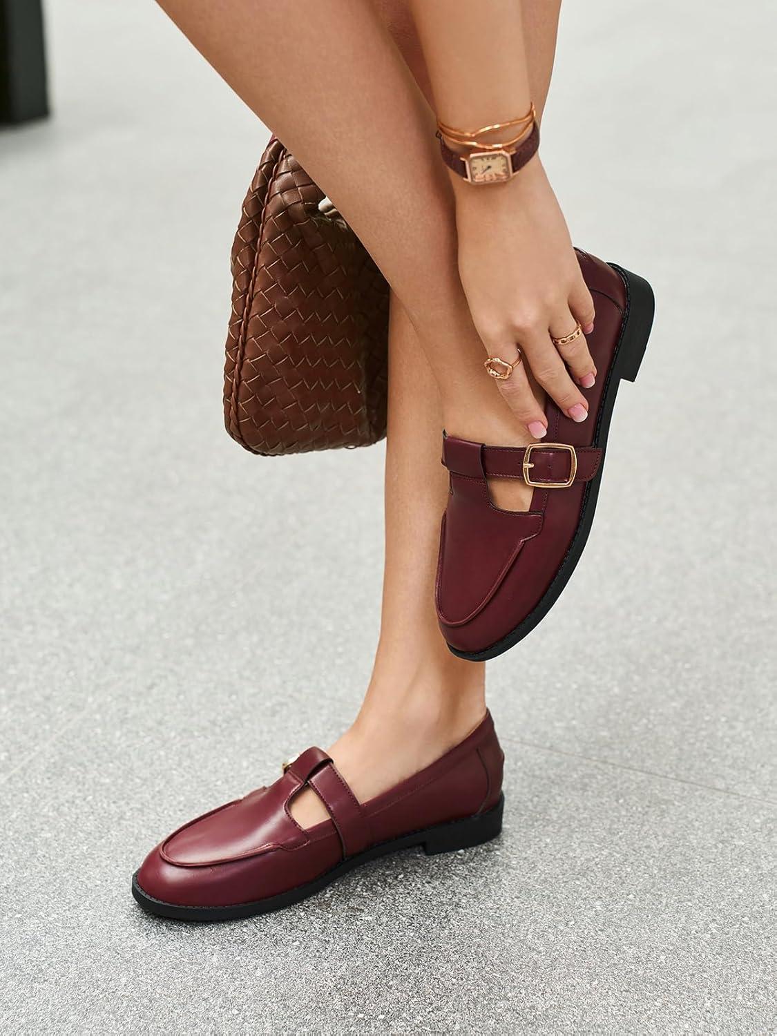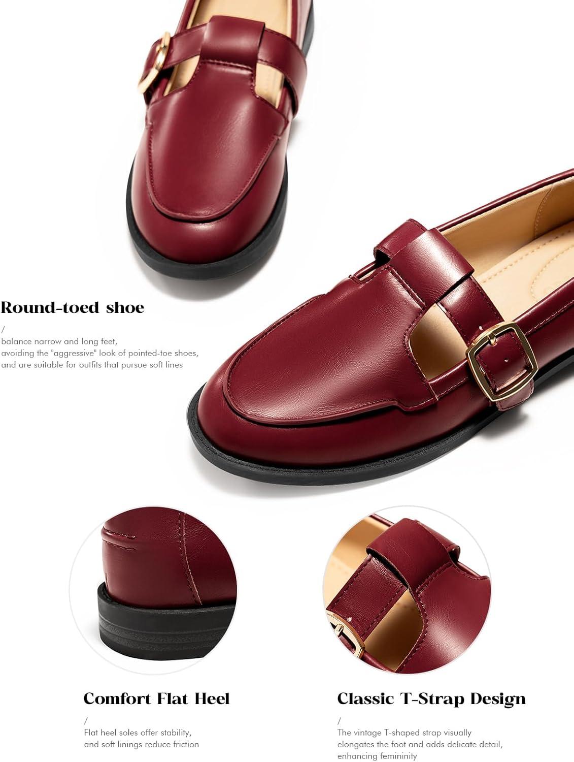 Coutgo Womens Slip On Loafers T-Strap Closed Round Toe Flats Comfortable Work Business Dress Shoes(Wine Red)