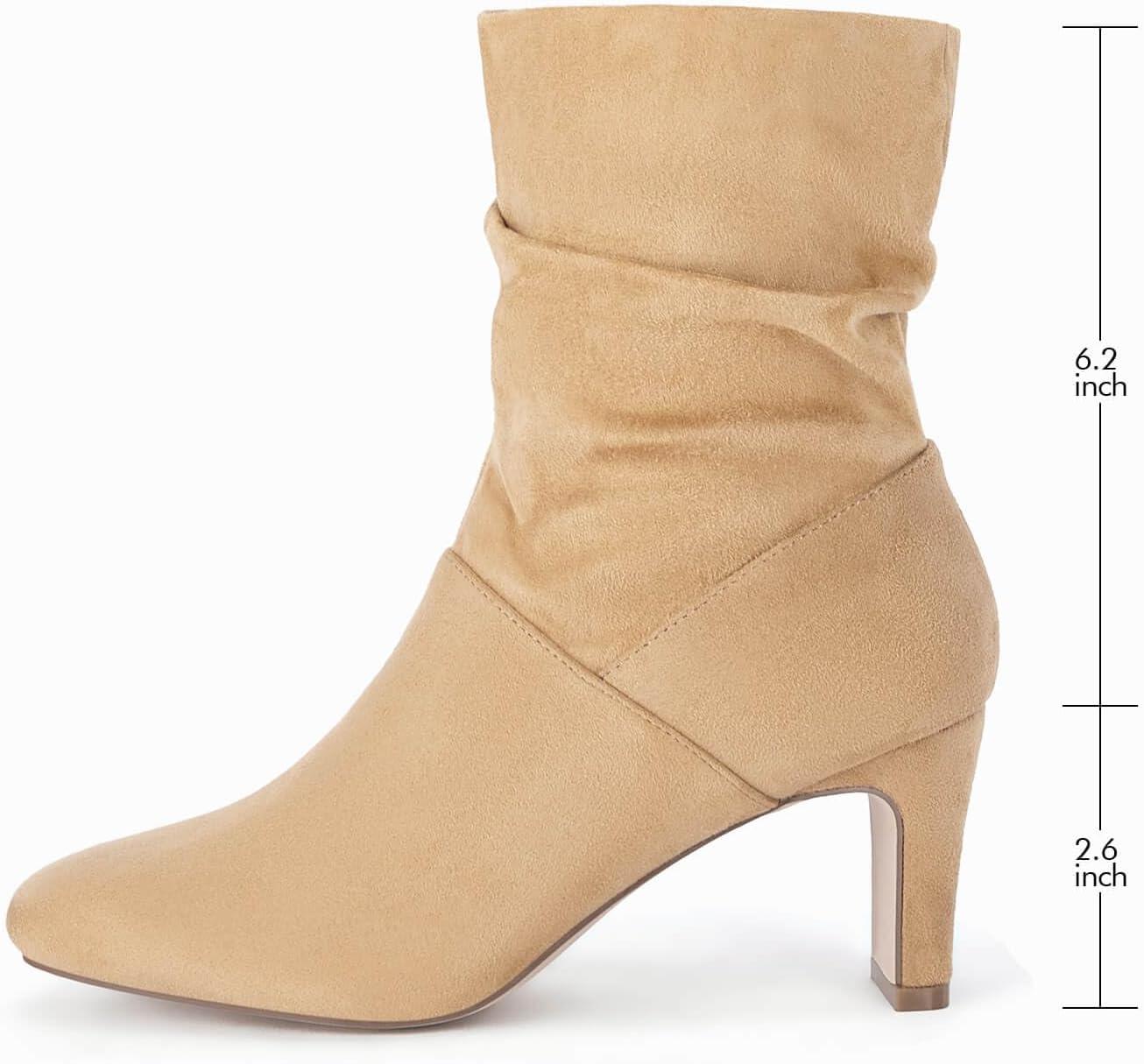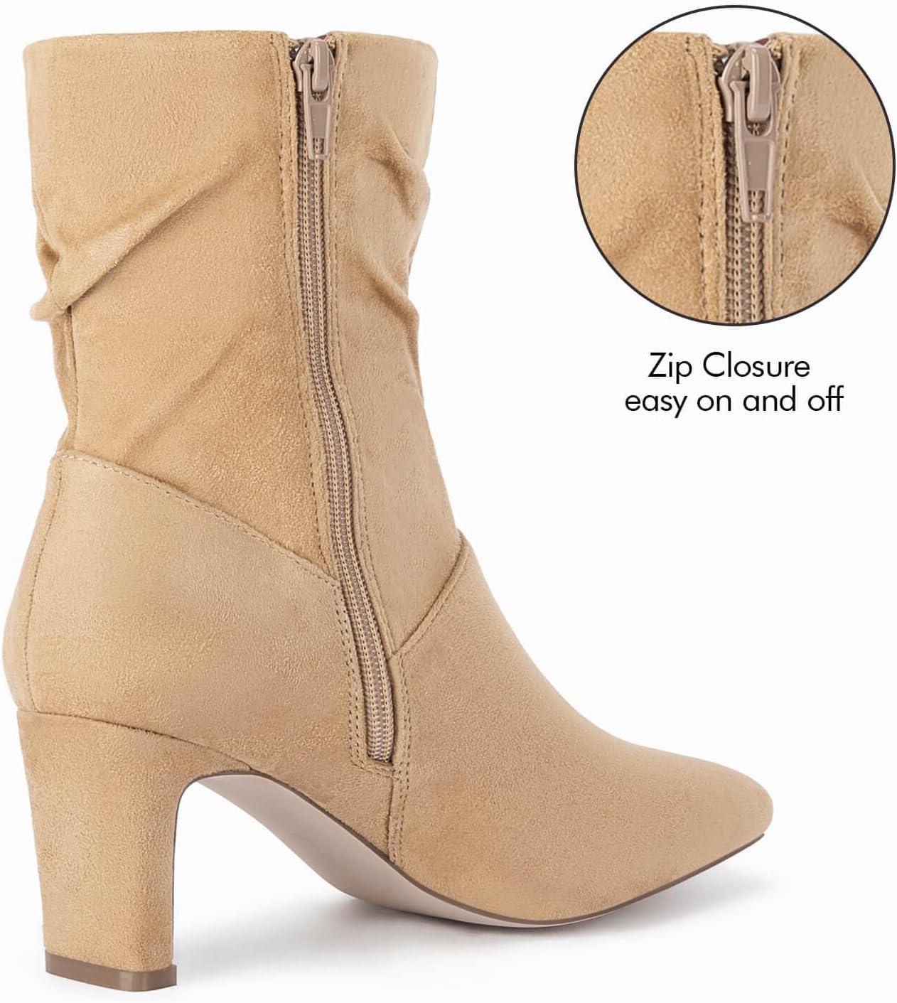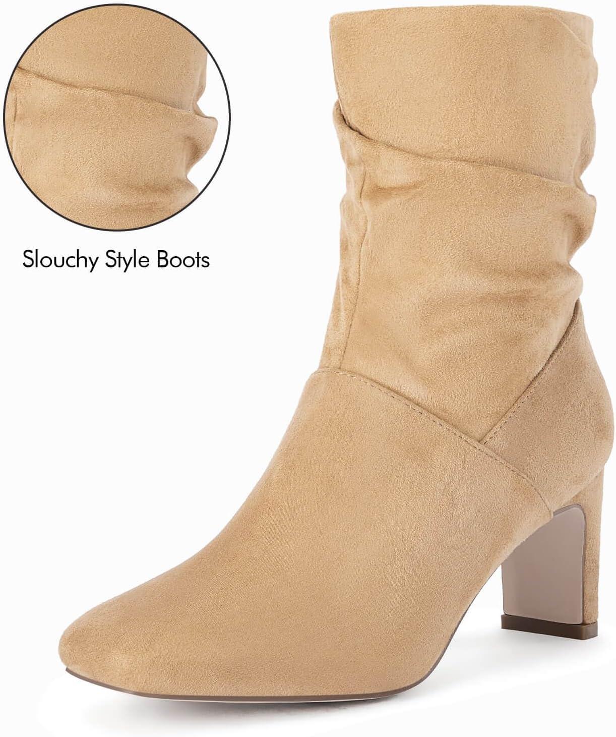 Coutgo Women’s Slouch Mid Calf Boots Chunky Heel Square Toe Zip Up Fall Fashion Booties Shoes(Khaki)