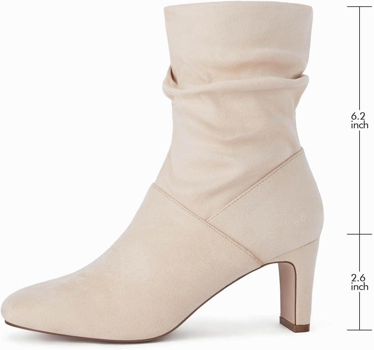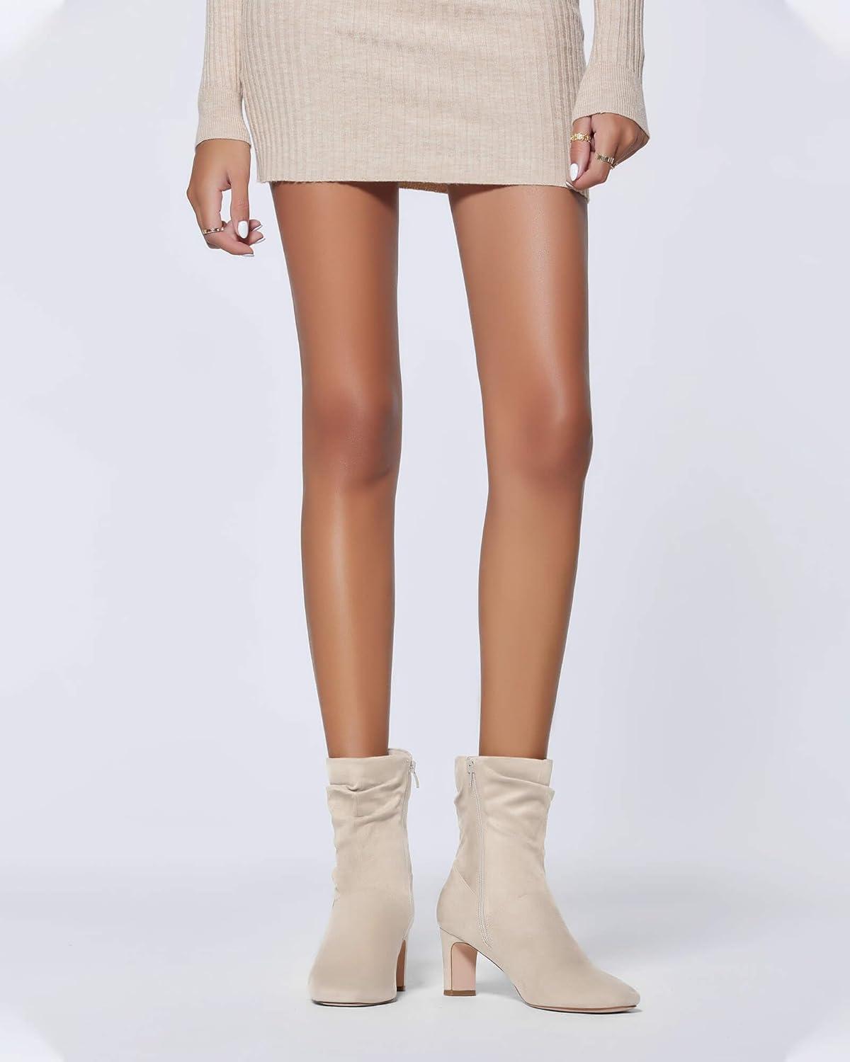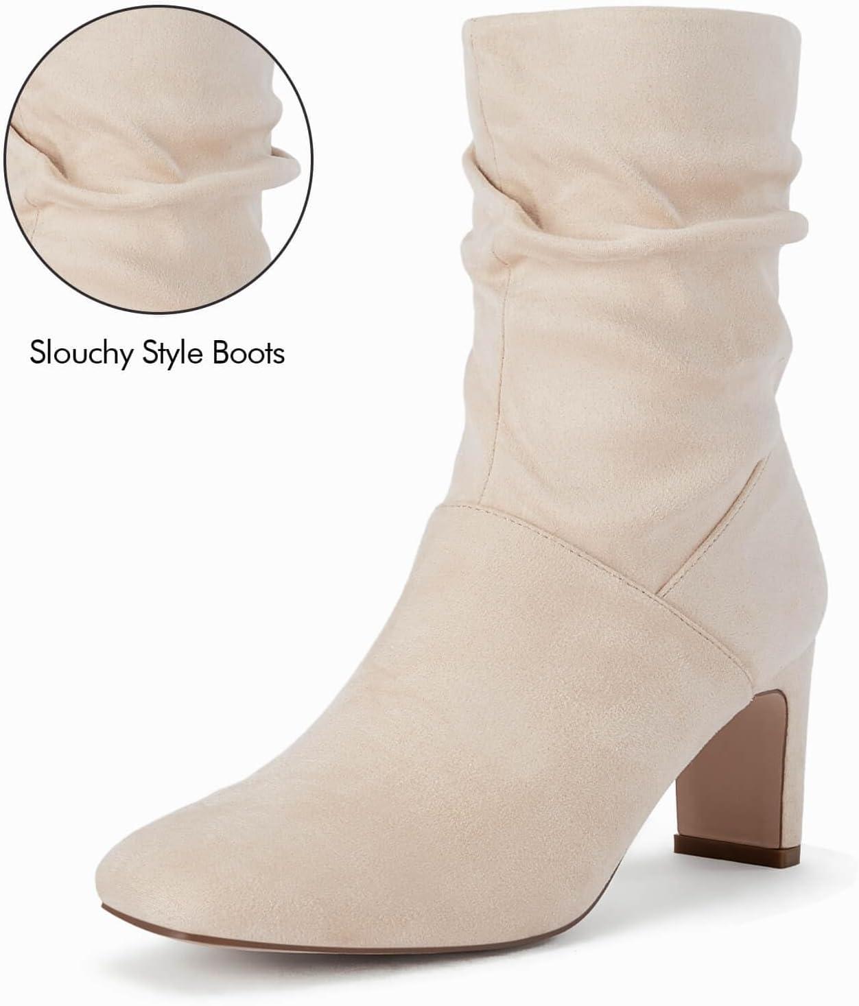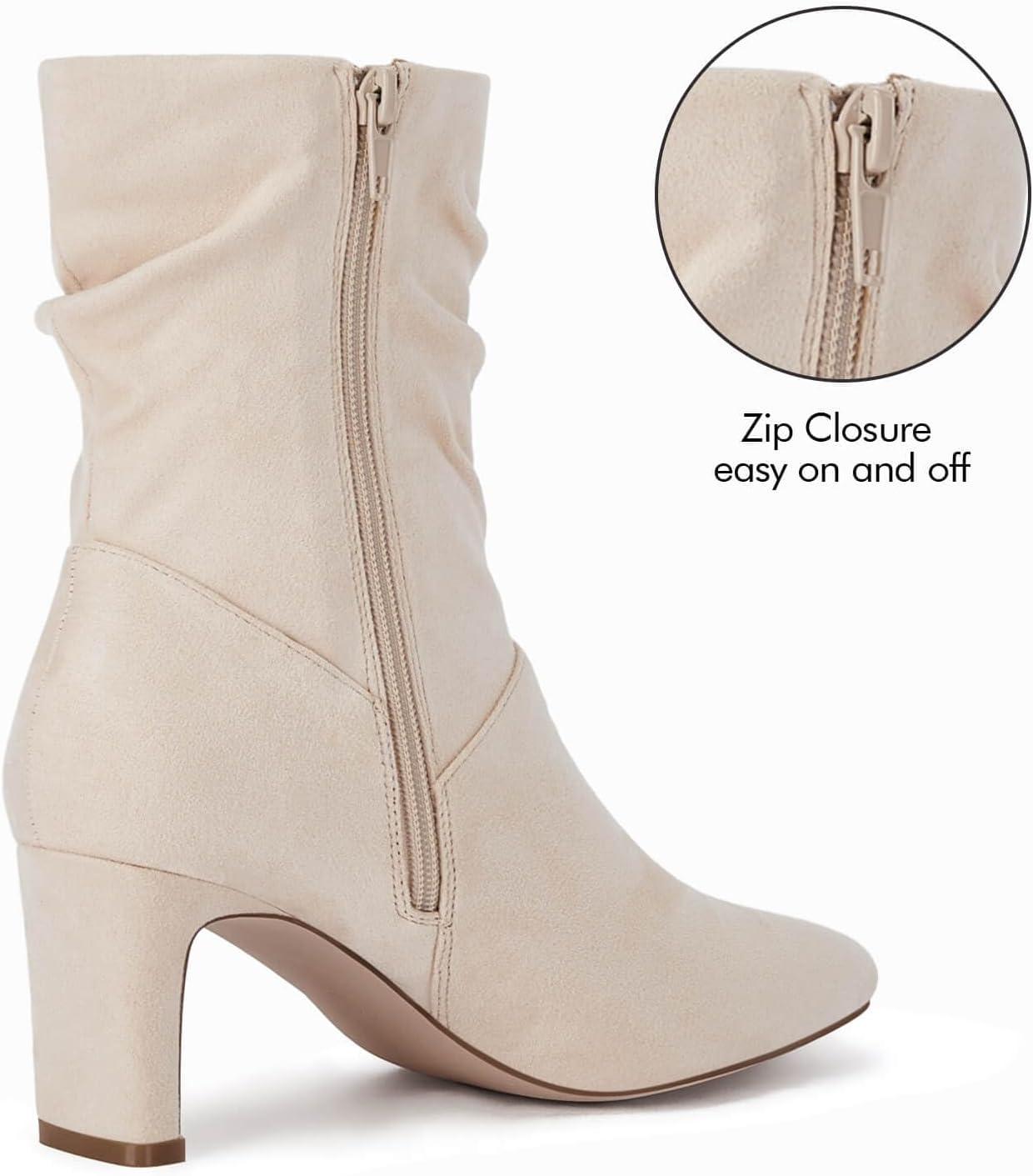 Coutgo Women’s Slouch Mid Calf Boots Chunky Heel Square Toe Zip Up Fall Fashion Booties Shoes(Nude)