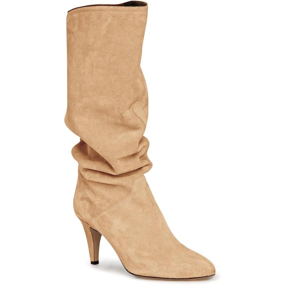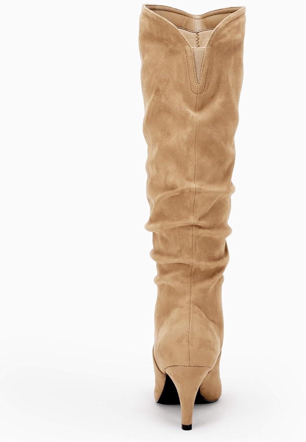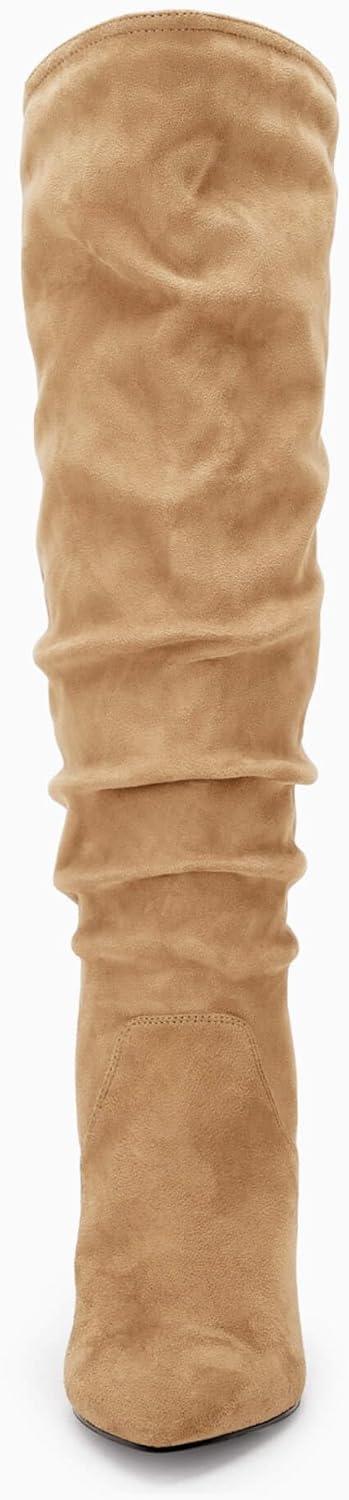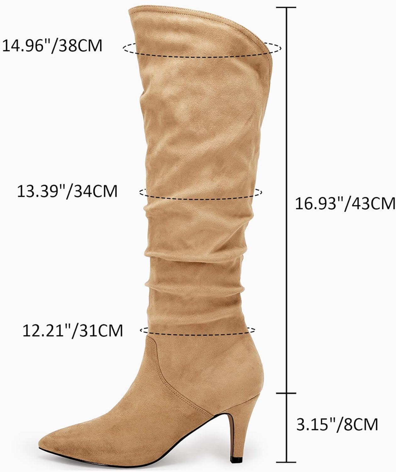 Coutgo Womens Slouchy Knee High Boots Wide Calf Kitten Heel Pointed Toe Pull On Long Boots Winter Shoes(Khaki)