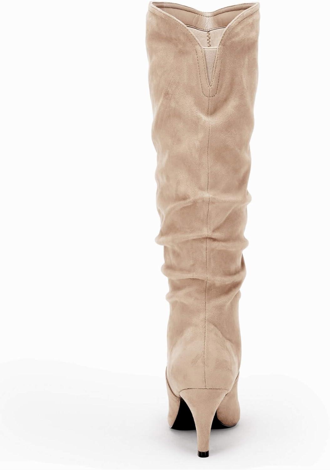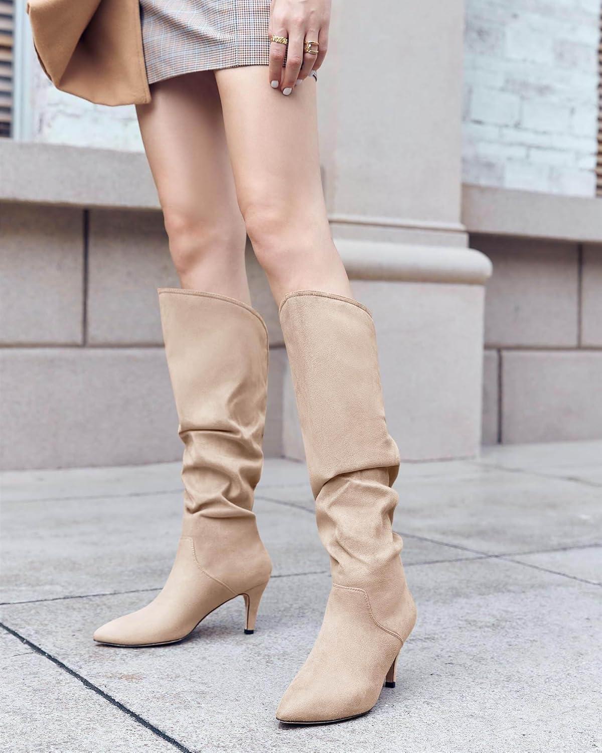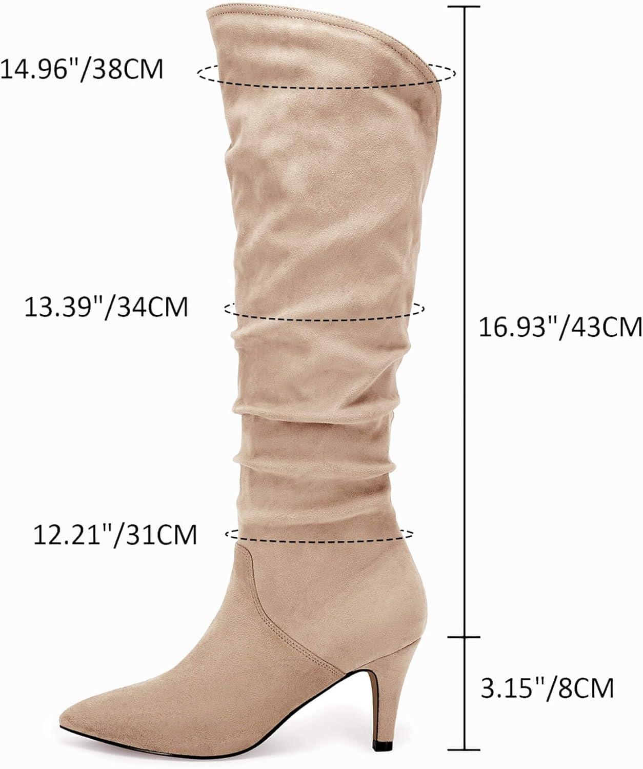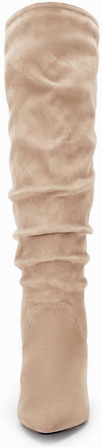 Coutgo Womens Slouchy Knee High Boots Wide Calf Kitten Heel Pointed Toe Pull On Long Boots Winter Shoes(Nude)