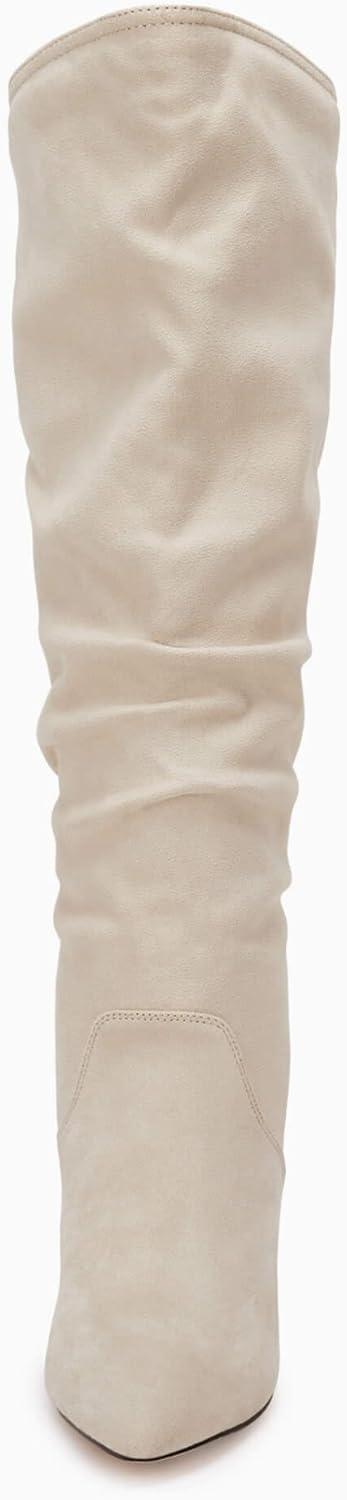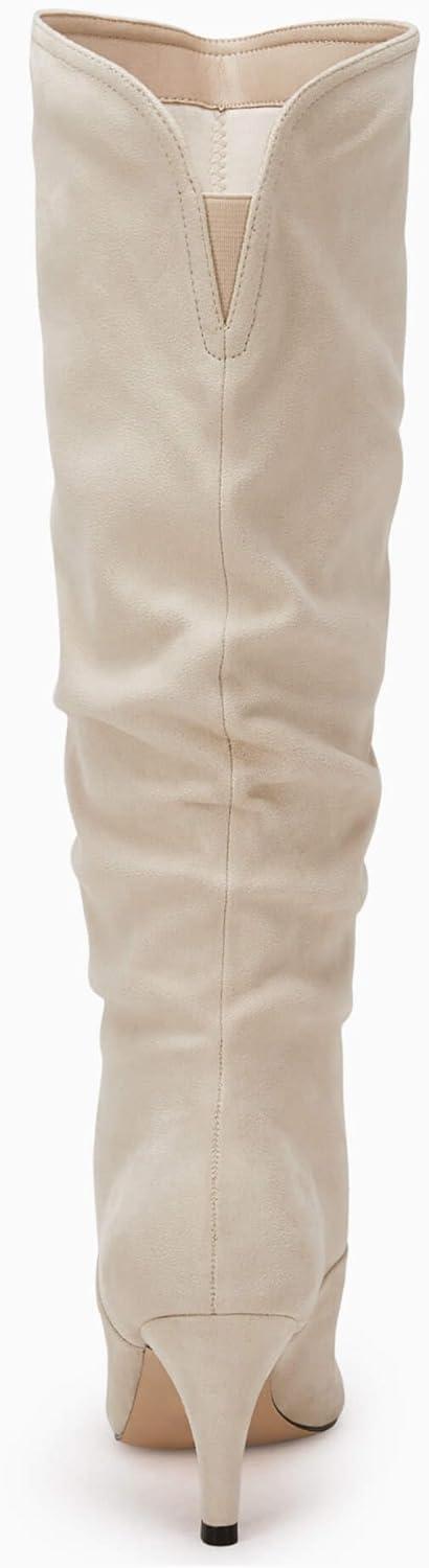 Coutgo Womens Slouchy Knee High Boots Wide Calf Kitten Heel Pointed Toe Pull On Long Boots Winter Shoes(Off-white)