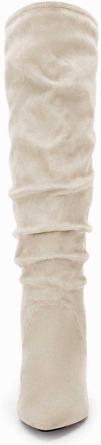 Coutgo Womens Slouchy Knee High Boots Wide Calf Kitten Heel Pointed Toe Pull On Long Boots Winter Shoes(Z-white)