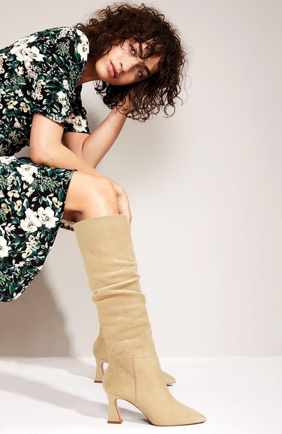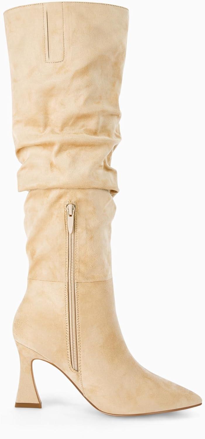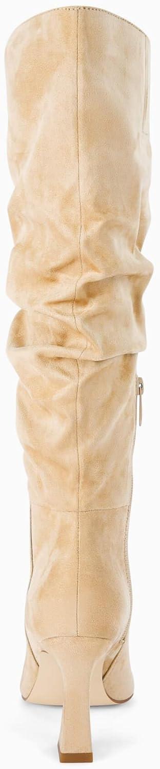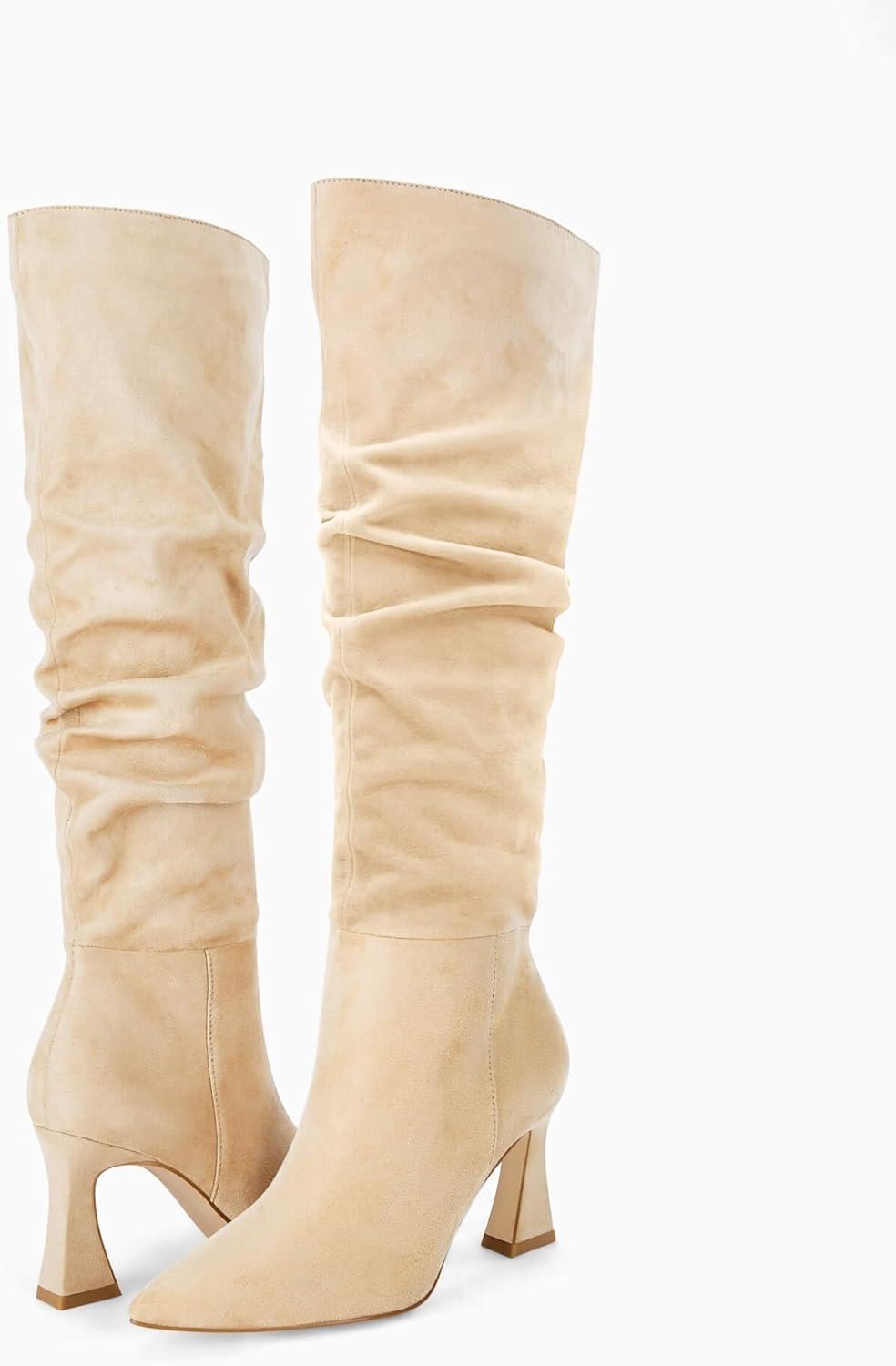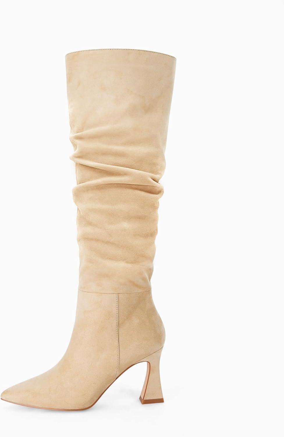 Coutgo Women’s Slouchy Knee High Boots Wide Calf Pointed Toe Side Zipper Chunky Heel Long Boots Winter Shoes(Beige)