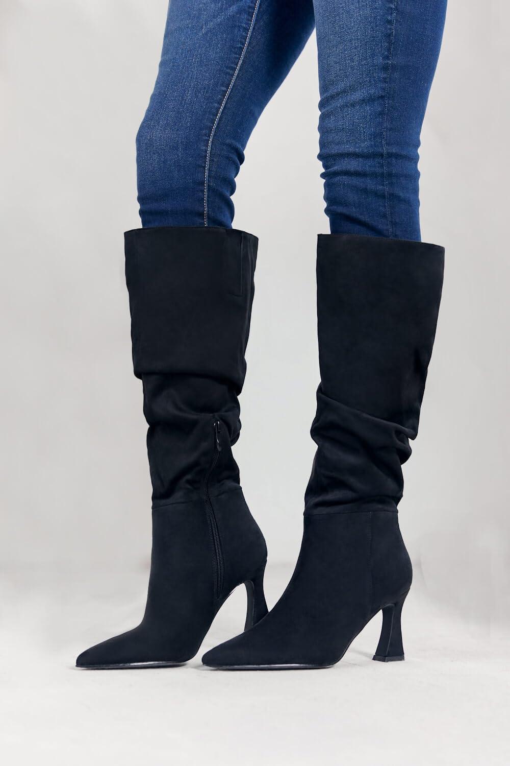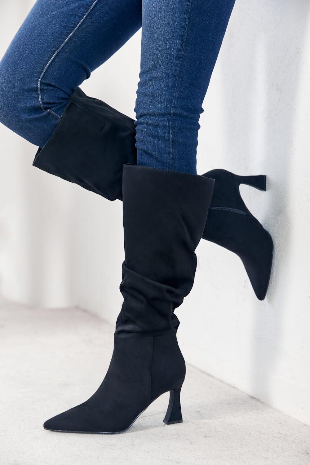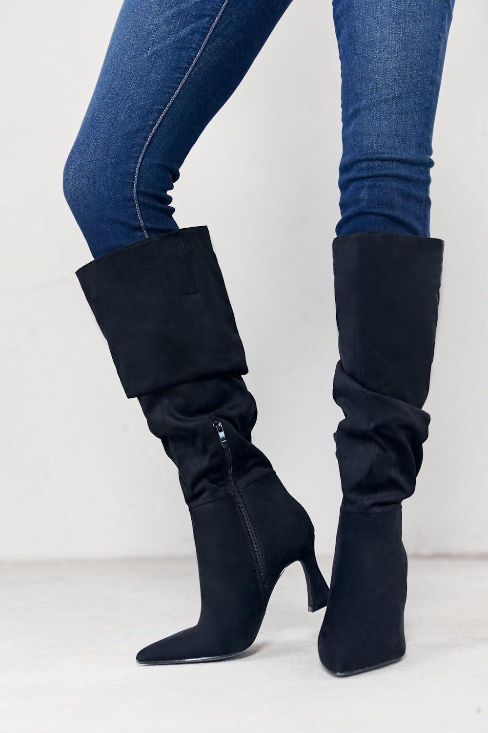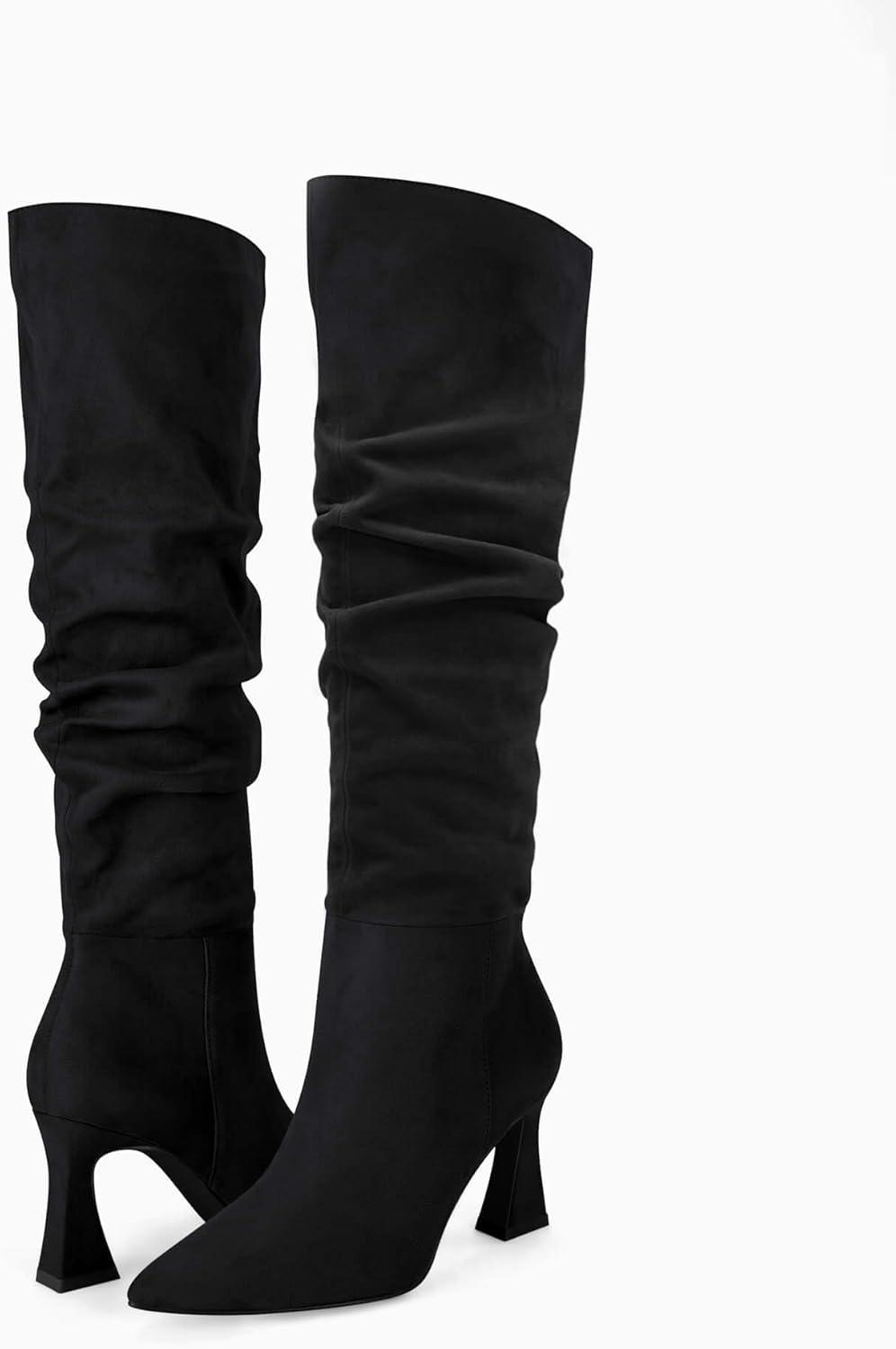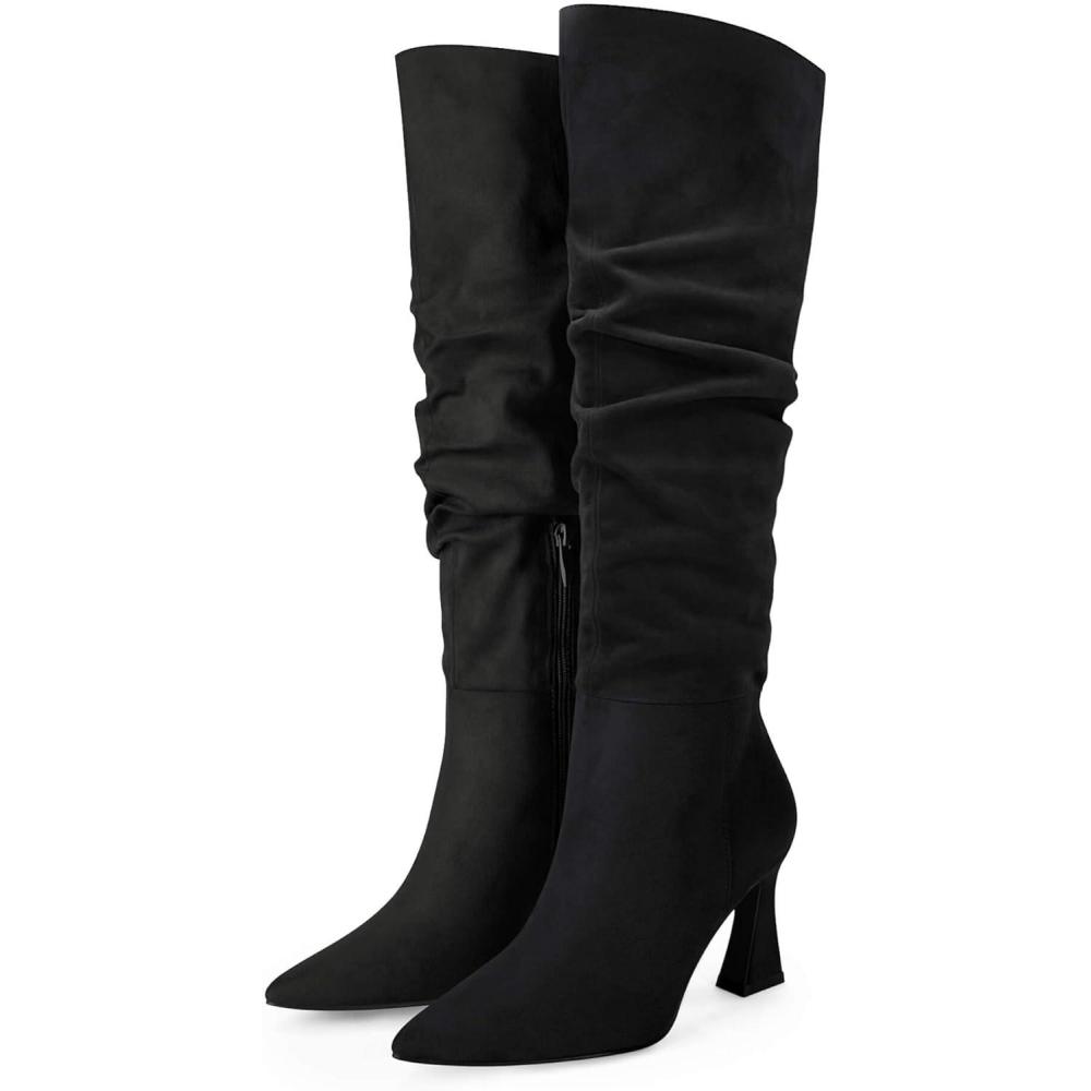 Coutgo Women’s Slouchy Knee High Boots Wide Calf Pointed Toe Side Zipper Chunky Heel Long Boots Winter Shoes(Black)