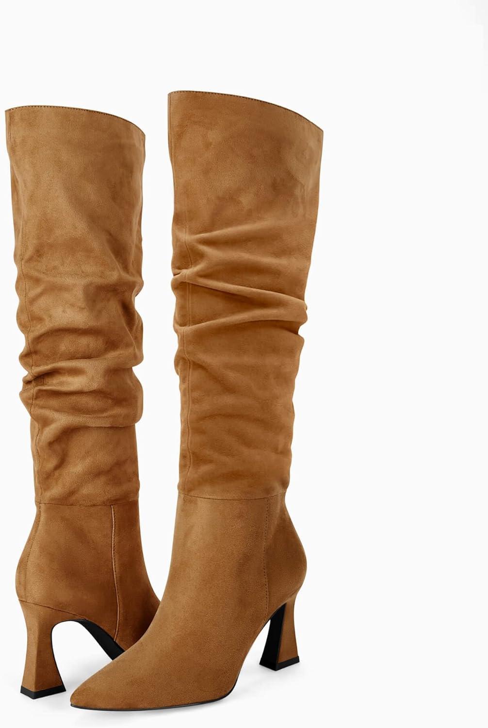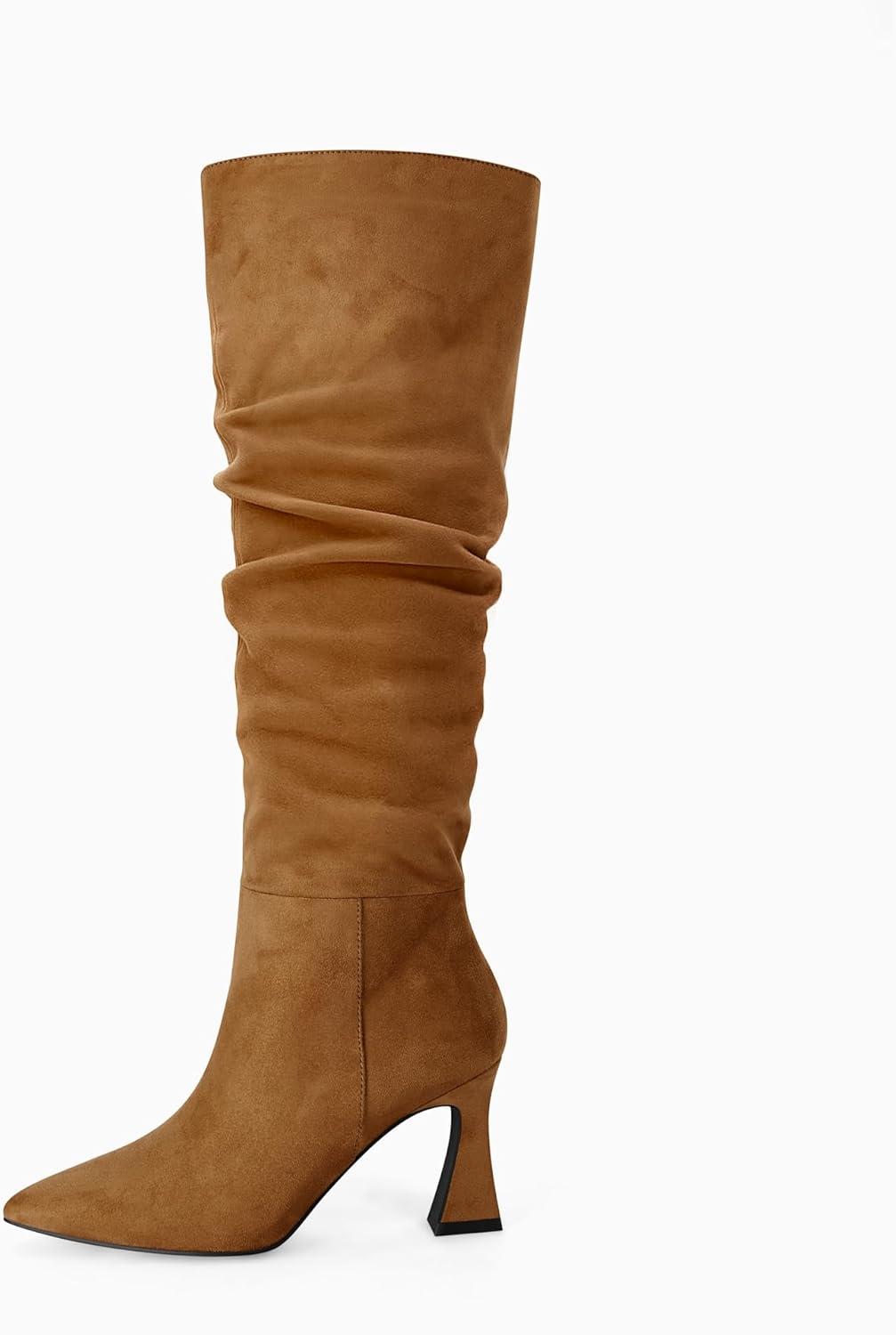 Coutgo Women’s Slouchy Knee High Boots Wide Calf Pointed Toe Side Zipper Chunky Heel Long Boots Winter Shoes(Brown)