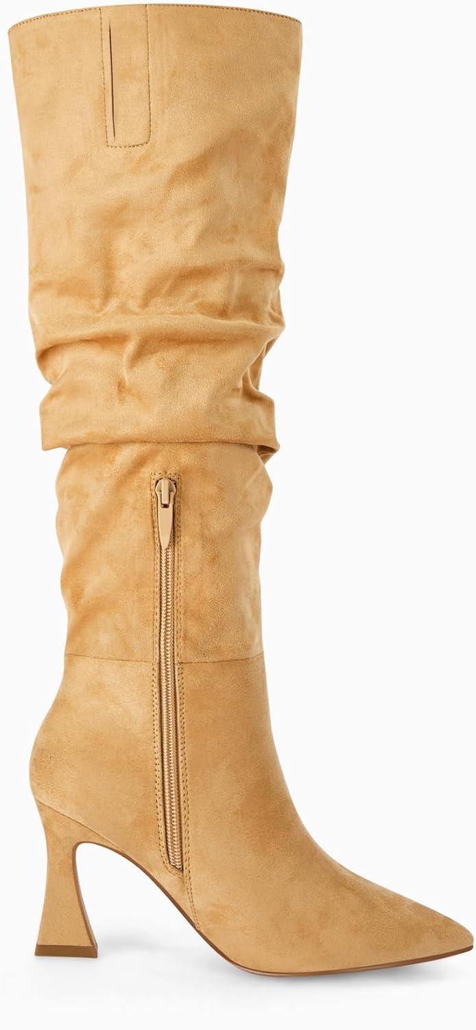 Coutgo Women’s Slouchy Knee High Boots Wide Calf Pointed Toe Side Zipper Chunky Heel Long Boots Winter Shoes(Khaki)