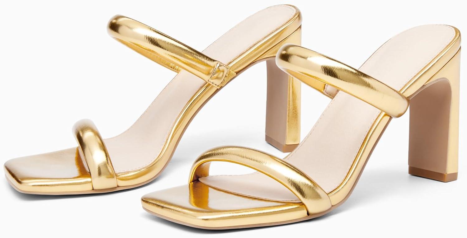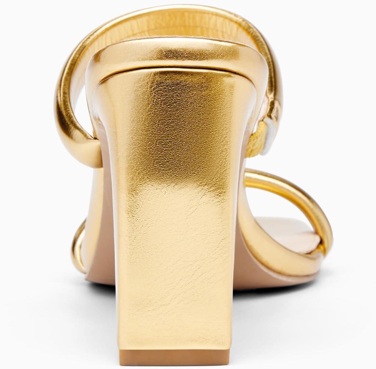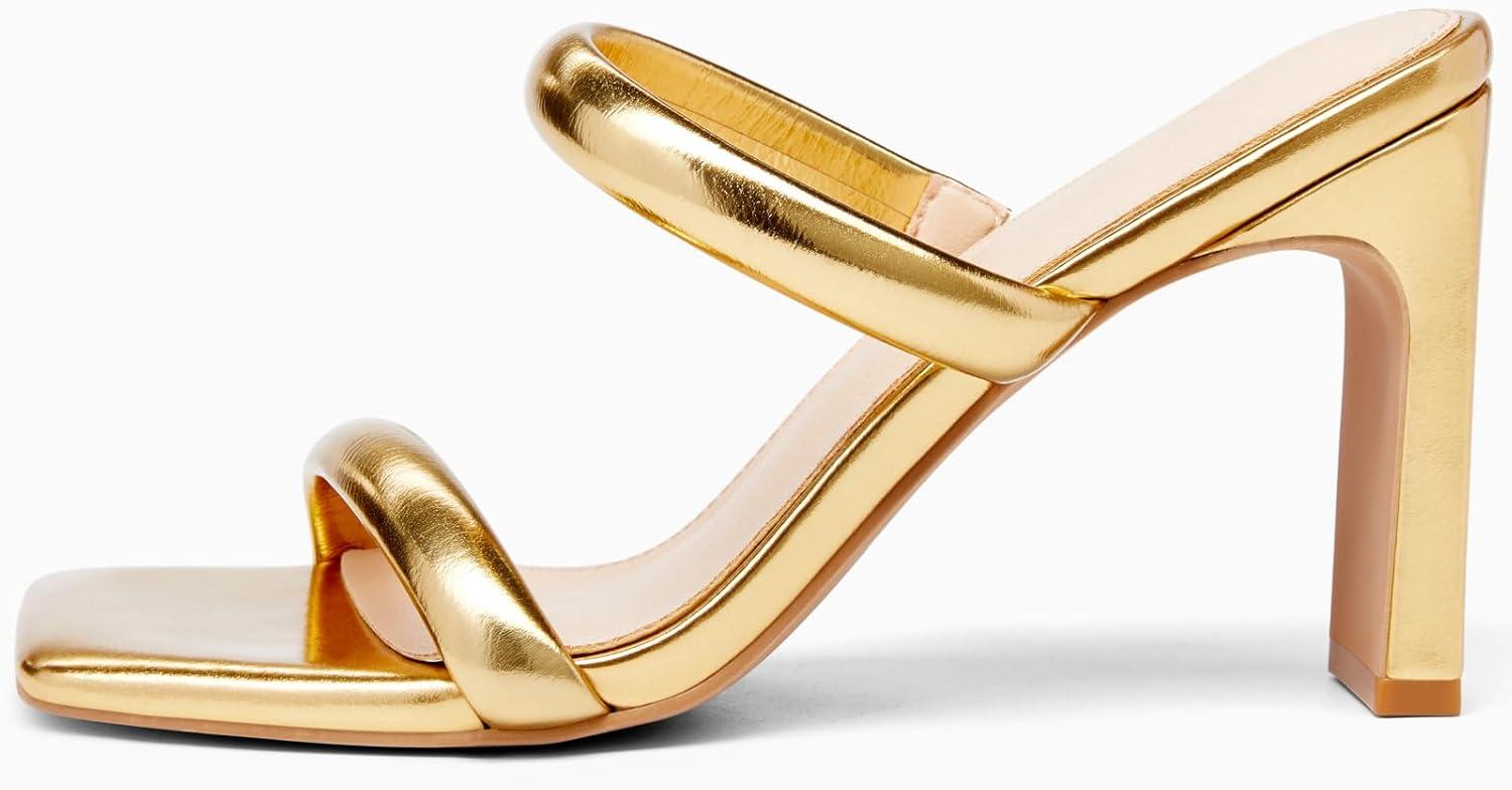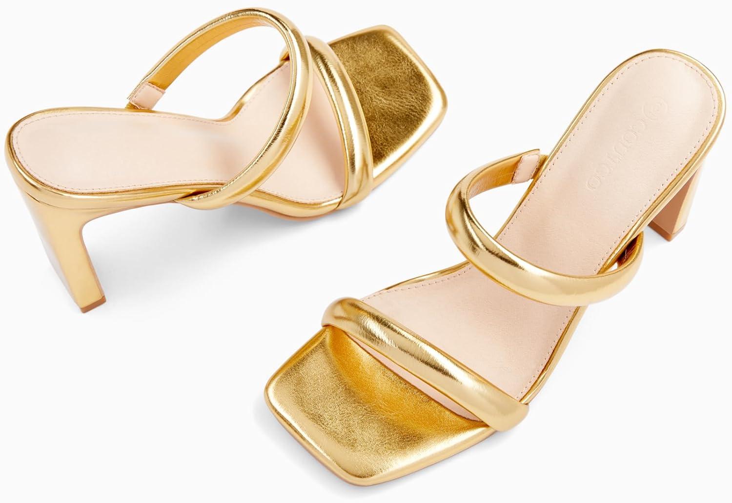 Coutgo Womens Square Open Toe Heeled Sandals Two Strap High Heel Backless Dress Slip On Mules(Gold)
