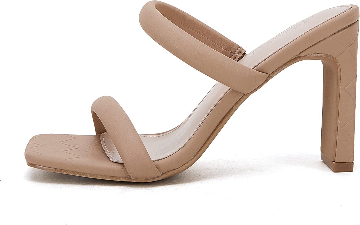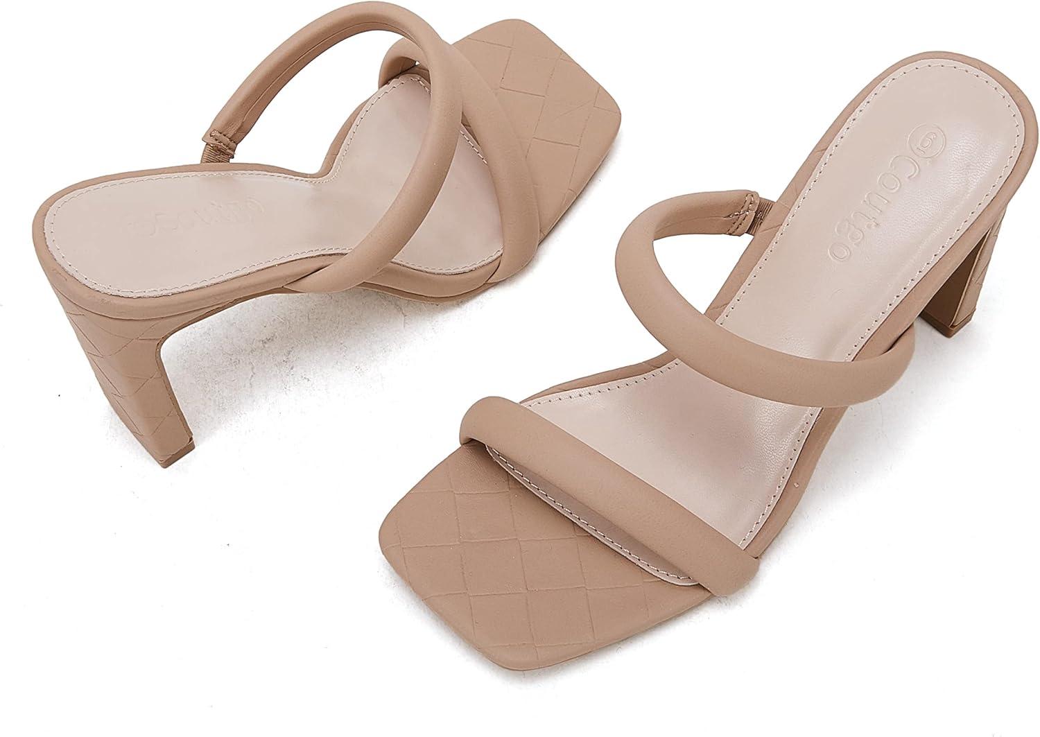 Coutgo Womens Square Open Toe Heeled Sandals Two Strap High Heel Backless Dress Slip On Mules(Khaki)