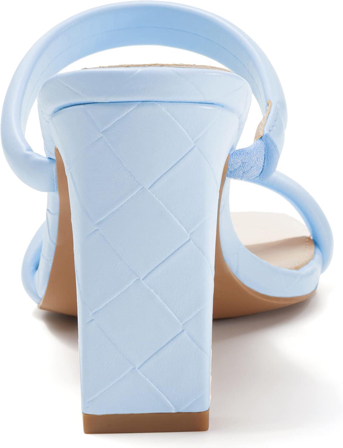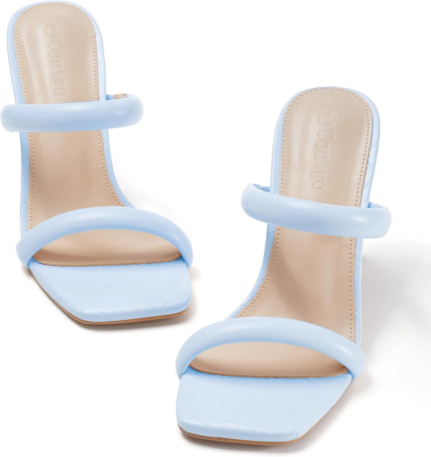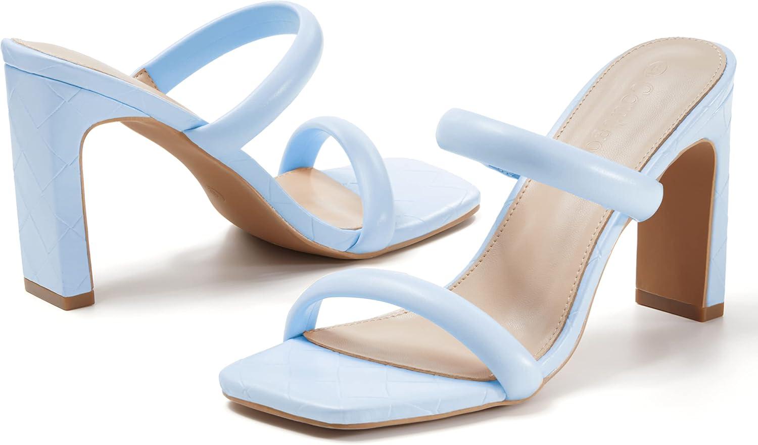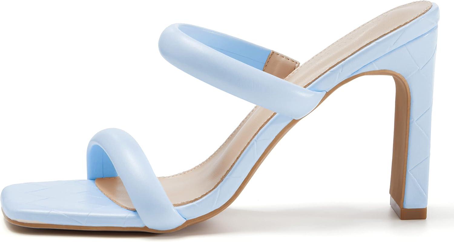 Coutgo Womens Square Open Toe Heeled Sandals Two Strap High Heel Backless Dress Slip On Mules(Light Blue)