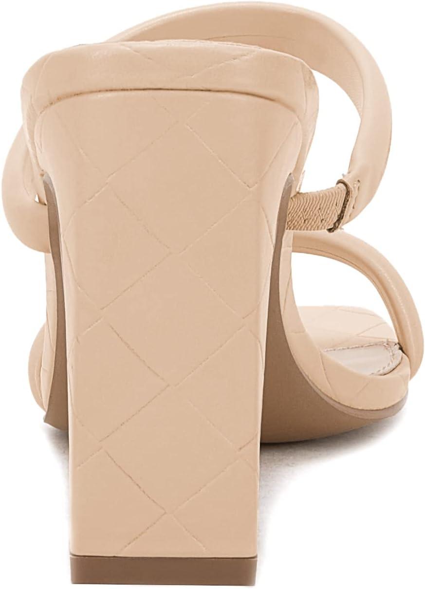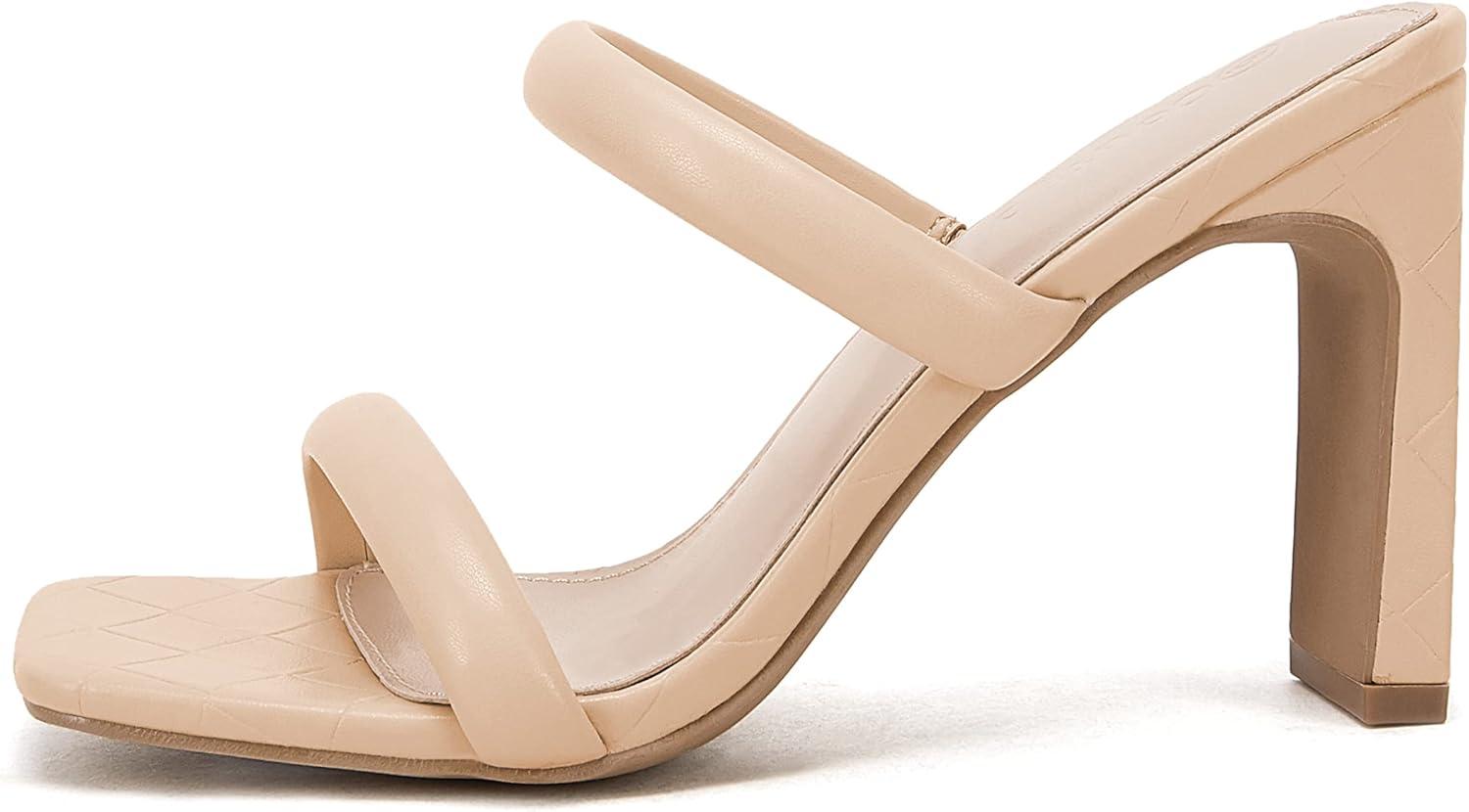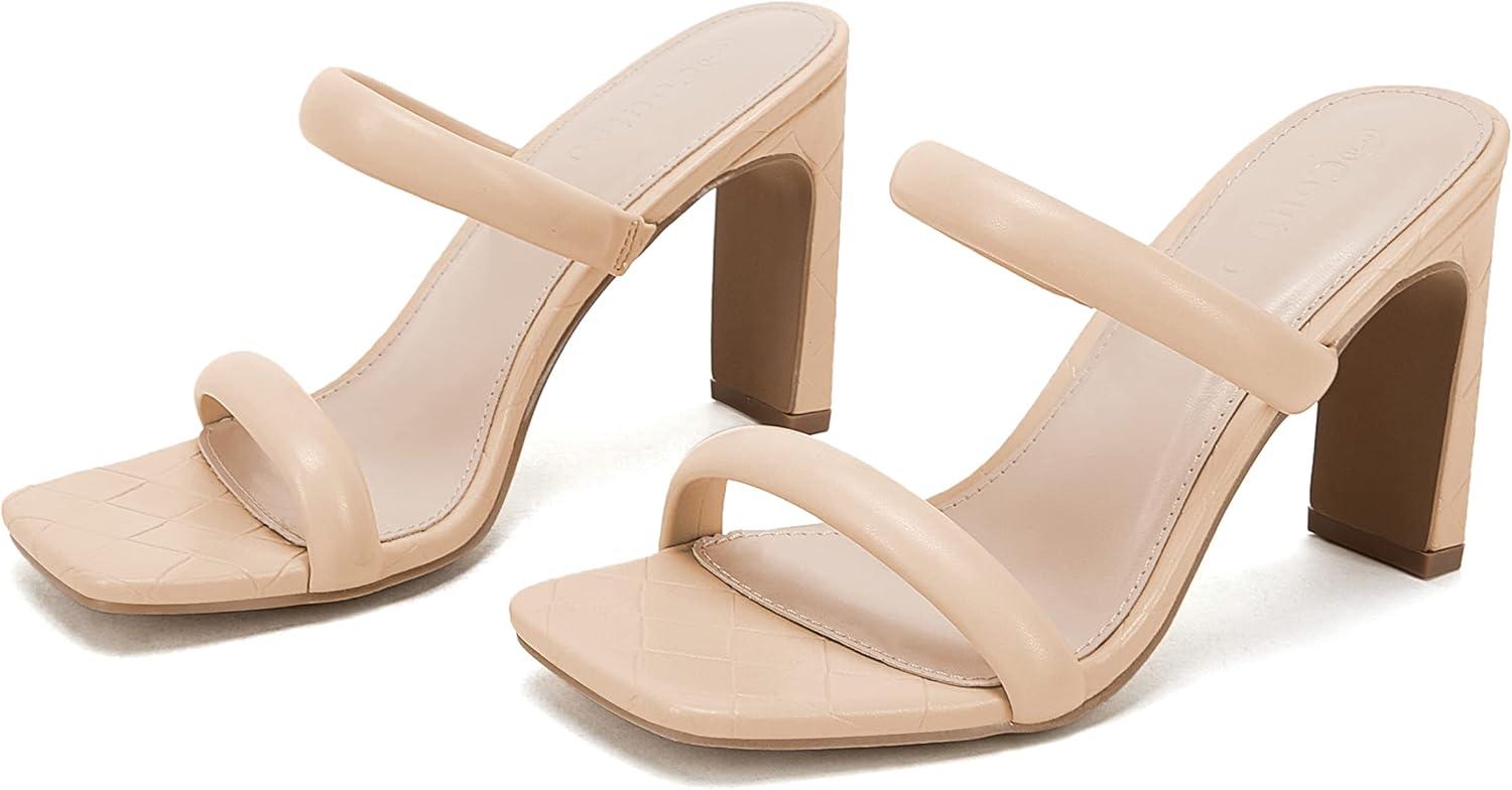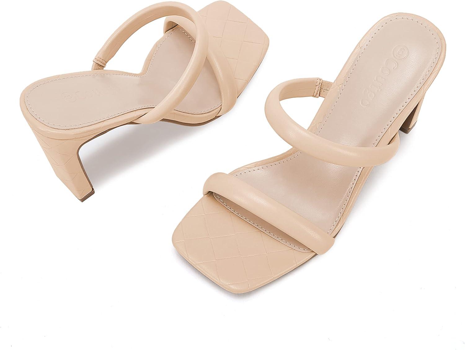Coutgo Womens Square Open Toe Heeled Sandals Two Strap High Heel Backless Dress Slip On Mules(Light Khaki)