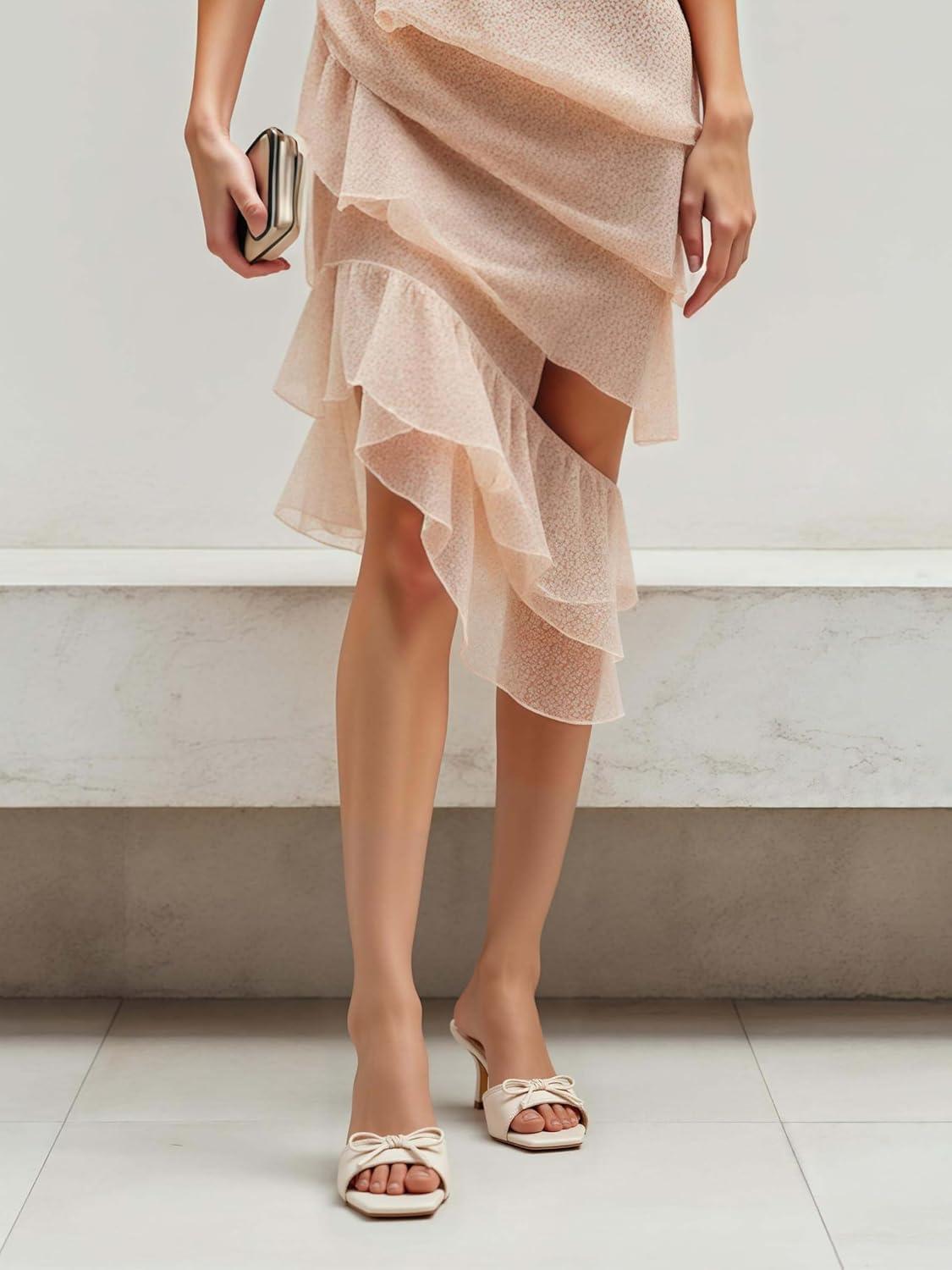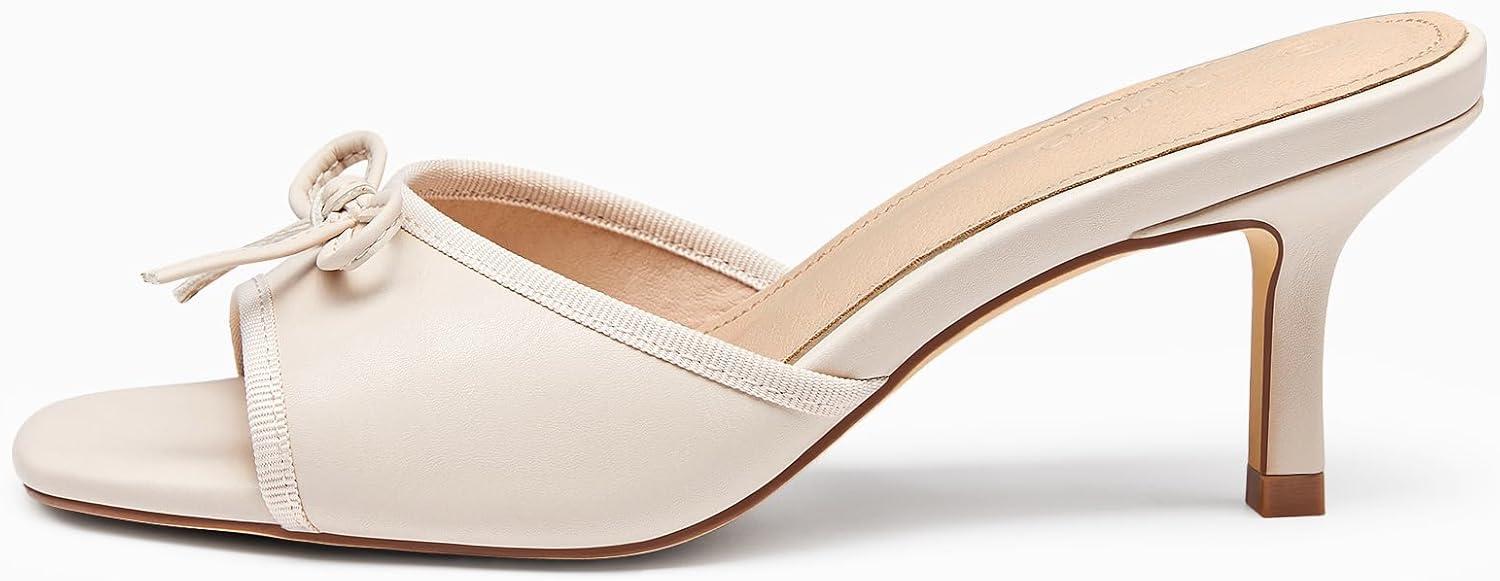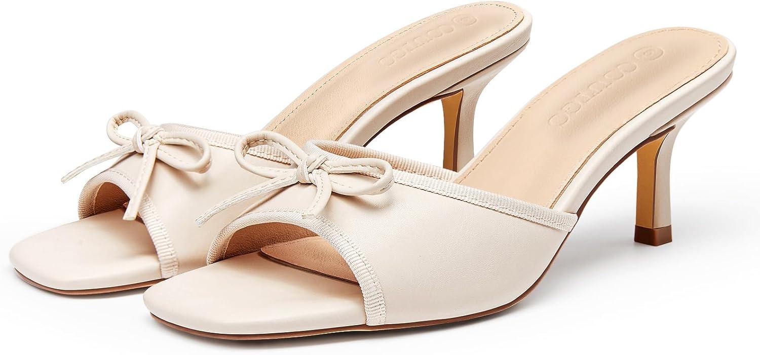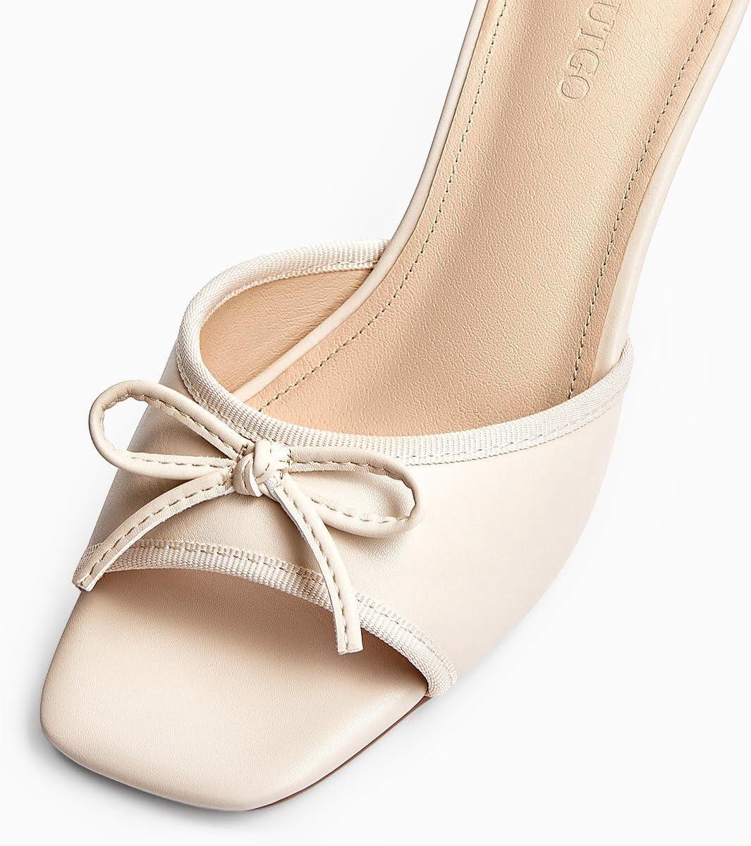Coutgo Womens Square Open Toe Heels Mules Bow Stiletto Heel Backless Slip On Slide Sandals(Beige Grey)