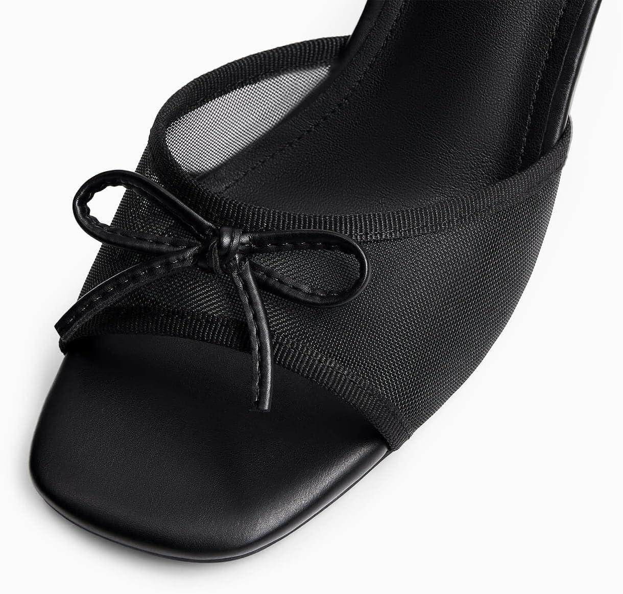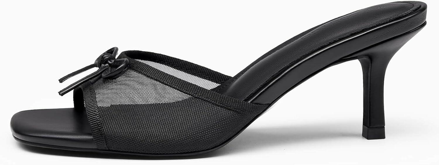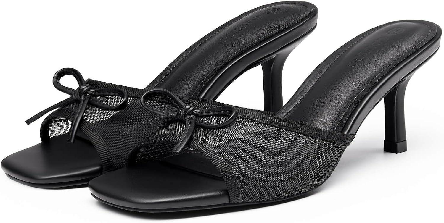Coutgo Womens Square Open Toe Heels Mules Bow Stiletto Heel Backless Slip On Slide Sandals(Pure Black)