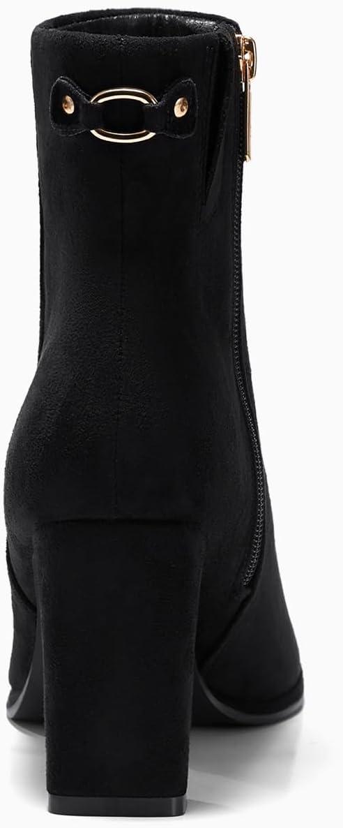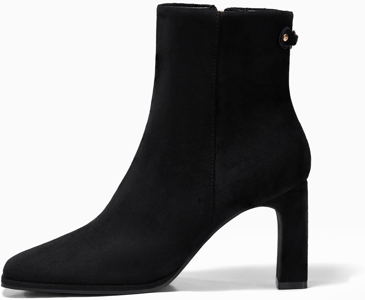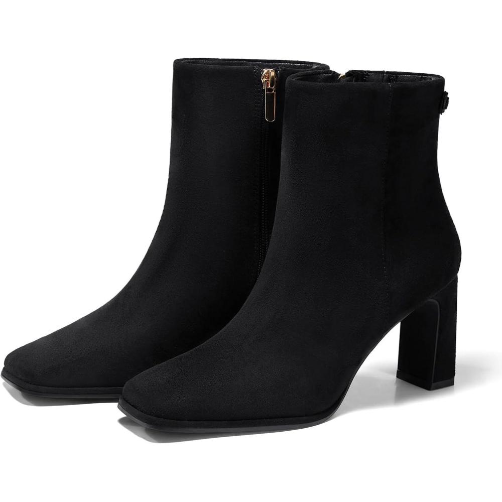 Coutgo Women’s Square Toe Ankle Boots Chunky Block Heel Side Zipper Booties Faux Suede Winter Shoes(Black)