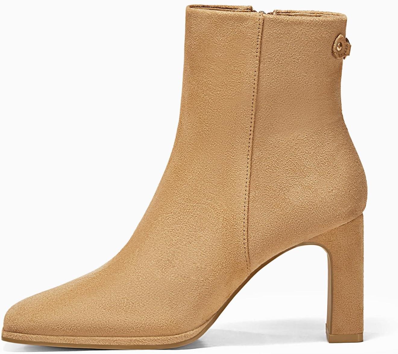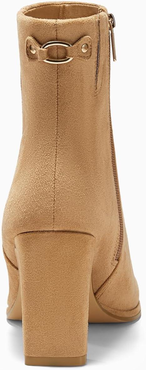 Coutgo Women’s Square Toe Ankle Boots Chunky Block Heel Side Zipper Booties Faux Suede Winter Shoes(Light Brown)