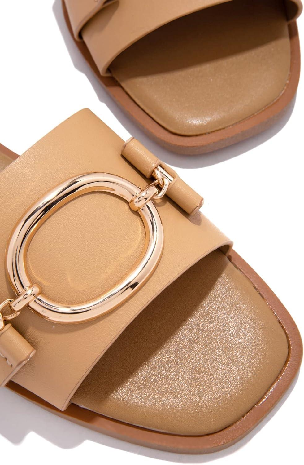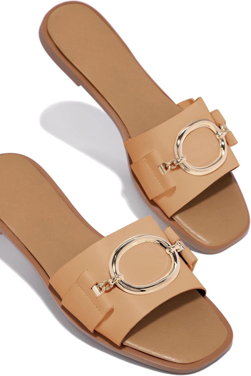 Coutgo Womens Square Toe Dressy Summer Slide Sandals Flat Low Heel Big Metal Chain Slip On Party Slippers Shoes(Khaki)