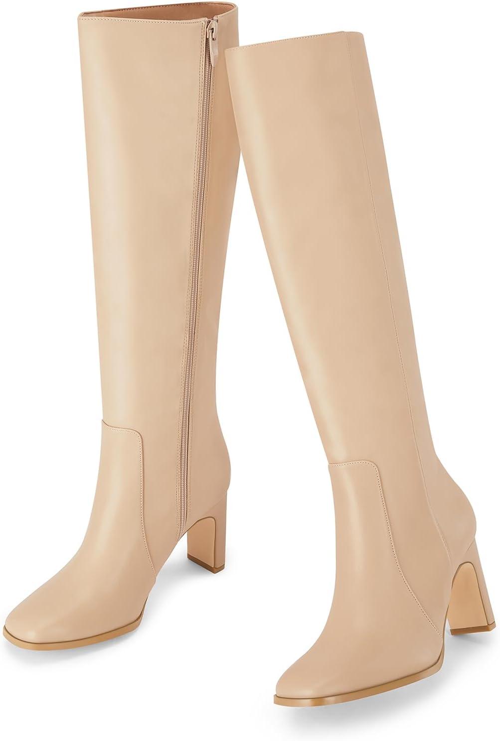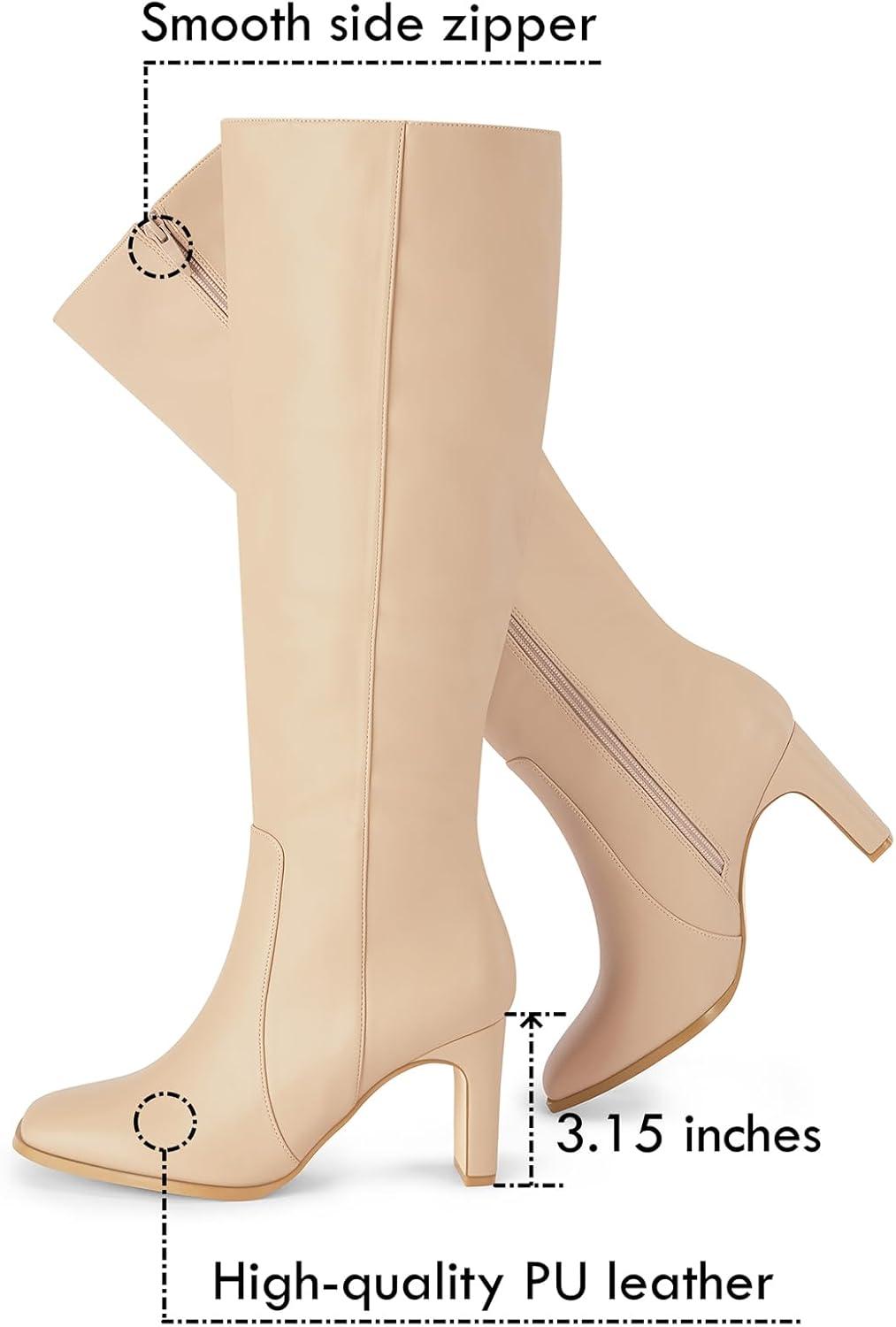 Coutgo Womens Square Toe Knee High Boots Leather Chunky Heel Fashion Dressy Winter Shoes with Side Zipper(Khaki)