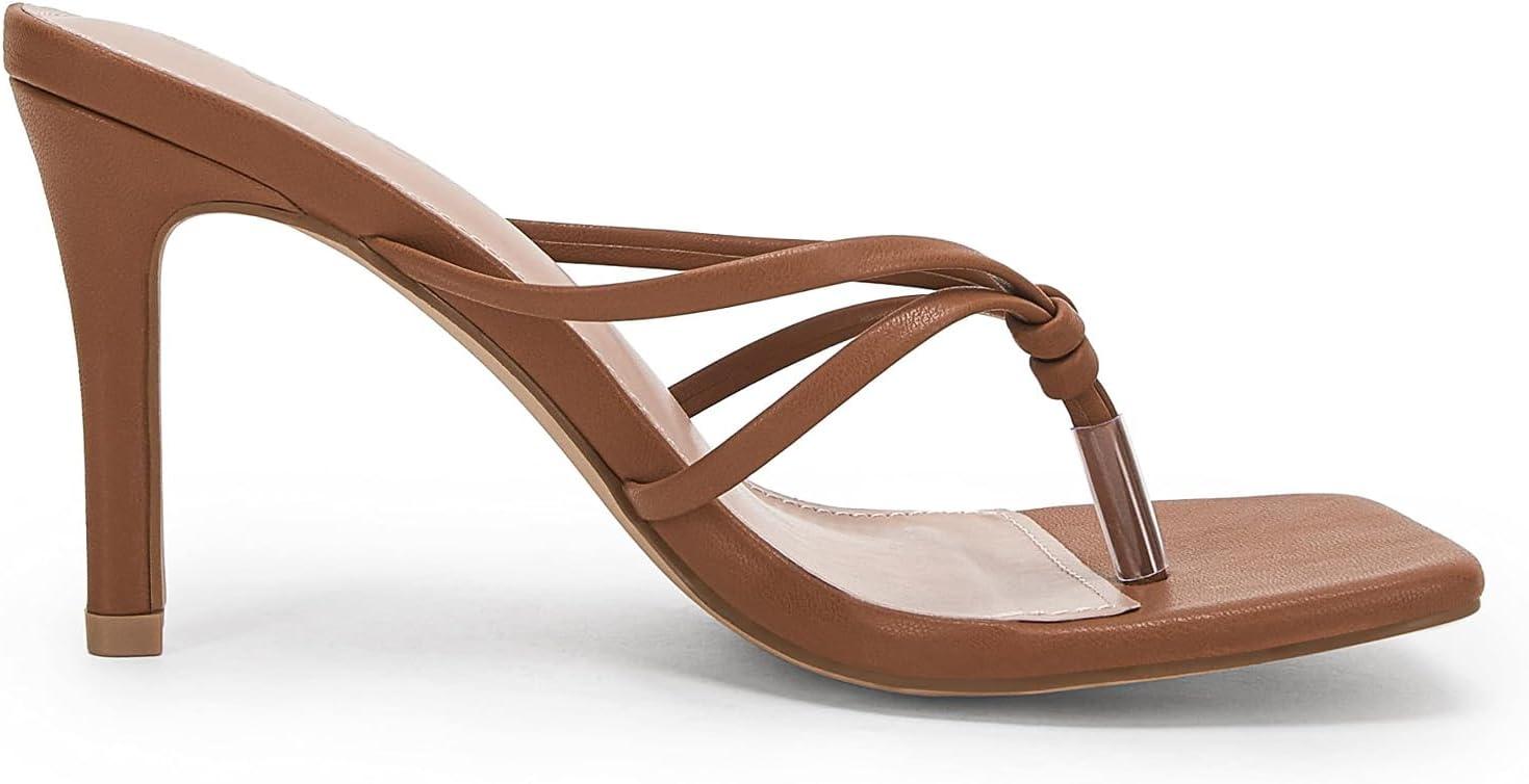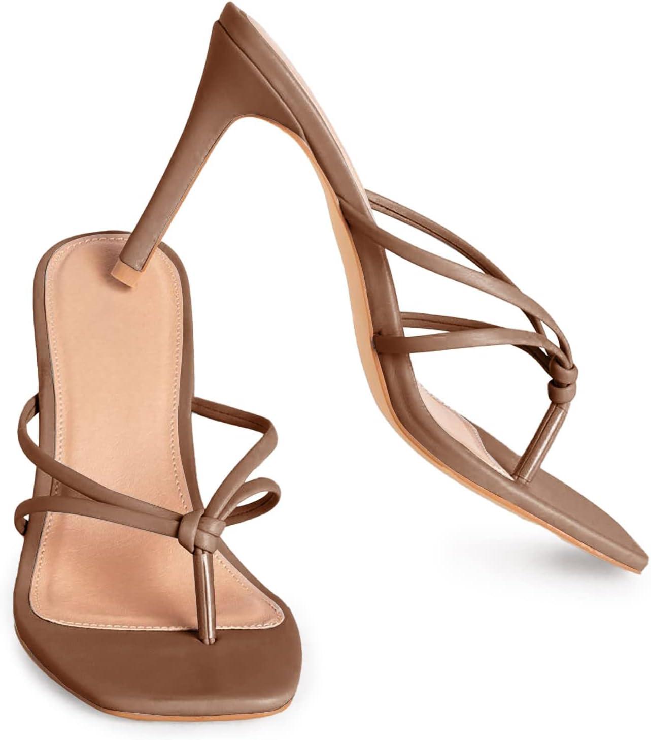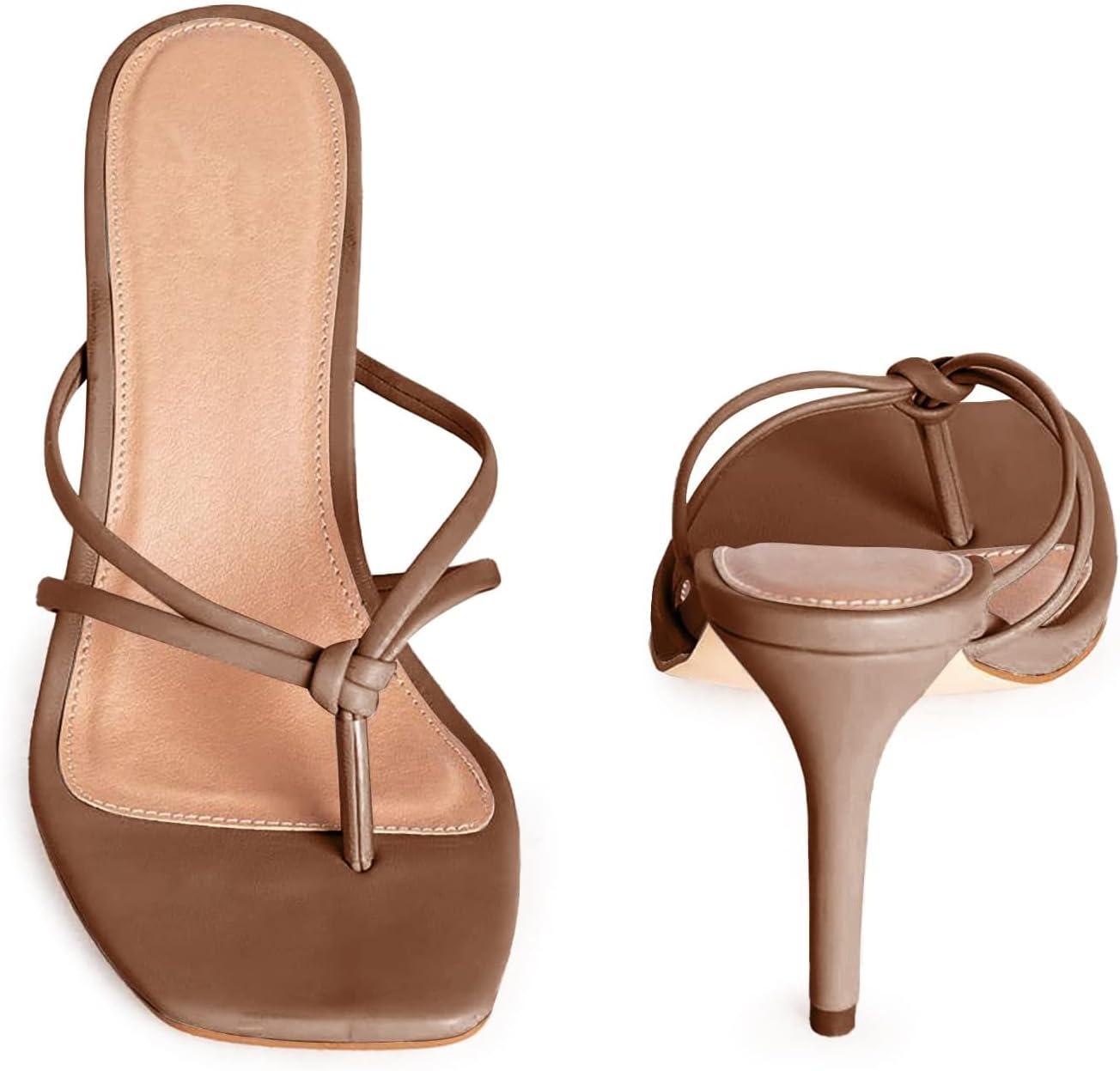 Coutgo Womens Strappy Heeded Sandals Square Toe Flip Flops Fashion Stiletto Thong Slip On Sandals(Brown)