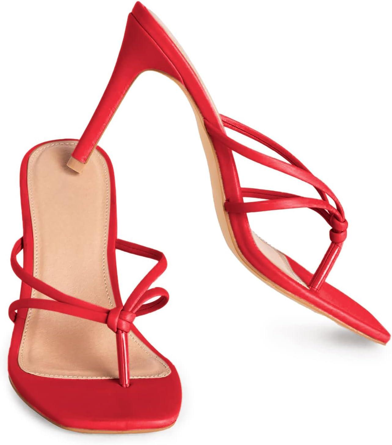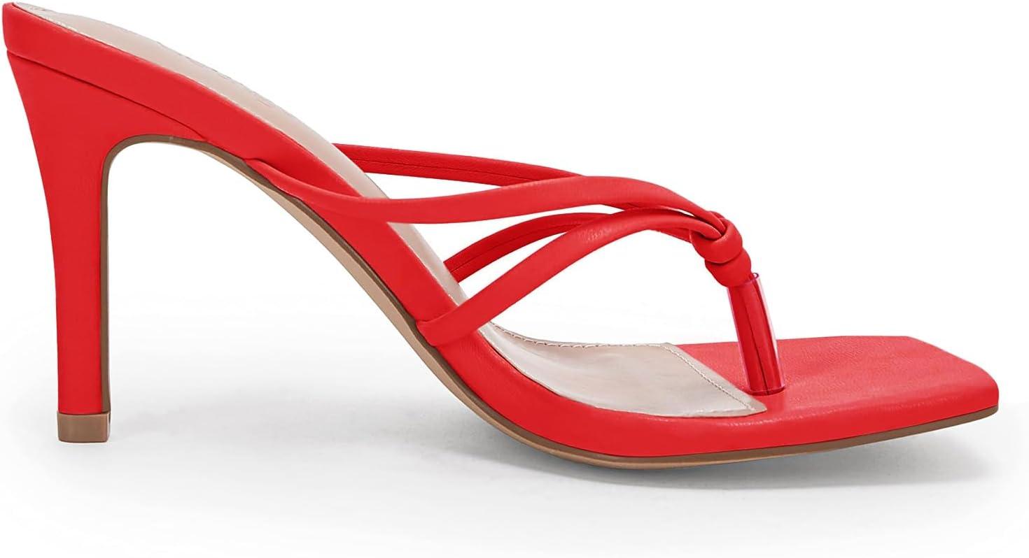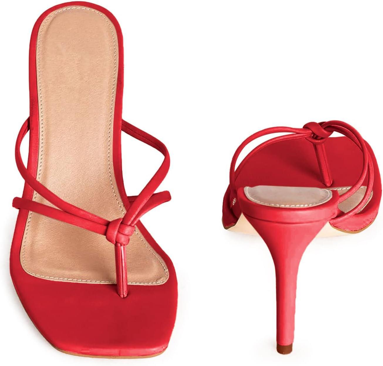 Coutgo Womens Strappy Heeded Sandals Square Toe Flip Flops Fashion Stiletto Thong Slip On Sandals(Red)