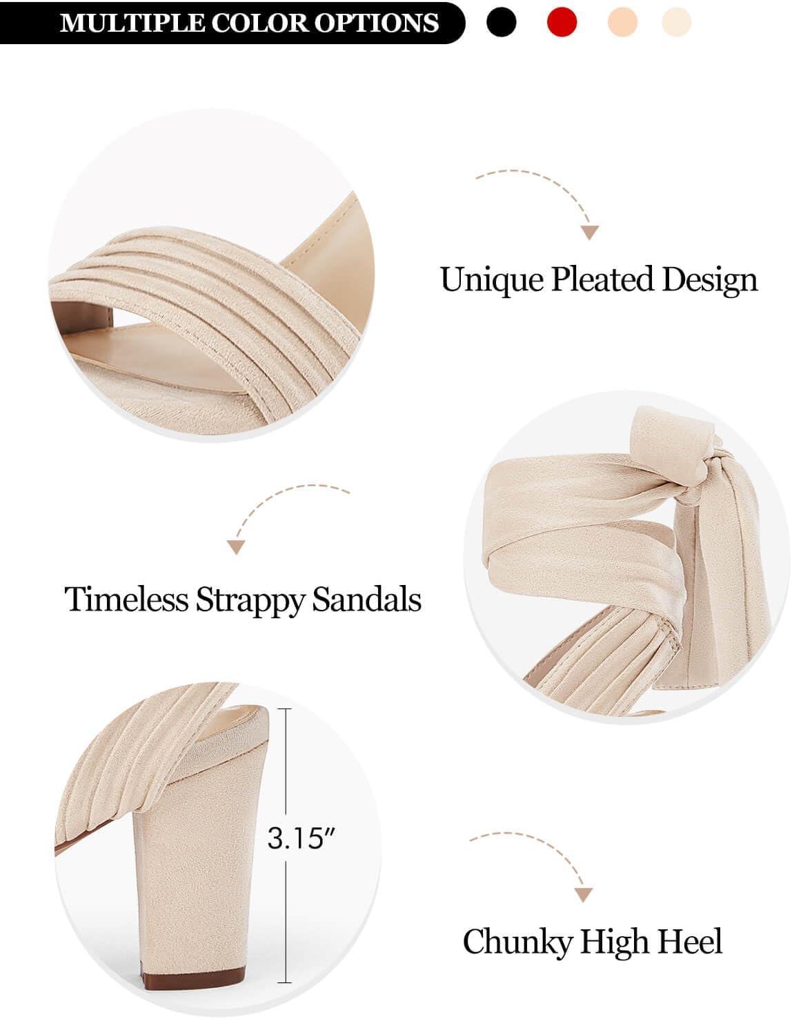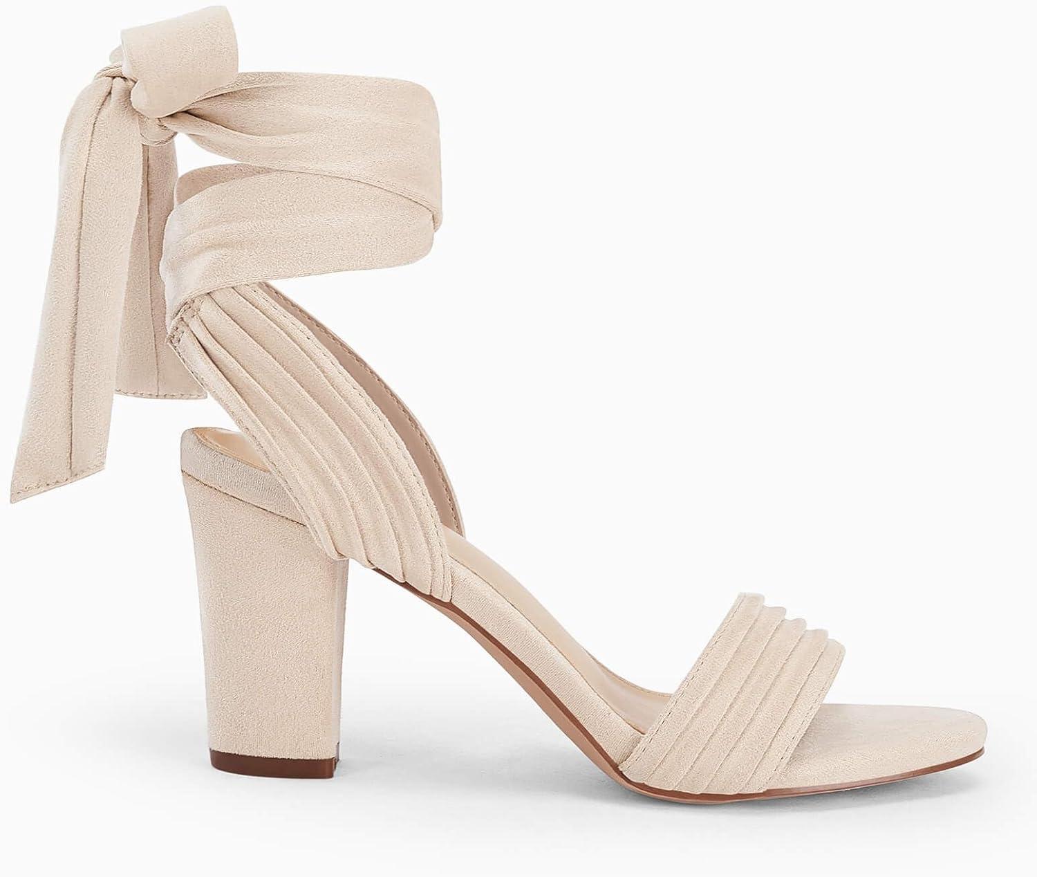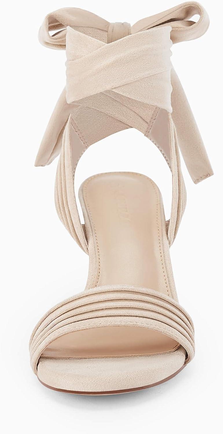 Coutgo Womens Strappy High Heels Chunky Heeled Sandals Bow Tie Lace Up Open Toe Pumps Dress Wedding Comfortable Shoes(Beige)
